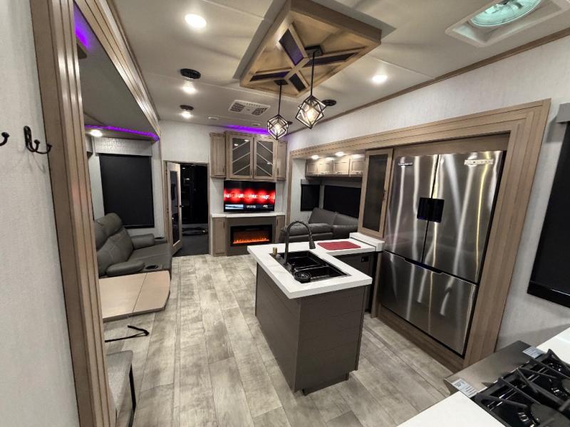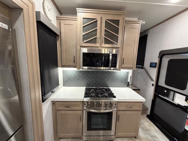 With any Momentum M-Class toy hauler by Grand Design, you will enjoy luxury at every turn! They have been constructed to a superior standard with a thermal roof design, triple insulated main floor and garage floor, and a Rail-Tite underbelly seal that will allow you to camp in all elements. Each model also features an 8' 5" wide body chassis with a wide rail design, no wheel wheels, and a dovetail entry for easier loading. The Stealth A/C system provides maximum cooling power, and the CRE3000 suspension system means you can enjoy a smooth tow each time. You will love the luxurious interior with a professional grade stainless steel cooktop, interior color changing LED accent lighting, a fiberglass shower with a glass door, and solid surface countertops.