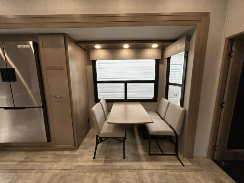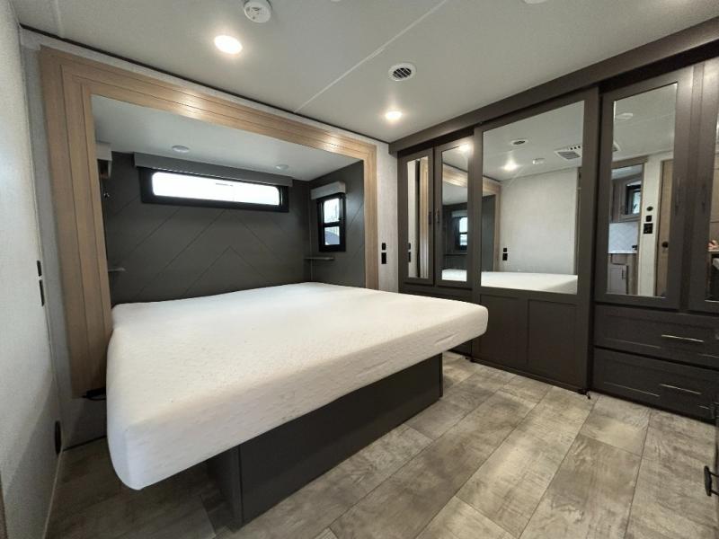 Any time spent in this spacious toy hauler will be time well spent! The 14' garage includes an overhead loft bed and a flip-up pet dish for your furry friends. If you're needing more sleeping space, you might want to choose the optional Happi-Jac rollover sofas and table with a drop down bed and optional half bath! Once you enter in the main living area, you can relax on the tri-fold sofa or theater seating across from the fireplace, and there is a free-standing dinette if you want to play a game or two. The chef of your group will love the generous counter space in the kitchen, and the dual entry bath will let everyone stay clean throughout your trip! Head to the front master bedroom to enjoy the queen bed slide out with an optional king bed, a slide top dresser with TV prep, plus a large front closet, complete with washer and dryer prep!