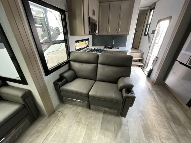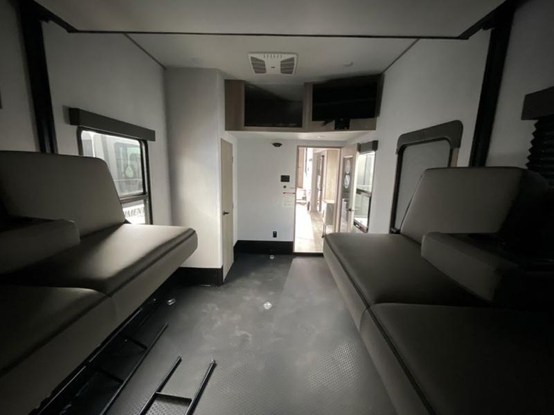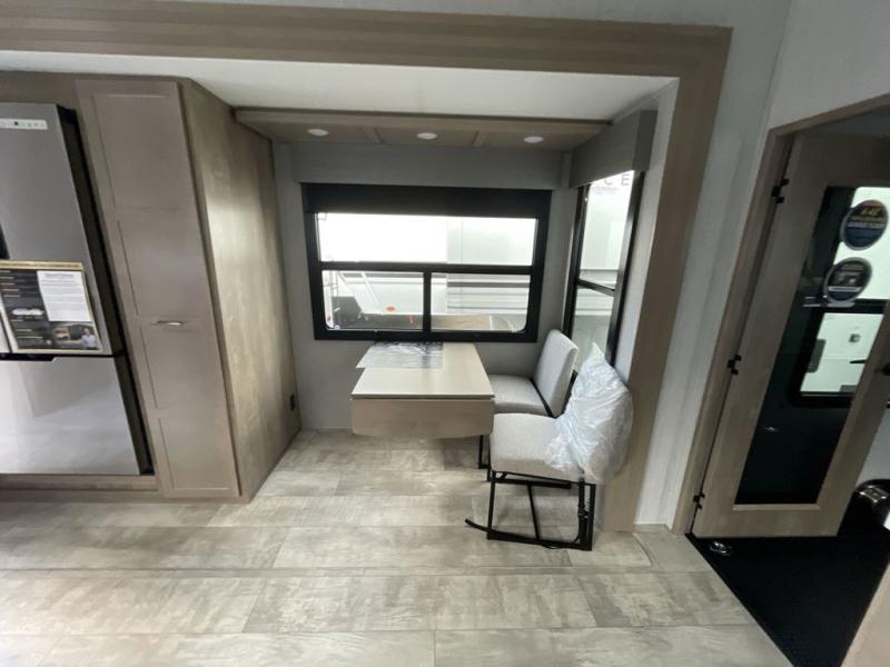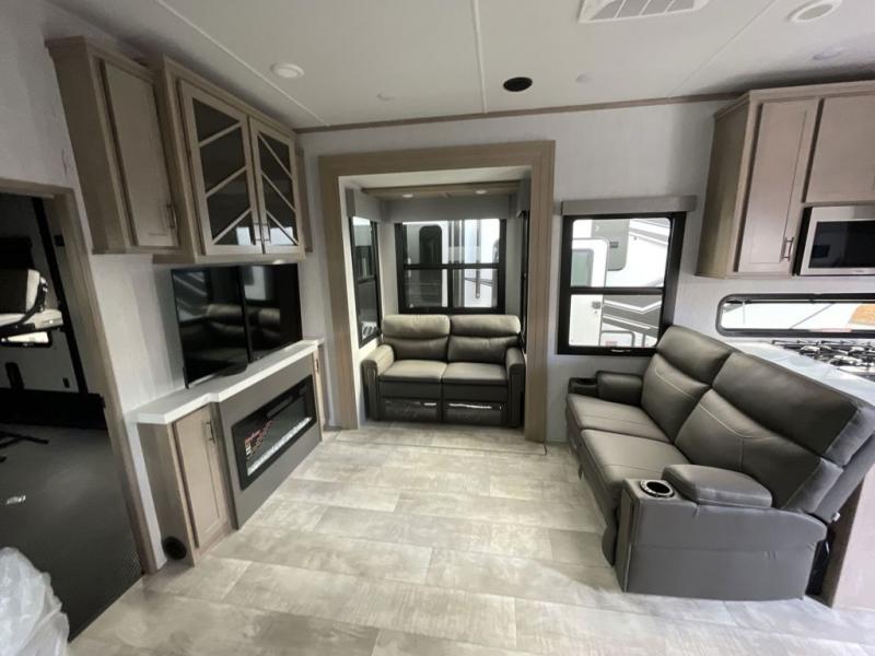 Inside, the main living area is built for relaxation and entertainment. Theater seating and a tri-fold sofa face the fireplace, while a free-standing dinette offers the perfect spot for meals or games. The U-shaped kitchen with ample counter space and a pantry makes meal prep a breeze, whether it’s a quick breakfast or a full dinner for your group.
