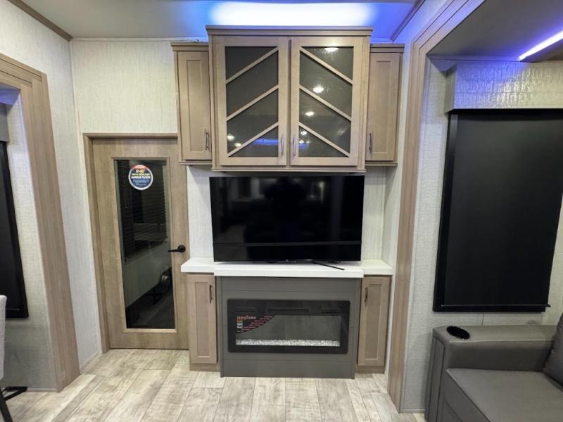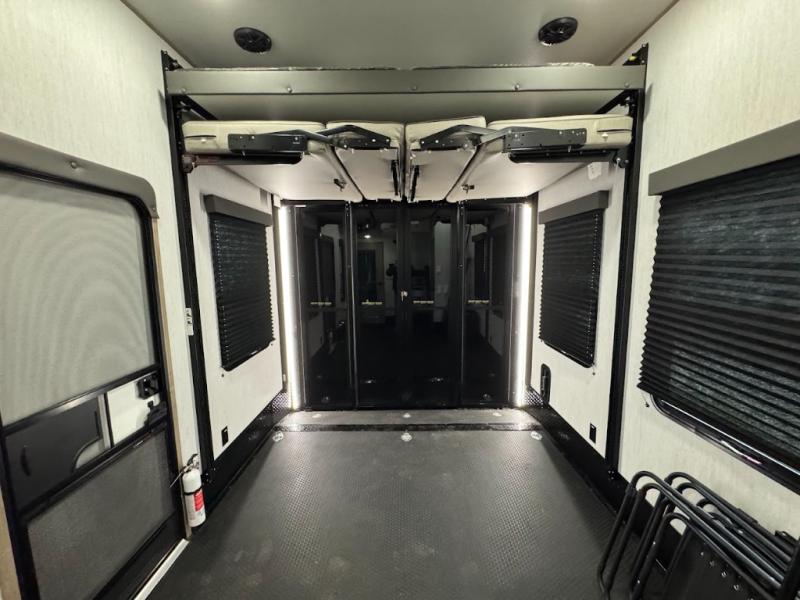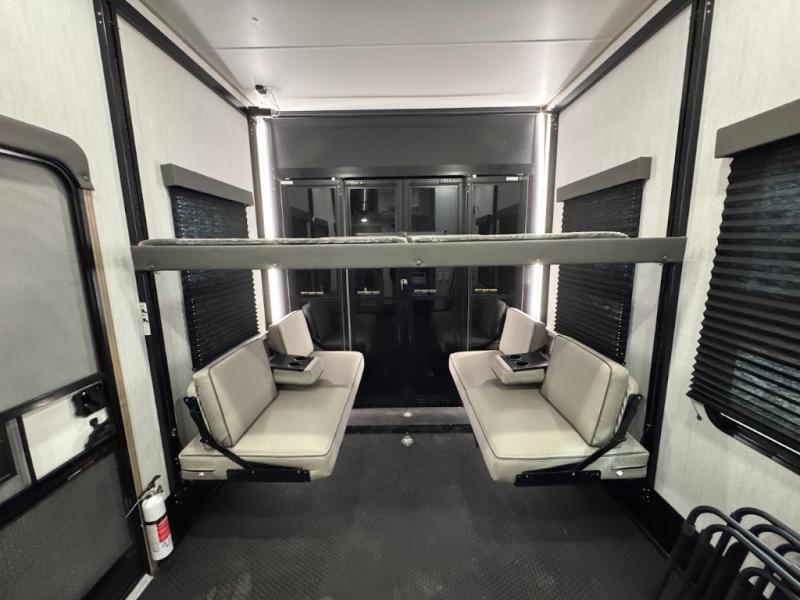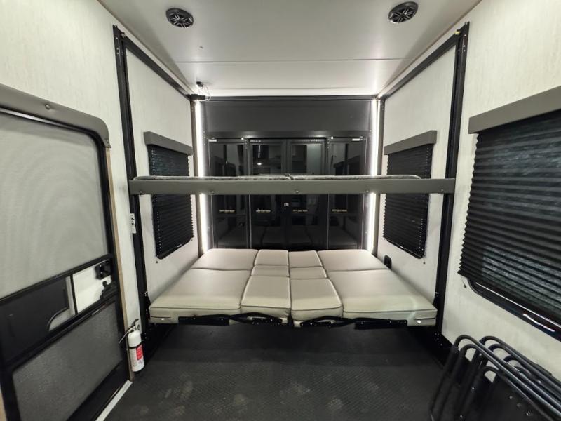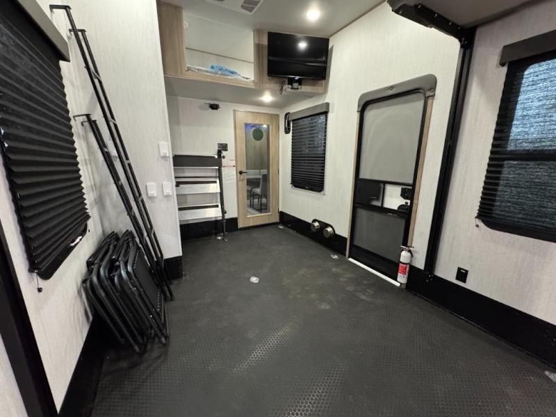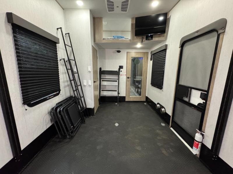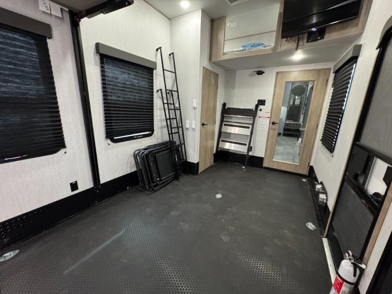 Any time spent in this spacious toy hauler will be time well spent! The 14' garage includes an overhead loft bed and a flip-up pet dish for your furry friends. If you're needing more sleeping space, you might want to choose the optional Happi-Jac rollover sofas and table with a drop down bed and optional half bath! Once you enter in the main living area, you can relax on the tri-fold sofa or theater seating across from the fireplace, and there is a free-standing dinette if you want to play a game or two. The chef of your group will love the generous counter space in the kitchen, and the dual entry bath will let everyone stay clean throughout your trip! Head to the front master bedroom to enjoy the queen bed slide out with an optional king bed, a slide top dresser with TV prep, plus a large front closet, complete with washer and dryer prep!
