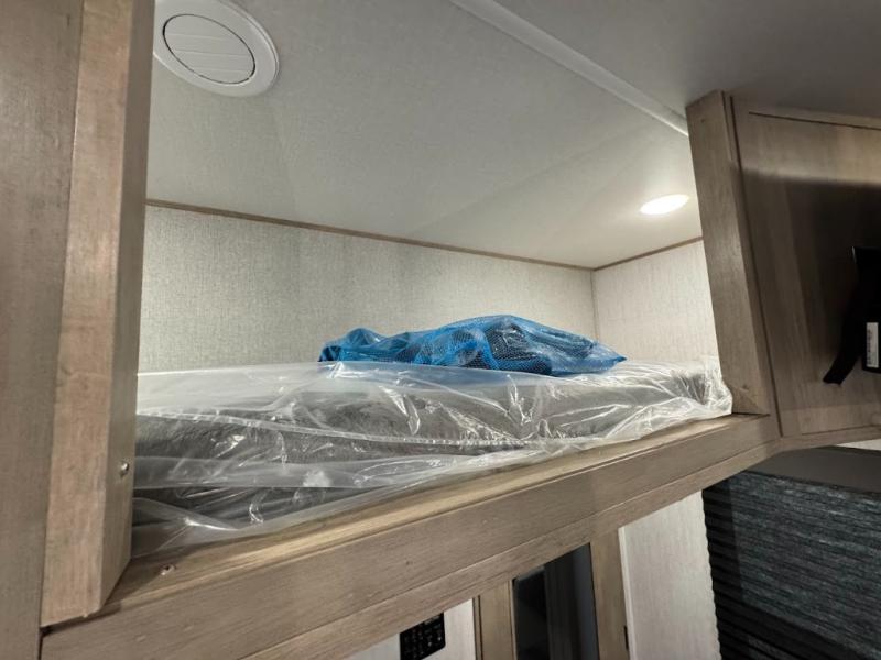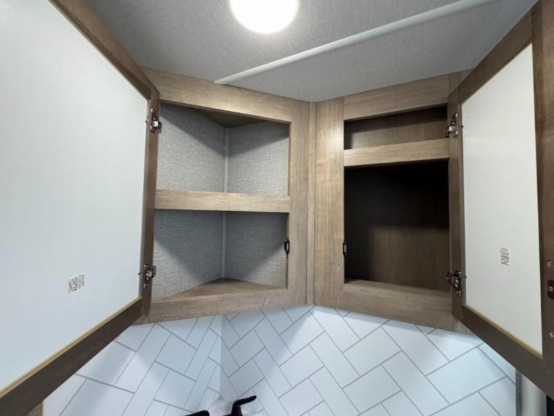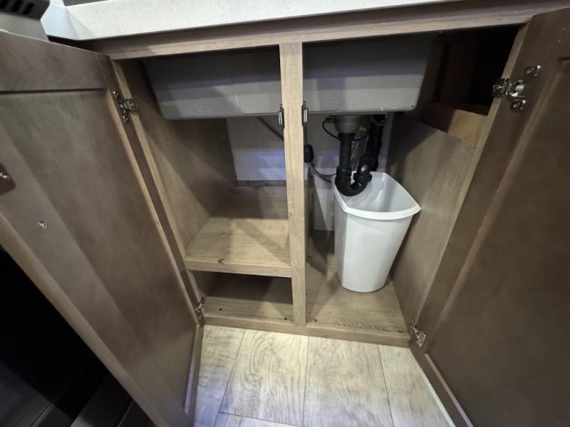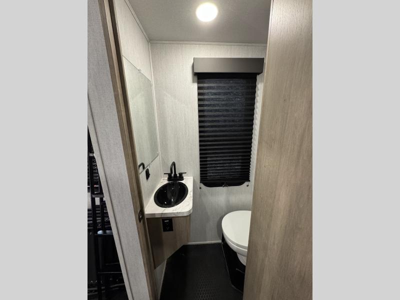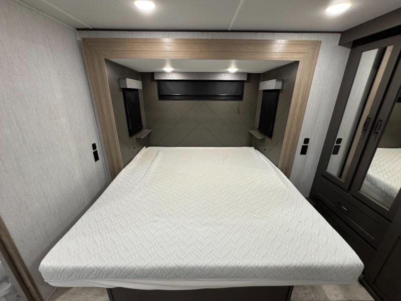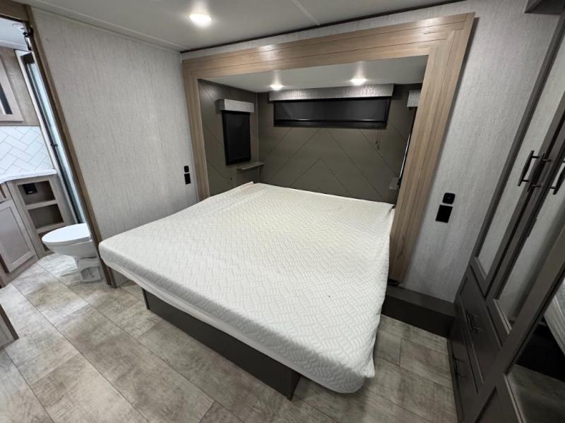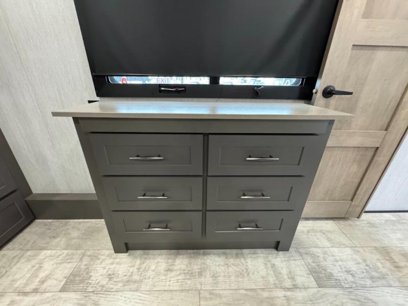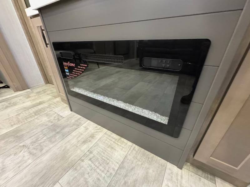 Any time spent in this spacious toy hauler will be time well spent! The 14' garage includes an overhead loft bed and a flip-up pet dish for your furry friends. If you're needing more sleeping space, you might want to choose the optional Happi-Jac rollover sofas and table with a drop down bed and optional half bath! Once you enter in the main living area, you can relax on the tri-fold sofa or theater seating across from the fireplace, and there is a free-standing dinette if you want to play a game or two. The chef of your group will love the generous counter space in the kitchen, and the dual entry bath will let everyone stay clean throughout your trip! Head to the front master bedroom to enjoy the queen bed slide out with an optional king bed, a slide top dresser with TV prep, plus a large front closet, complete with washer and dryer prep!