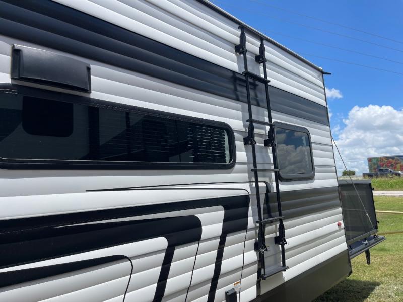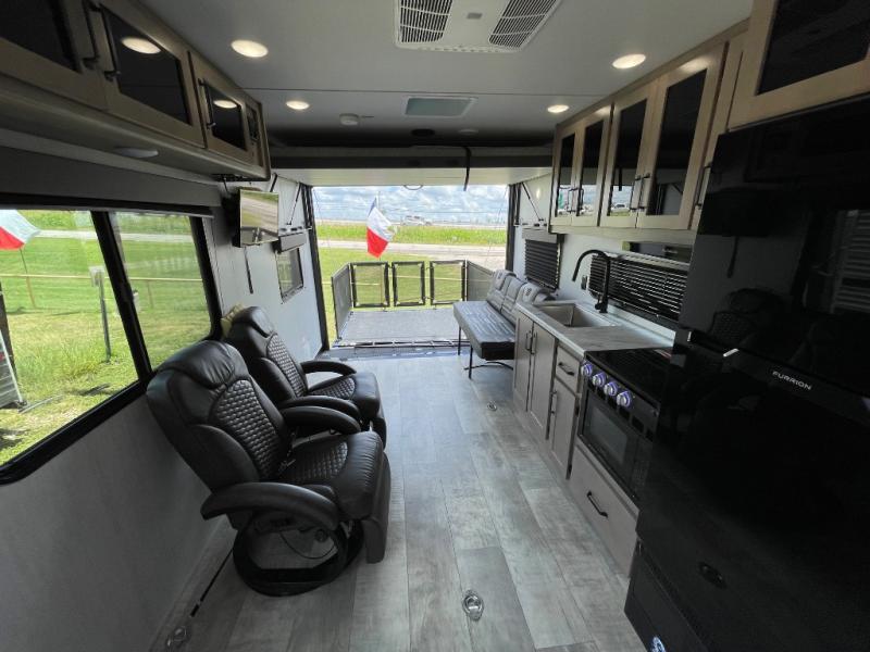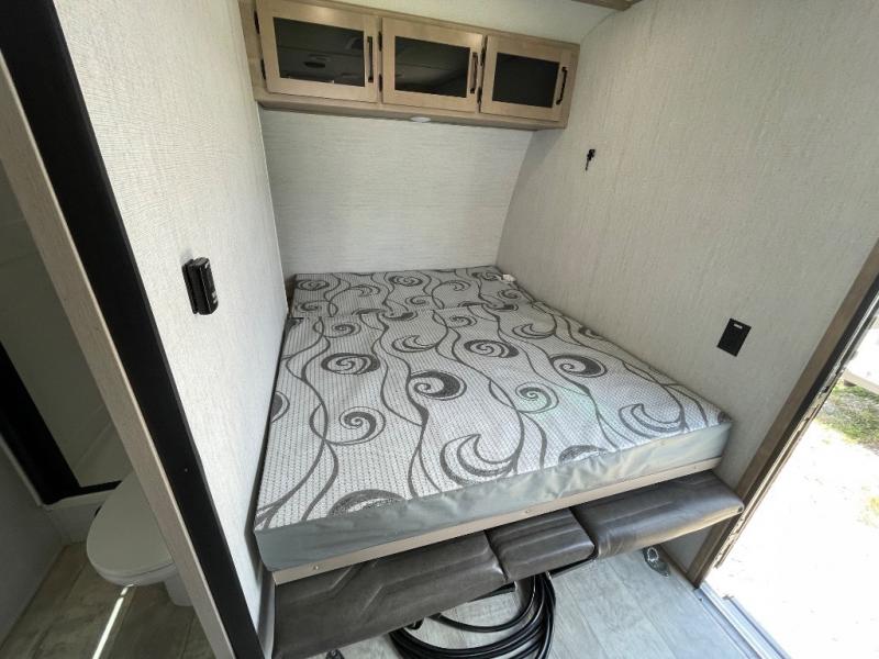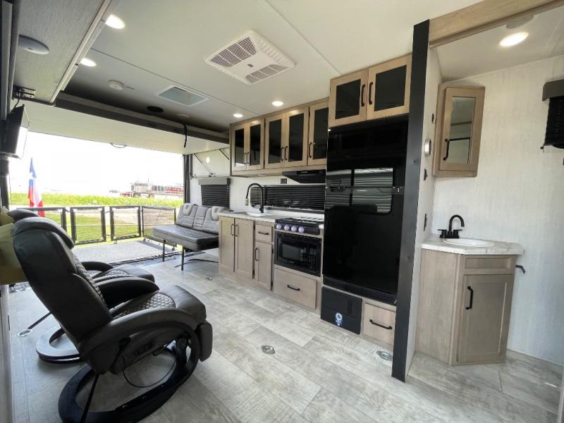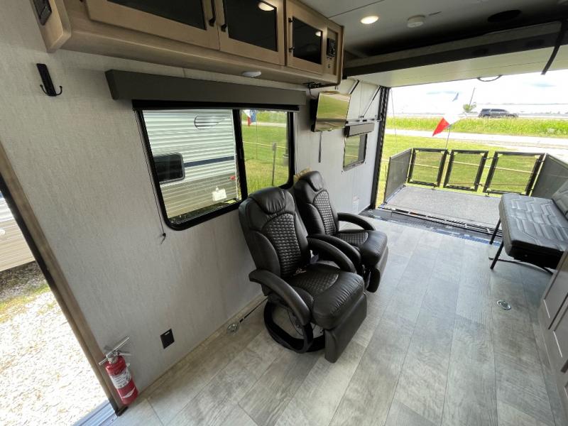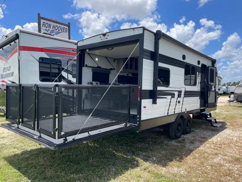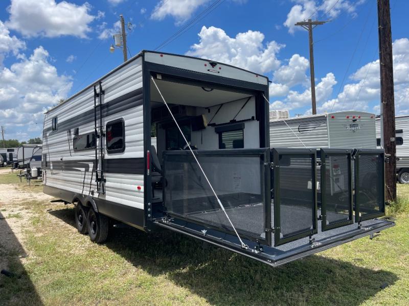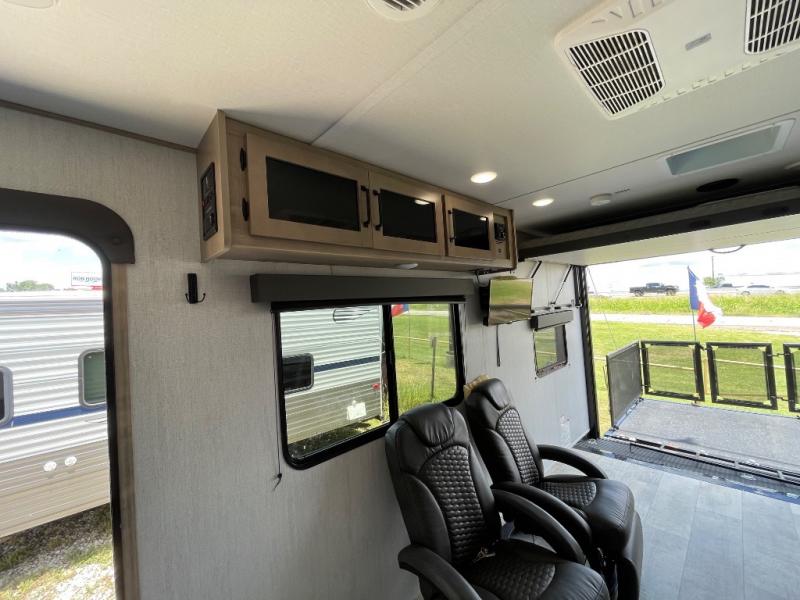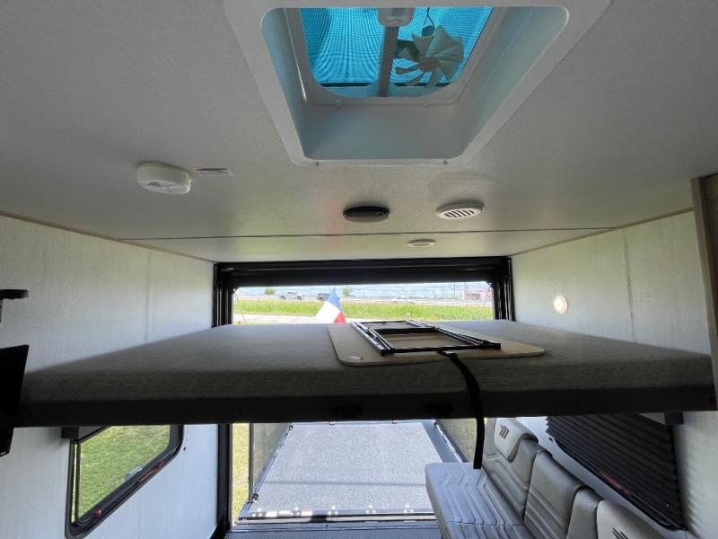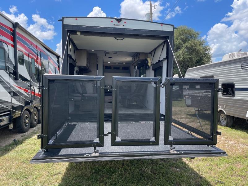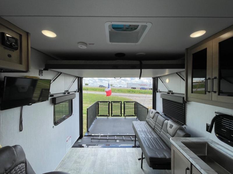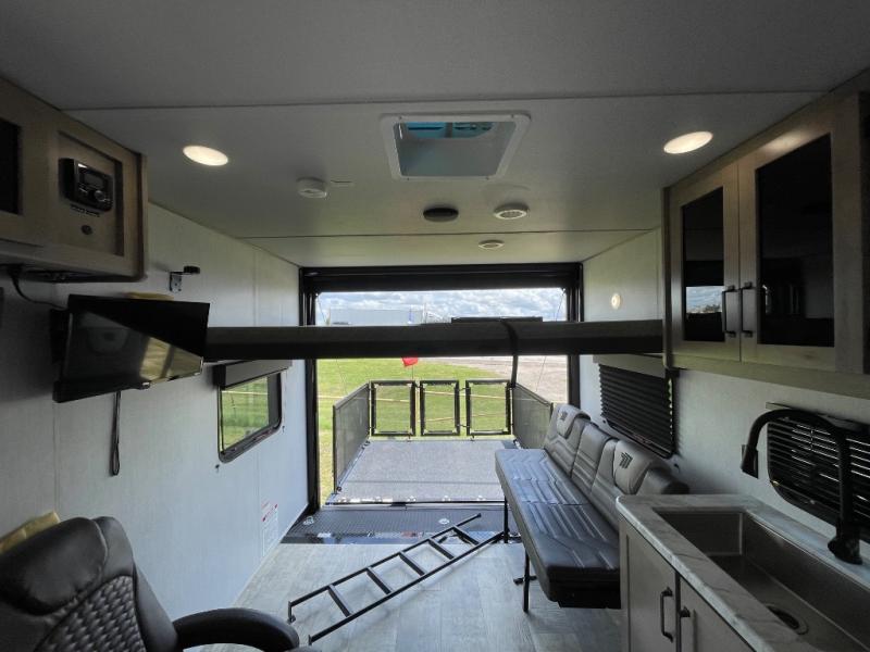 Head for the lake in this toy hauler that can sleep five campers each night. Your crew can relax on the rollover sofa with a table, and the top bed will be perfect for your guests to sleep on. The front corner queen Murphy bed includes drawers to store clothes, plus overhead storage for personal belongings. In the morning, you can prepare breakfast on the three burner range with an oven, pour yourself milk from the 12V 8 cu. ft. refrigerator, then relax on the dual Euro chairs. This model also includes a patio with a pull down screen to let fresh air in without letting the bugs in!