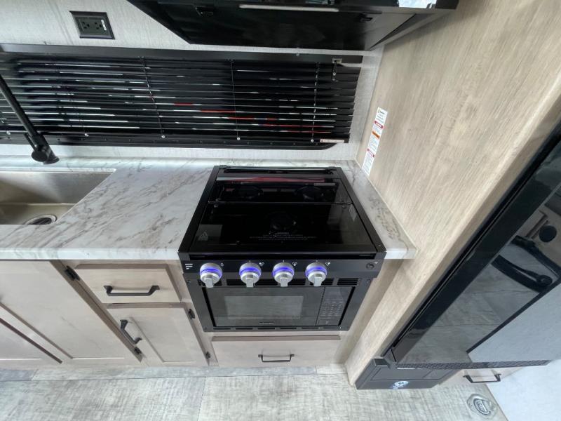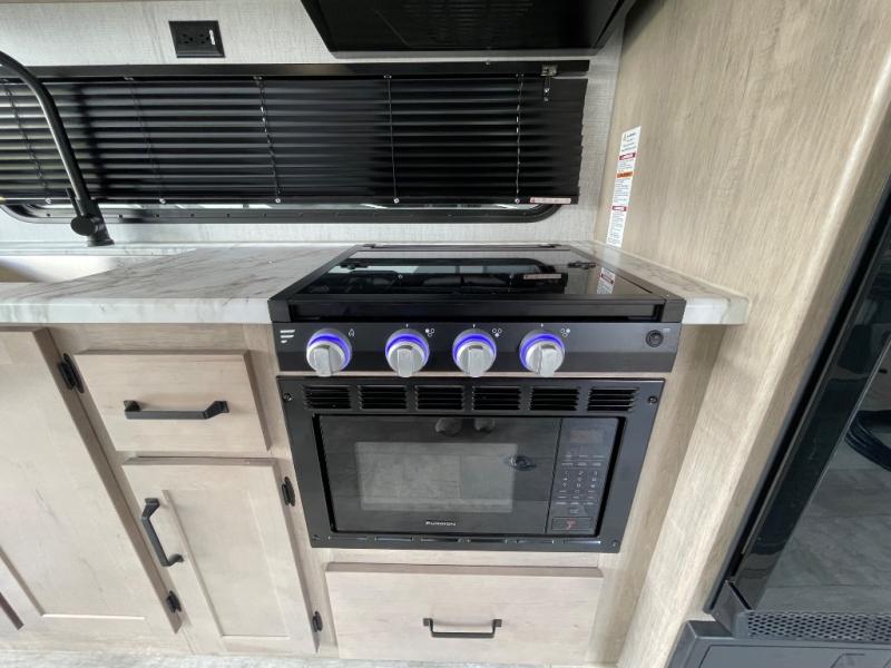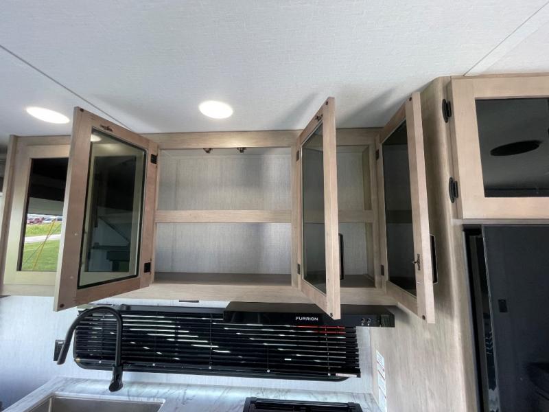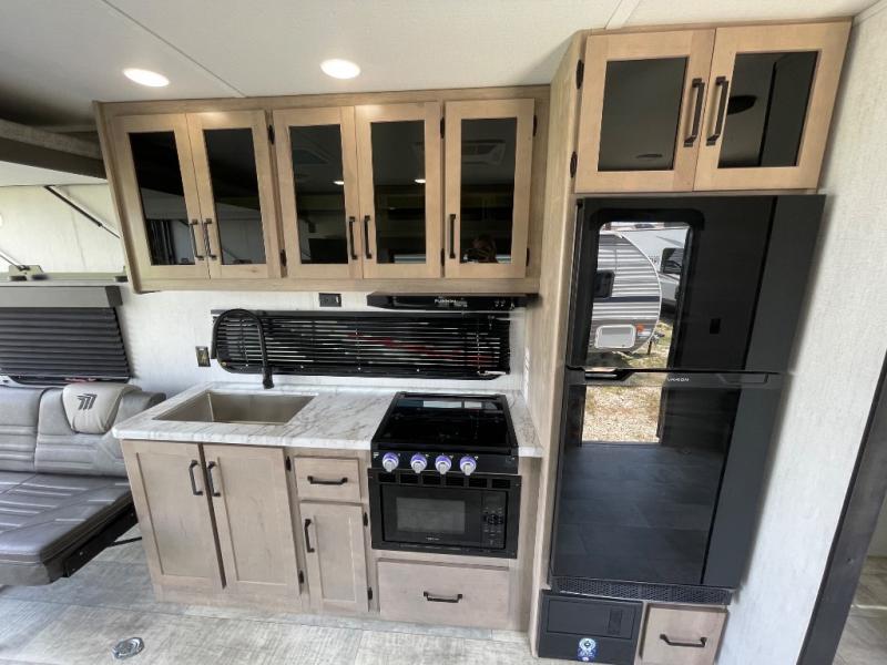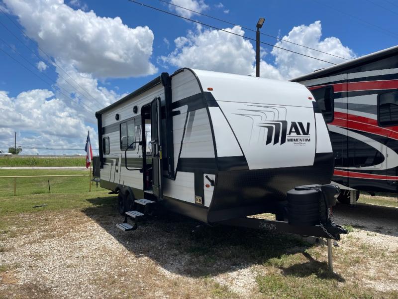 The Momentum MAV toy hauler travel trailers by Grand Design are designed to provide exactly what you need. The spacious garage provides tons of cargo space, with no wheel wells to get in the way. Additional storage includes magnetic storage door catches, underbed storage with a gas strut lift, and overhead consoles throughout. Conveniences like motion sensor lights and USB outlets will make your life easier, and you will be comfortable in all seasons with the 30K BTU furnace plus 15K BTU ducted air conditioning. The standard Solar Package comes with a 180W solar panel, a 40 Amp charge controller with Bluetooth, and a 12V refrigerator so you can go off-grid when the adventure calls for it.