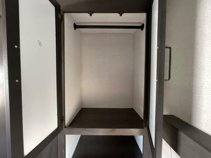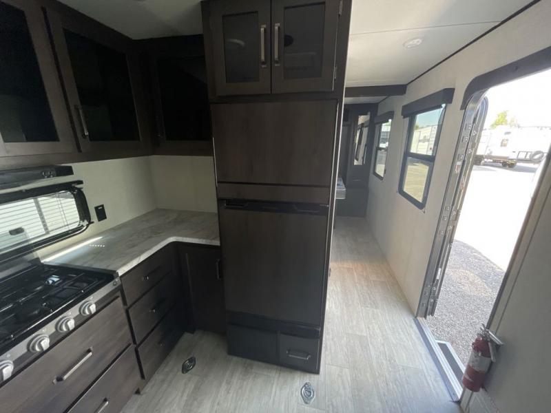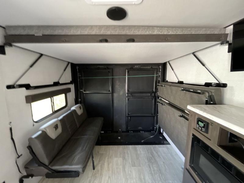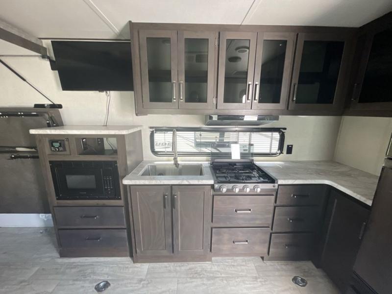 You will love this Momentum MAV toy hauler travel trailer! The front bedroom features a queen bed, and there is plenty of room to walk around. The sliding solid bedroom door helps with space. Overhead storage and a pair of nightstands are convenient storage, plus there is a wardrobe with both drawers and space to hang items. The kitchen offers a microwave, stainless steel sink, and an 8 cu. ft. 12V refrigerator. In the garage, you'll find rollover sofas with a table and a top bed for guests to sleep on. The ramp door/patio will provide additional living space once your toys are unloaded, and the pull down screen will keep bugs out!