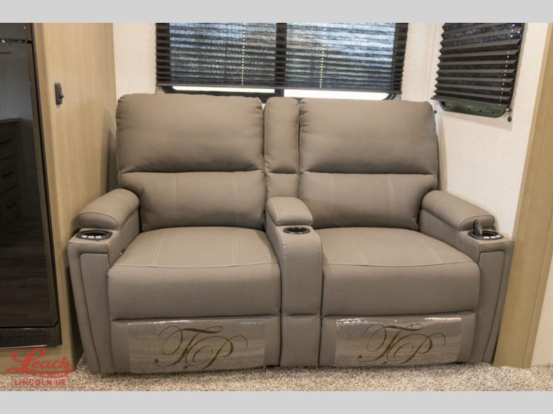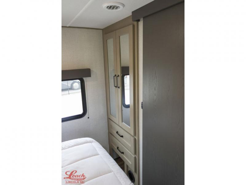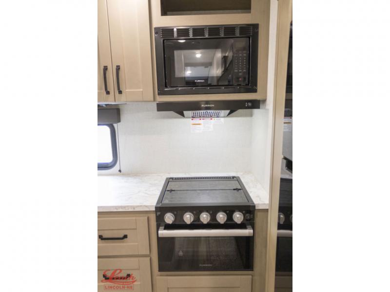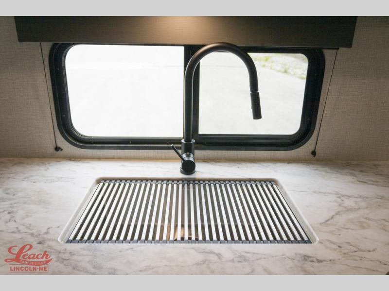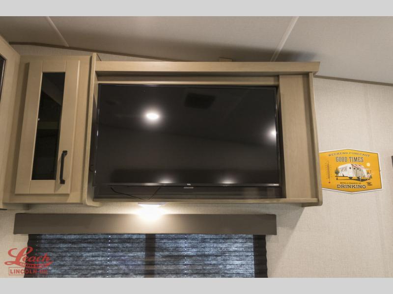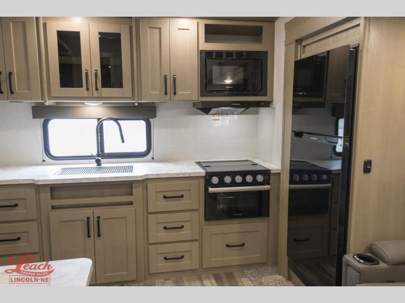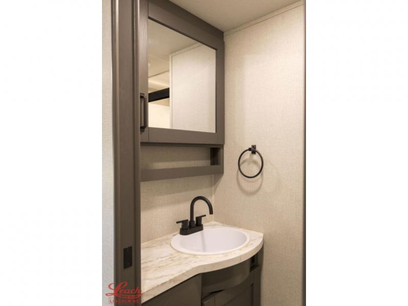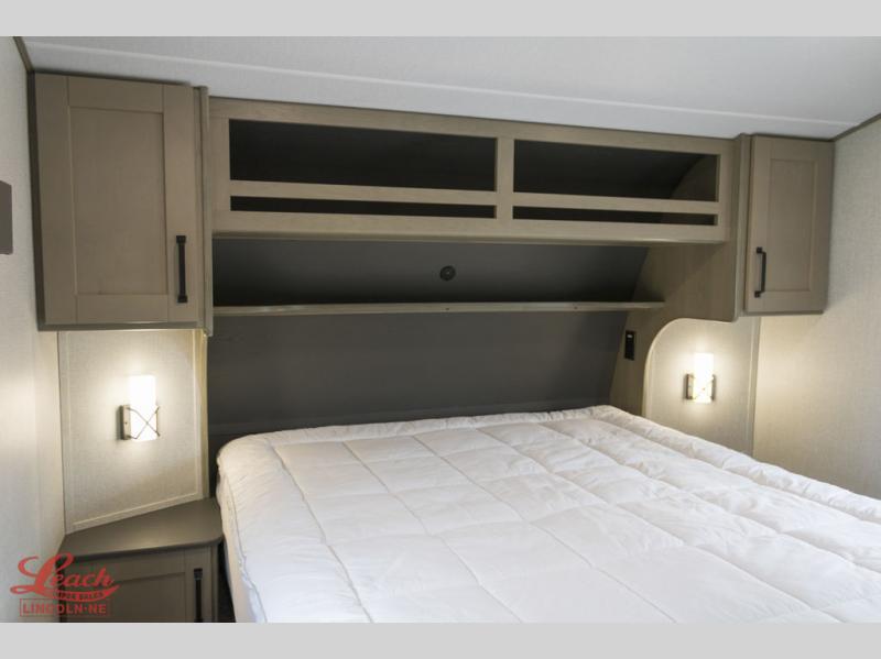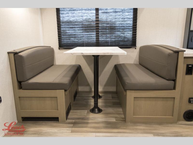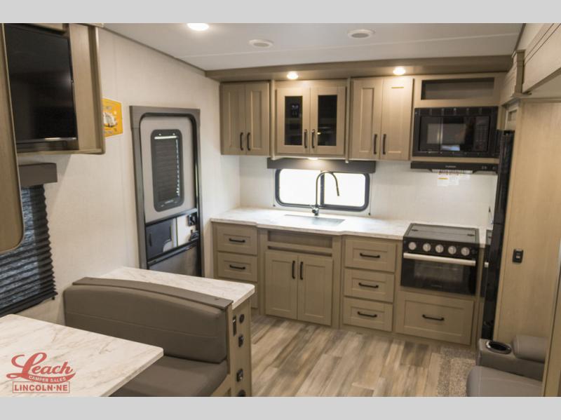 This rear kitchen fifth wheel is sure to meet all of your camping needs! Since the exterior length is only 26' 11", you can easily maneuver in and out of campgrounds. The rear kitchen includes ample counter space to prep meals, a three burner cooktop, and overhead storage for all your necessities. There is a 10 cu. ft. 12V refrigerator within the slide out that also includes the theater seating, and the booth dinette provides a place to dine or play a card game. You will appreciate having convenient storage by the entry door, along with pull-out pet bowls, a functional wardrobe closet in the bedroom and an exterior pass-thru for belongings and camping gear. When you're ready to turn in for the night, the queen bed is sure to bring a great night's rest, while your guests sleep on the booth dinette or optional tri-fold sofa if you replace the theater seating!