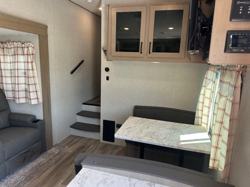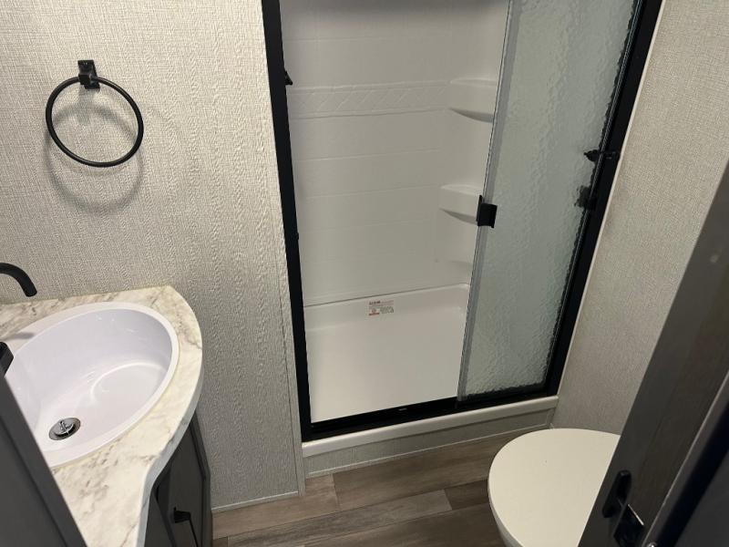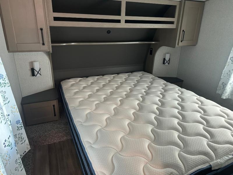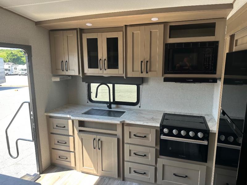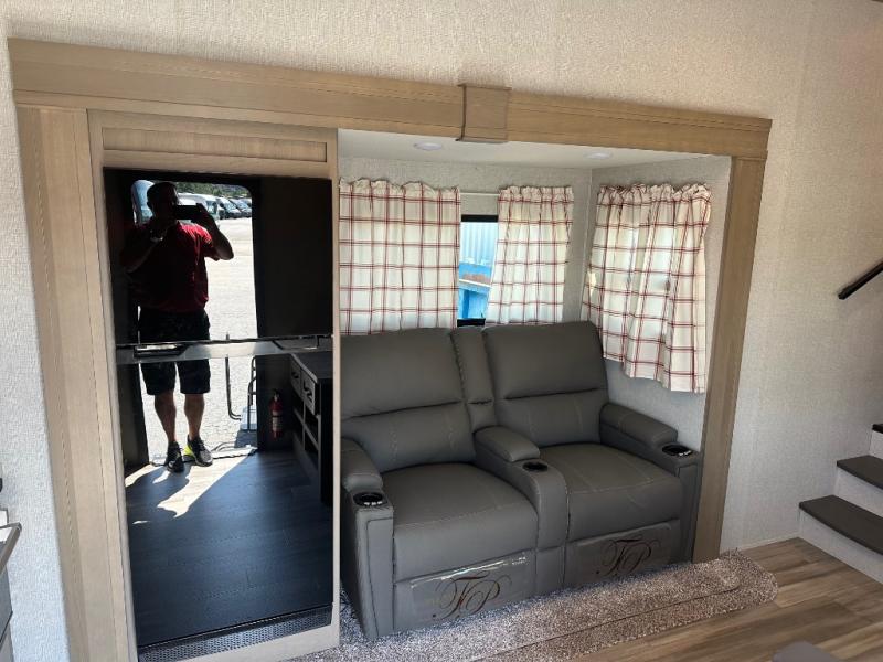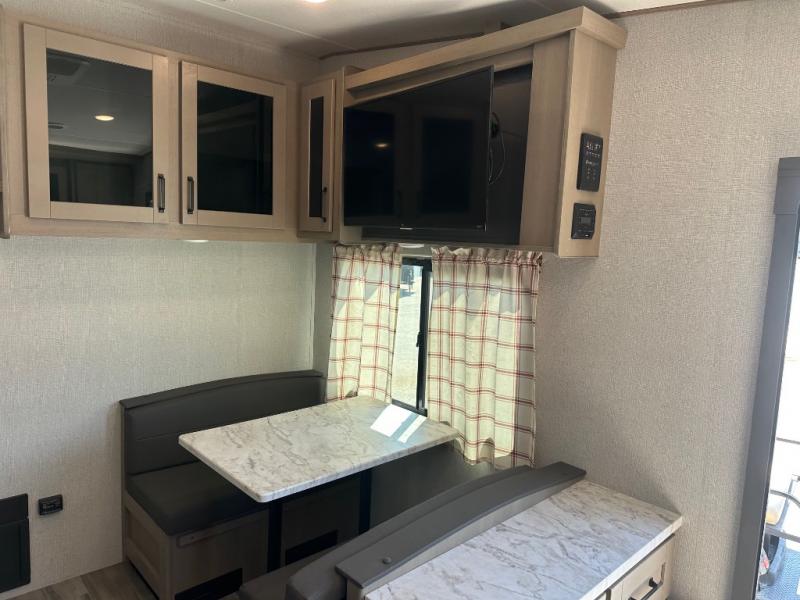 This rear kitchen fifth wheel is sure to meet all of your camping needs! Since the exterior length is only 26' 11", you can easily maneuver in and out of campgrounds. The rear kitchen includes ample counter space to prep meals, a three burner cooktop, and overhead storage for all your necessities. There is a 10 cu. ft. 12V refrigerator within the slide out that also includes the theater seating, and the booth dinette provides a place to dine or play a card game. You will appreciate having convenient storage by the entry door, along with pull-out pet bowls, a functional wardrobe closet in the bedroom and an exterior pass-thru for belongings and camping gear. When you're ready to turn in for the night, the queen bed is sure to bring a great night's rest, while your guests sleep on the booth dinette or optional tri-fold sofa if you replace the theater seating!