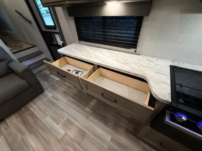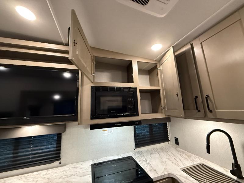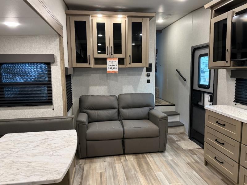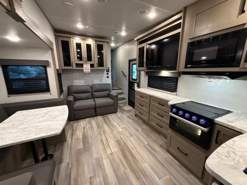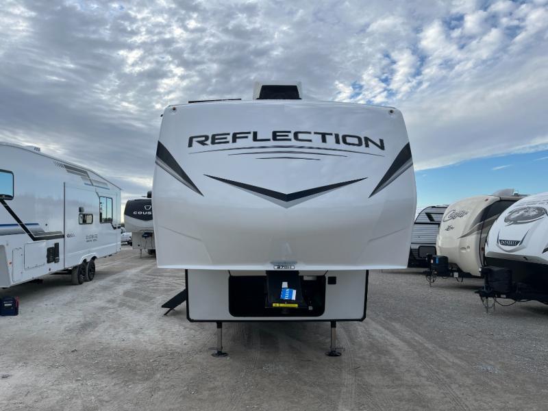 Each Reflection 100 Series fifth wheel by Grand Design is affordable and packed with luxury for unforgettable camping memories! The MorRyde CRE3000 suspension system and Goodyear Endurance tires will provide smooth towing from home to campground. And the solar package with a 180W solar panel, 60 Amp charge controller and 12V refrigerator will allow you to camp for longer periods of time and in more locations! A heated and enclosed underbelly with circulating heat is included in the Arctic 4-Seasons Protection Package, along with a double insulated roof and front cap, and thermofoil insulation under the holding tanks so you can camp all year long if you choose. You will appreciate having an on-demand water heater for hot showers after exploring, and the universal all-in-one docking station will let you monitor your RVs tanks levels and functions with ease. These models also include many luxurious interior features, such as premium Congoleum flooring, pleated shades, residential cabinetry, and matte black fixtures and hardware. Don't let the Reflection 100 Series fifth wheels pass you by!