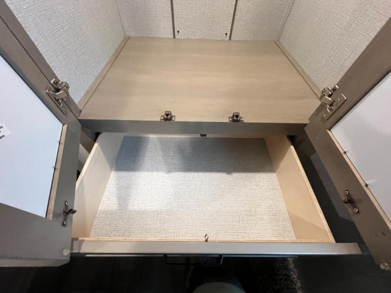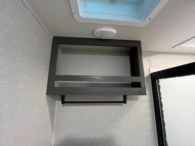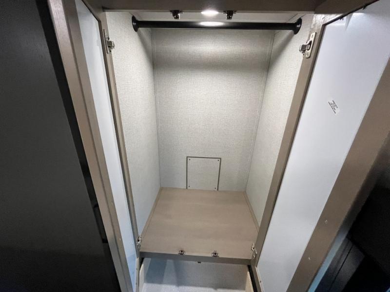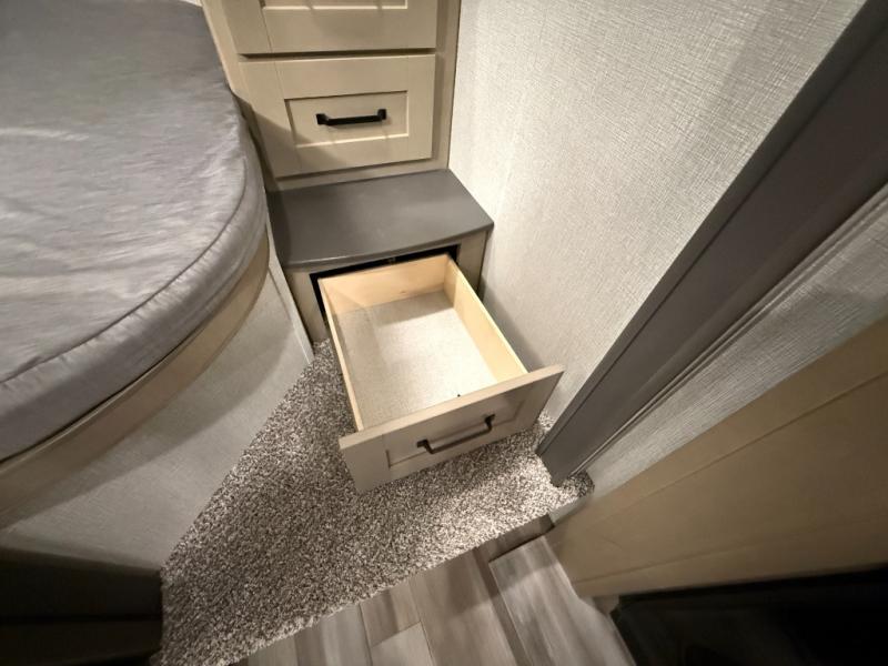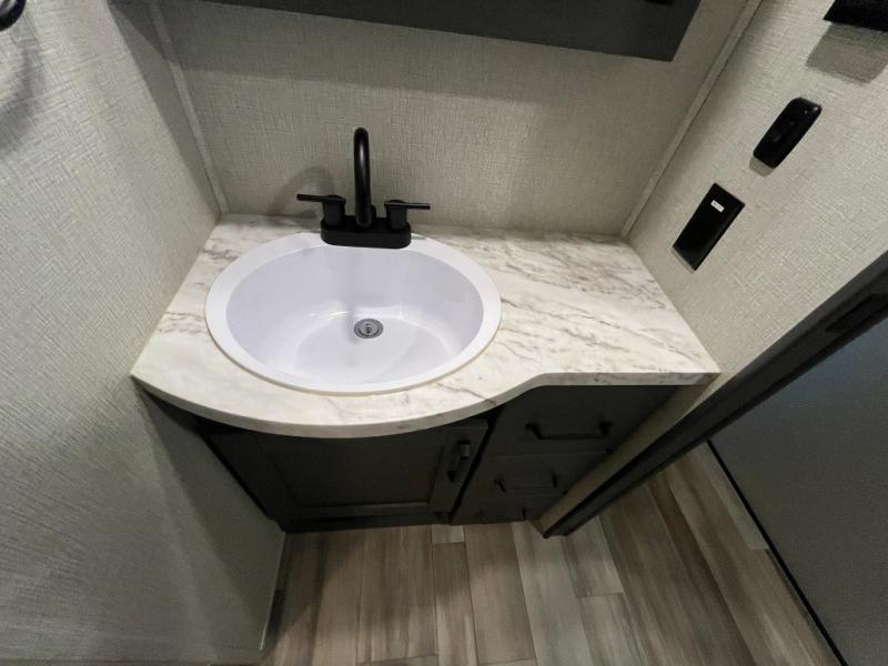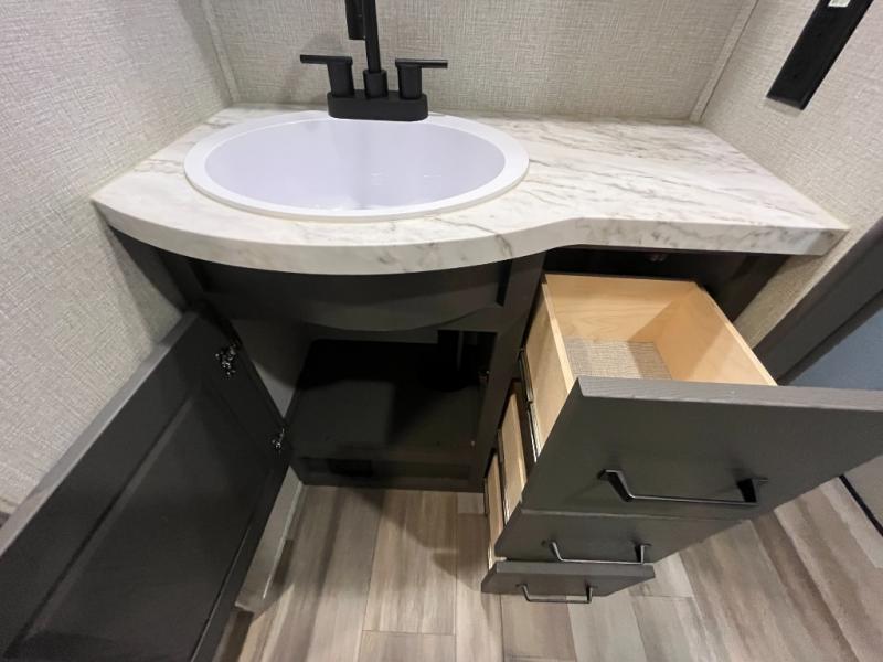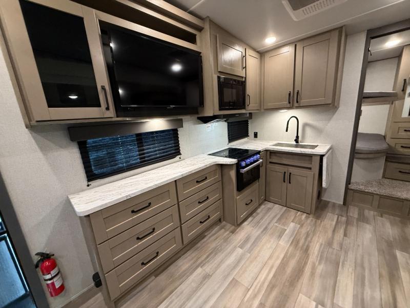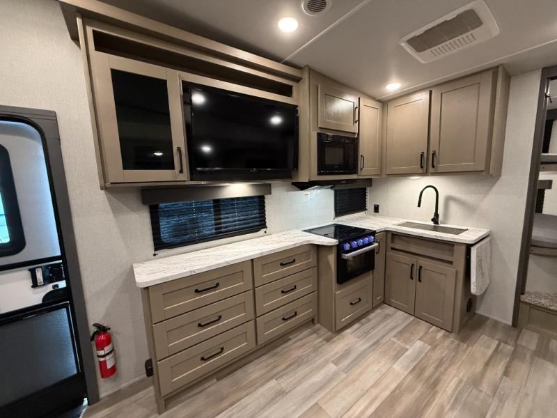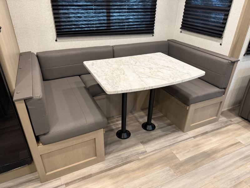 Camping with friends and family just got a whole lot easier in this fifth wheel with double-size bunks and a front private bedroom. Your guests will also have a wardrobe to keep their things tidy, and the bedroom closet will be perfect for your things. If you have other guests stay over, they can sleep on the U-shaped dinette within the slide out or the tri-fold sofa, and there is a 40" high-definition LED TV here to keep everyone entertained on rainy days. Everyone can take turns cleaning up in the full bath that includes a residential walk-in shower, a power vent fan, plus a large vanity top with a deep sink. And you will feel right at home in the front private bedroom with its queen bed, overhead cabinets, and TV prep if you'd like to add a television!