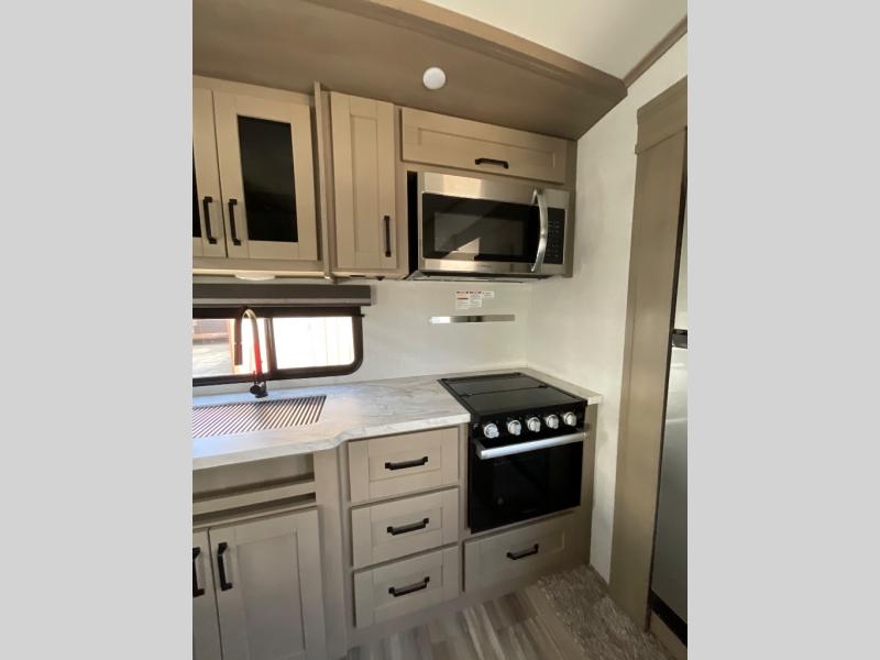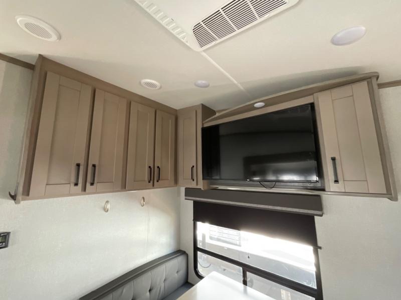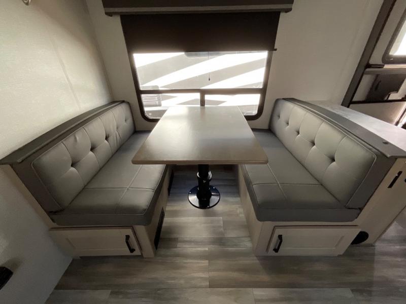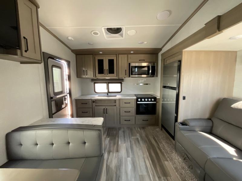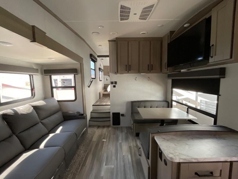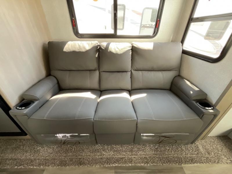 Enjoy a weekend getaway at a campground or off-grid in this fifth wheel! The front private bedroom has a queen bed for you to lay your head on at night and overhead cabinets to keep things out of the way. Inside the full bathroom there is a shower with a skylight for added natural lighting as you get ready each morning. Once you have prepared a delicious home cooked meal at the rear kitchen, head to the booth dinette for a comfortable place to enjoy it. What better way to wind down your nights than to relax on the 70" theatre seating and watch your favorite movie on the 40" LED HDTV. The theatre seats can also be switched out for an optional tri-fold seating if you would prefer that type of seating.