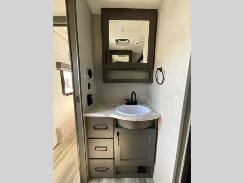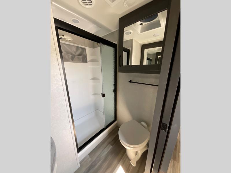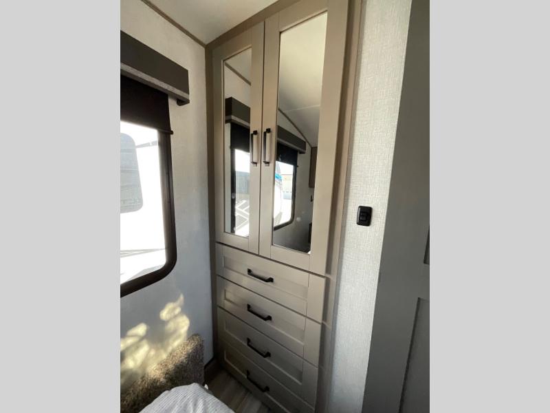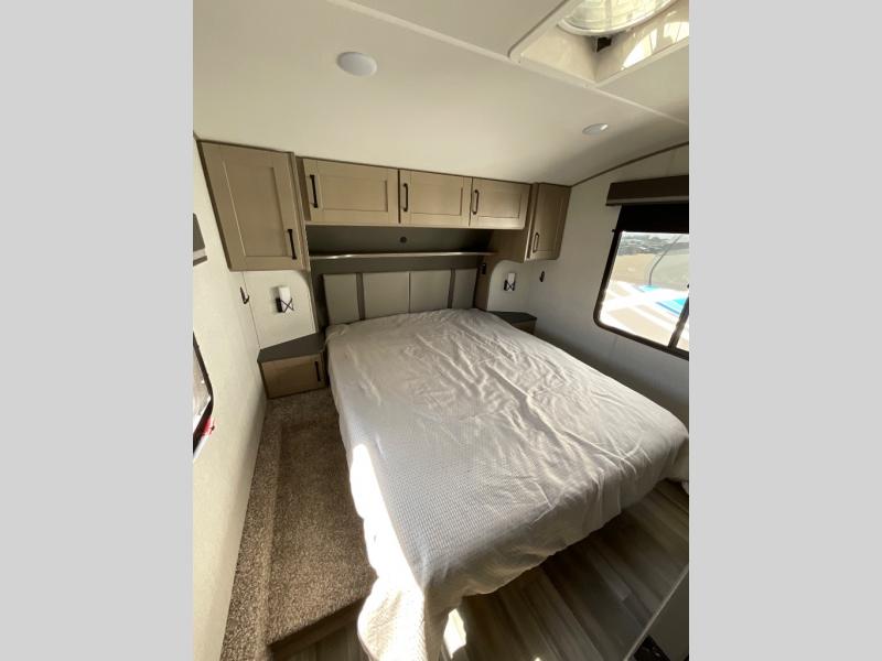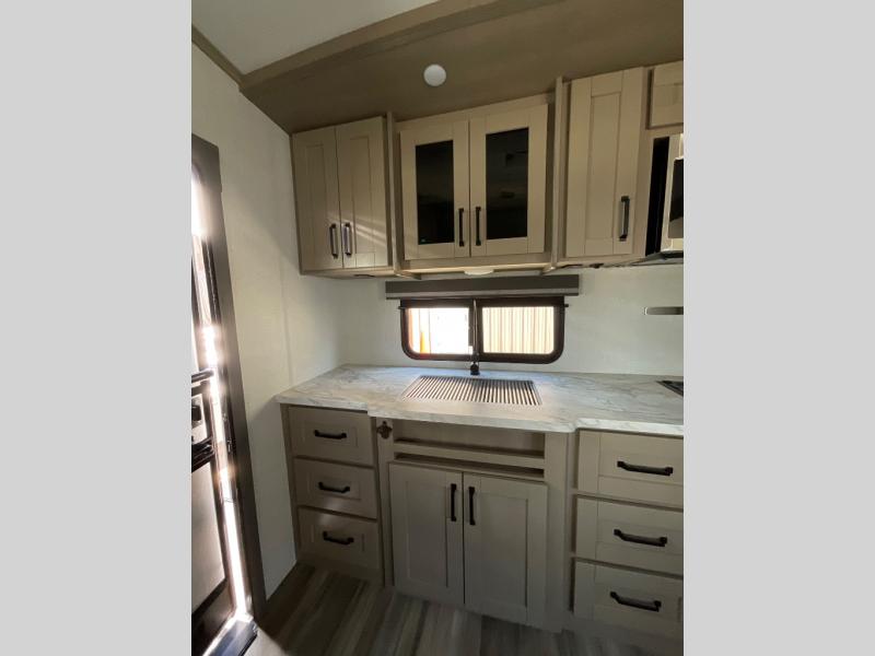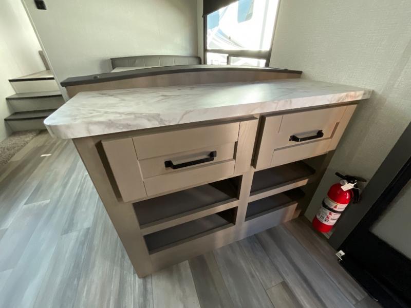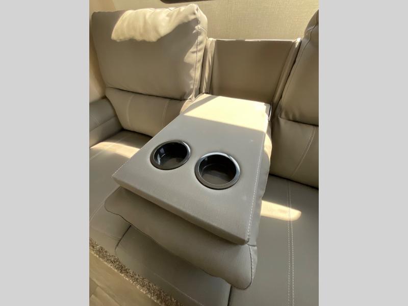 Enjoy a weekend getaway at a campground or off-grid in this fifth wheel! The front private bedroom has a queen bed for you to lay your head on at night and overhead cabinets to keep things out of the way. Inside the full bathroom there is a shower with a skylight for added natural lighting as you get ready each morning. Once you have prepared a delicious home cooked meal at the rear kitchen, head to the booth dinette for a comfortable place to enjoy it. What better way to wind down your nights than to relax on the 70" theatre seating and watch your favorite movie on the 40" LED HDTV. The theatre seats can also be switched out for an optional tri-fold seating if you would prefer that type of seating.