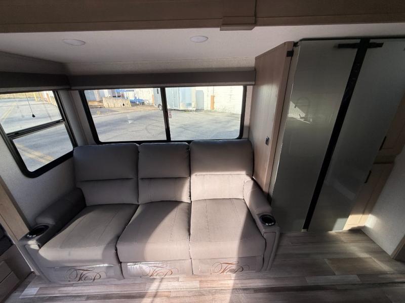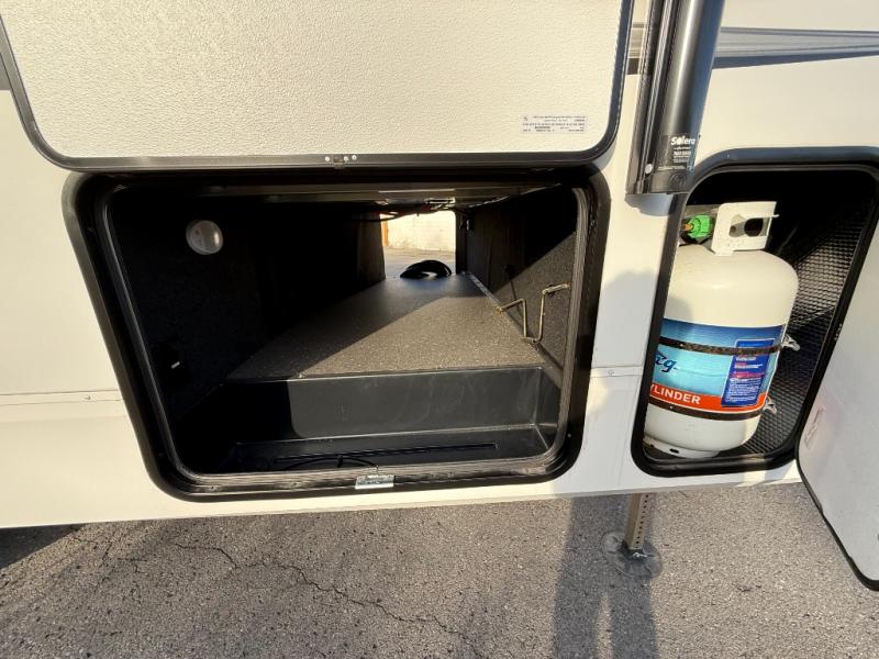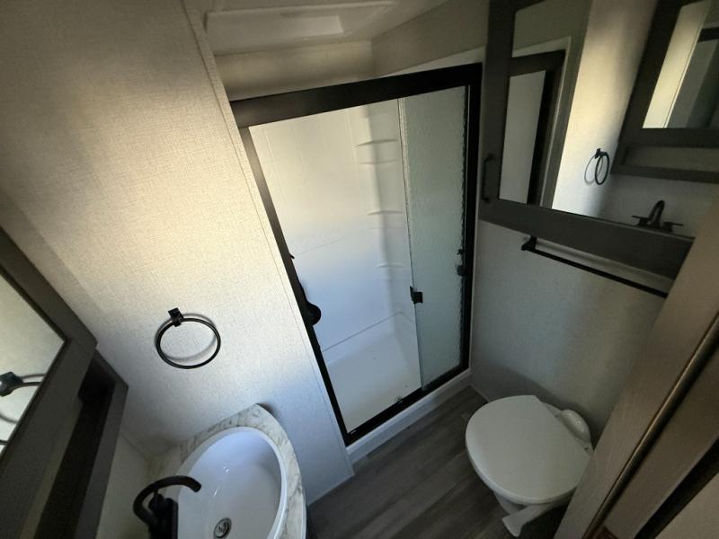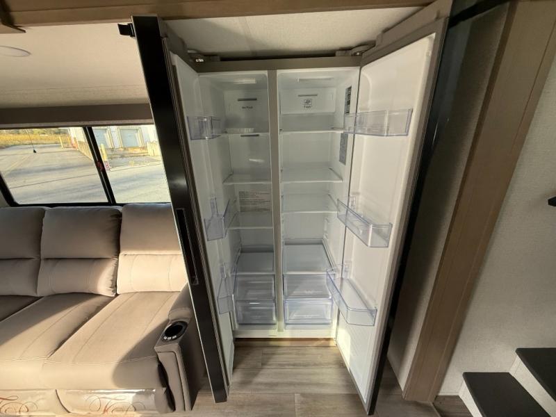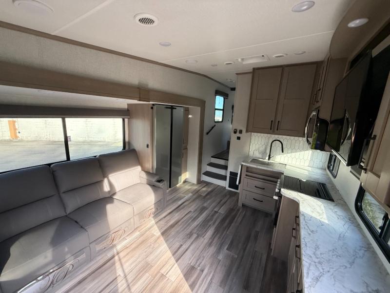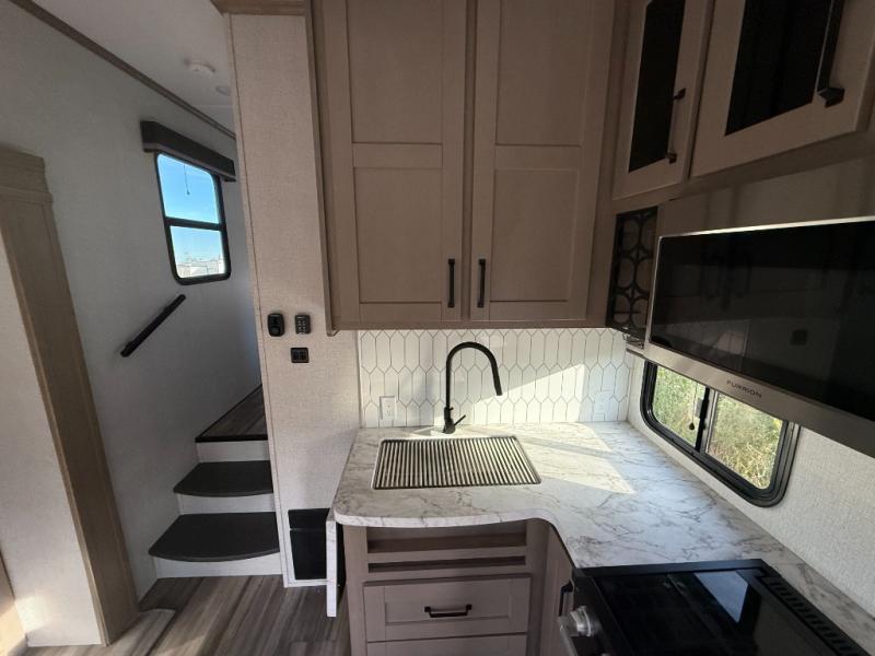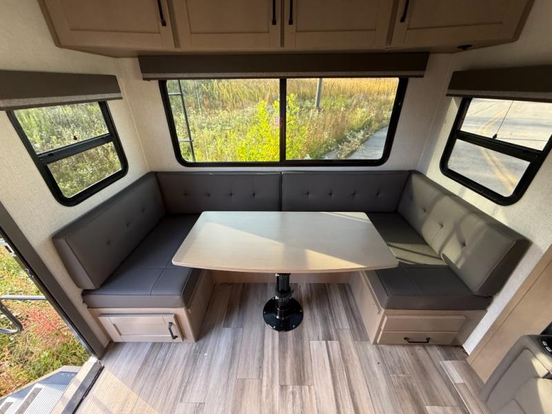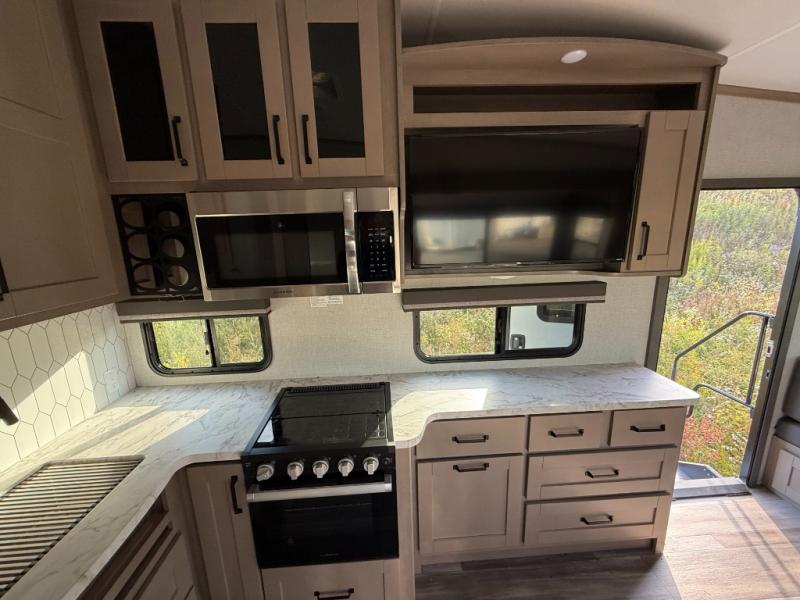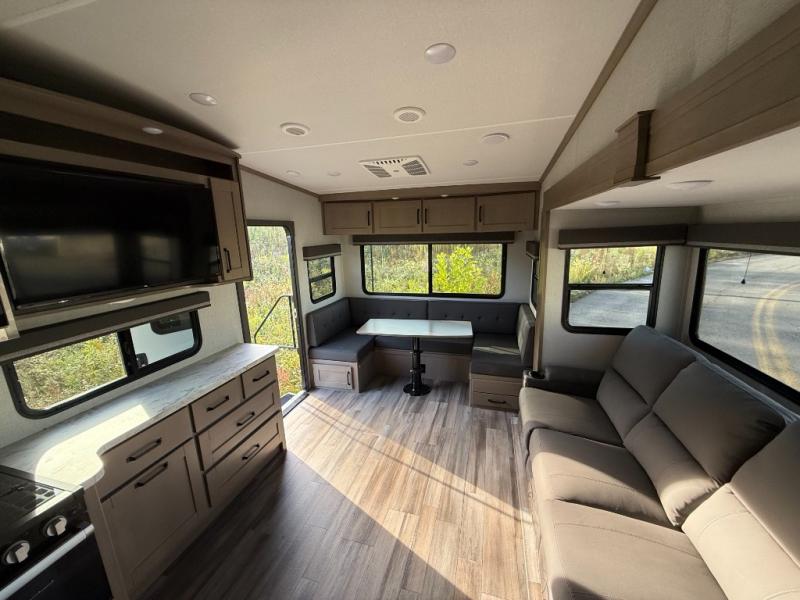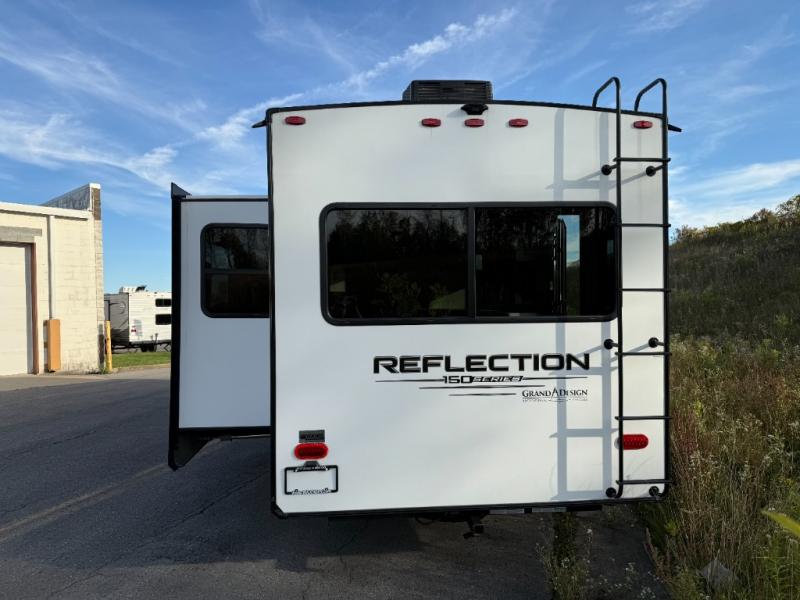With any Reflection 150 Series fifth wheel by Grand Design, there is more available payload capacity and a broader range of half-ton trucks capable of towing this fifth wheel, and no slider hitch is needed thanks to the 90-degree turning radius which makes them short bed friendly and easier to tow. The mandatory Ultimate Power package provides a "One-Touch" automatic leveling system and a detachable power cord with LED light for easy setup, plus motion sensor pass-through lighting and entry lighting, and the Tire Linc TPMS will help you stay safe on the road. The interior offers residential luxury from the cabinetry and premium congoleum flooring, plus the booth dinette to the residential-style window treatment. Make your refined decision today!