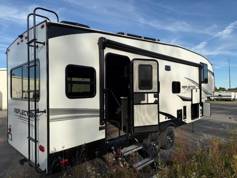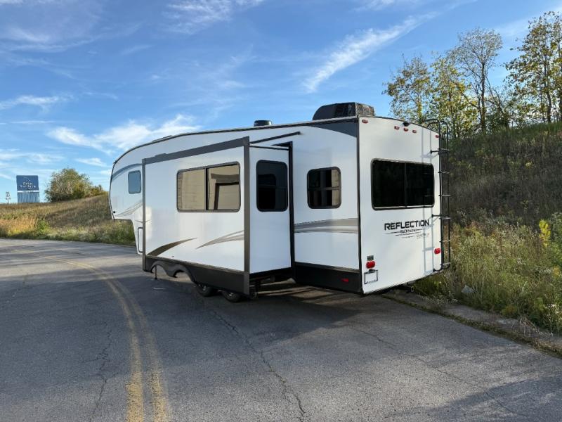 Feel right at home in this Reflection 150 Series with a private bedroom that includes a walk-around queen bed with storage on each side, windows, and a space savings sliding door. The full bathroom offers a walk-in shower, storage for your linens and a sliding door for easy access. When you get hungry, the cook will have an L-shaped kitchen area to make meals, plus full amenities including a 30" microwave, a flip-up counter extension, a pantry for your dry goods and a 16 cu. ft. refrigerator to store lots of food and cold beverages. You can dine at the rear U-shaped dinette lounge and enjoy the view out of all the windows or outside under the 18' electric awning. And the 78" theatre seating will be a nice place to relax and watch the 40" LED HDTV.