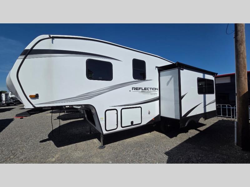 Feel right at home in this Reflection 150 Series with a private bedroom that includes a walk-around queen bed with storage on each side, windows, and a space savings sliding door. The full bathroom offers a walk-in shower, storage for your linens and a sliding door for easy access. When you get hungry, the cook will have an L-shaped kitchen area to make meals, plus full amenities including a 30" microwave, a flip-up counter extension, a pantry for your dry goods and a 16 cu. ft. refrigerator to store lots of food and cold beverages. You can dine at the rear U-shaped dinette lounge and enjoy the view out of all the windows or outside under the 18' electric awning. And the 78" theatre seating will be a nice place to relax and watch the 40" LED HDTV.