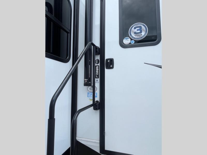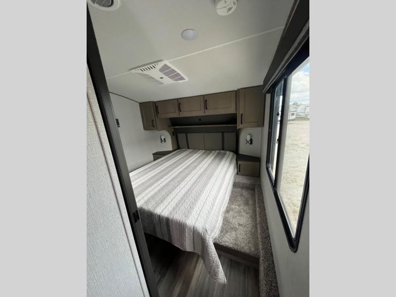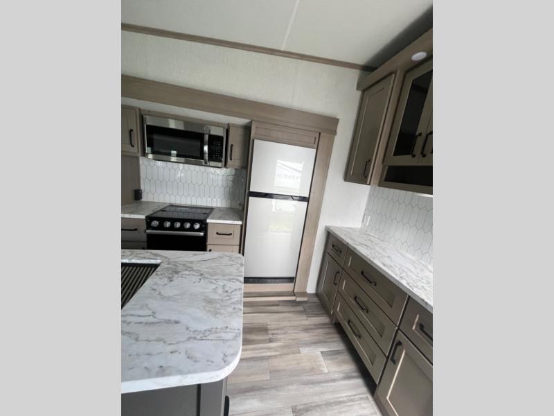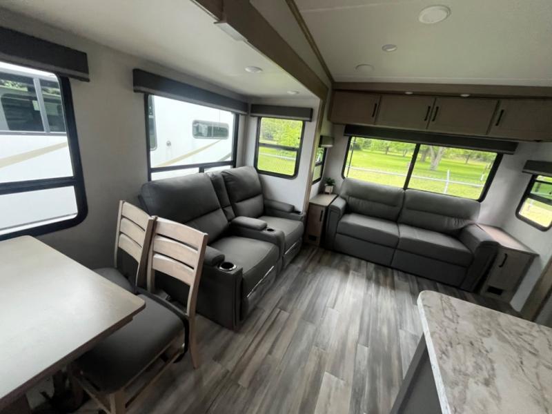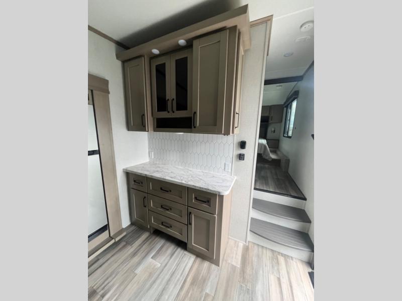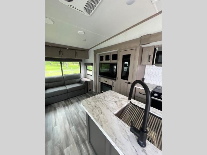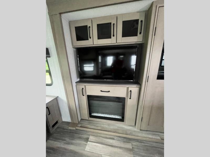 Get ready to enjoy everything the campgrounds and surrounding area has to offer when you are setup to camp in this fifth wheel! The two electric awnings offer protected areas creating outdoor living spaces, just grab your camping chairs from the unobstructed pass-through storage. And the interior offers a spacious living area and kitchen combination with two slide outs. You can sit on the tri-fold sofa or the booth dinette with an option for a swivel dinette. The hutch and kitchen island offer counter space to prepare and serve meals, and there is a large pantry for goodies. The 40" LED HDTV with fireplace below provides entertainment before bedtime or on a rainy day. And the front bedroom offers privacy, a walk-around queen bed, storage, and it is next to the full bathroom which is just a few steps down the hallway.