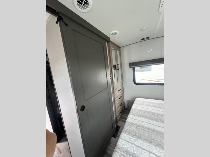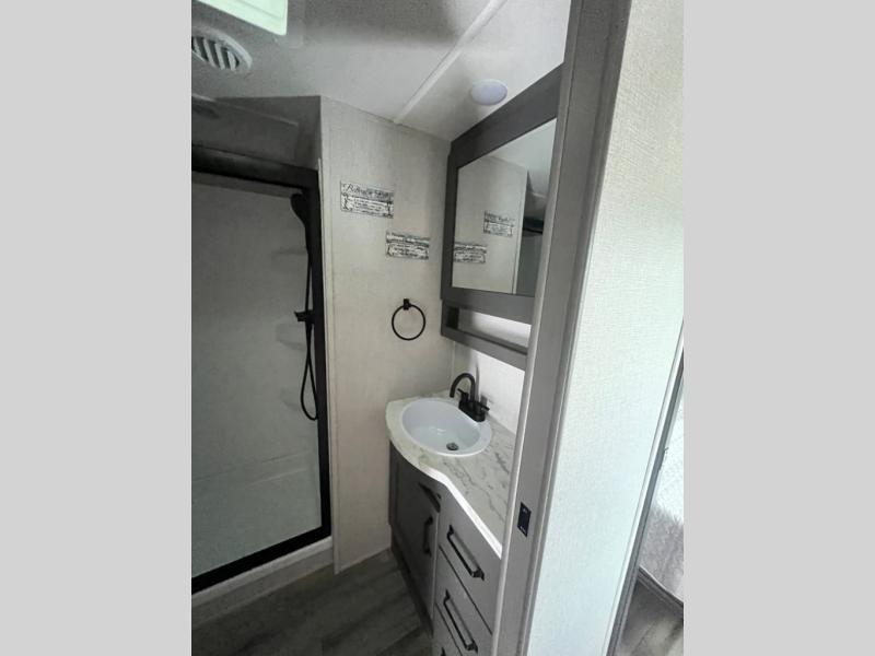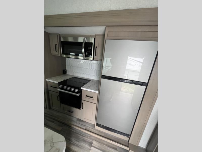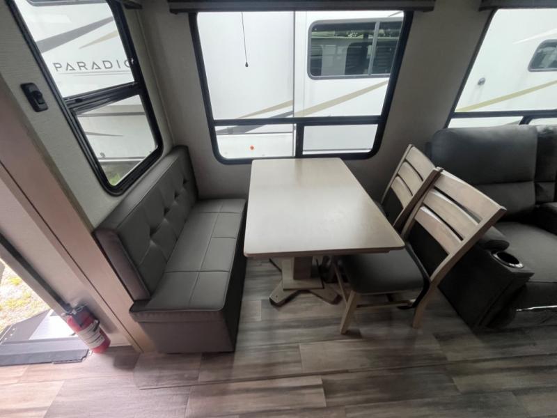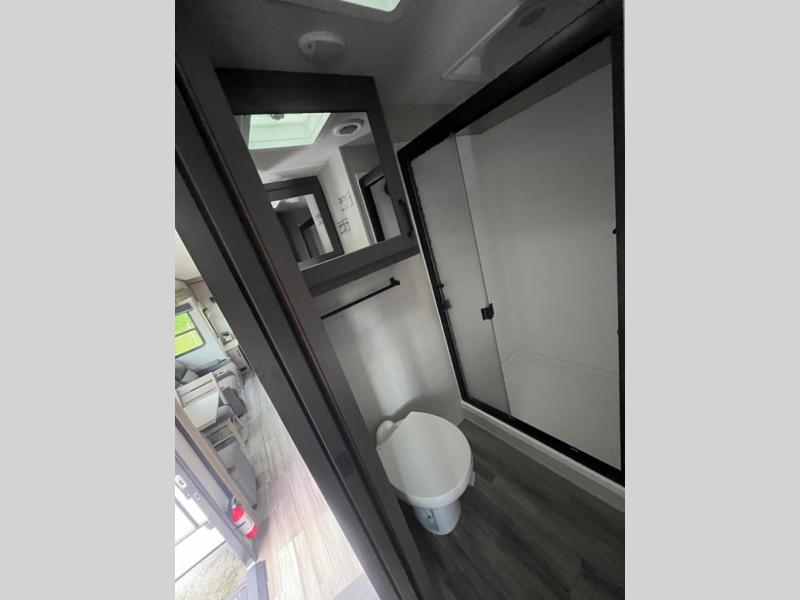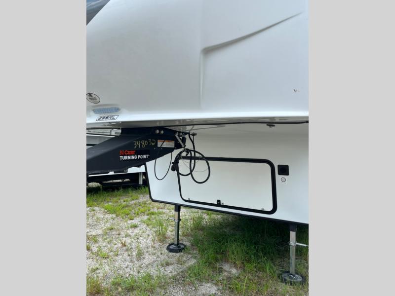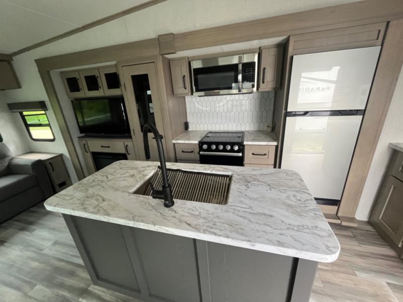 Get ready to enjoy everything the campgrounds and surrounding area has to offer when you are setup to camp in this fifth wheel! The two electric awnings offer protected areas creating outdoor living spaces, just grab your camping chairs from the unobstructed pass-through storage. And the interior offers a spacious living area and kitchen combination with two slide outs. You can sit on the tri-fold sofa or the booth dinette with an option for a swivel dinette. The hutch and kitchen island offer counter space to prepare and serve meals, and there is a large pantry for goodies. The 40" LED HDTV with fireplace below provides entertainment before bedtime or on a rainy day. And the front bedroom offers privacy, a walk-around queen bed, storage, and it is next to the full bathroom which is just a few steps down the hallway.