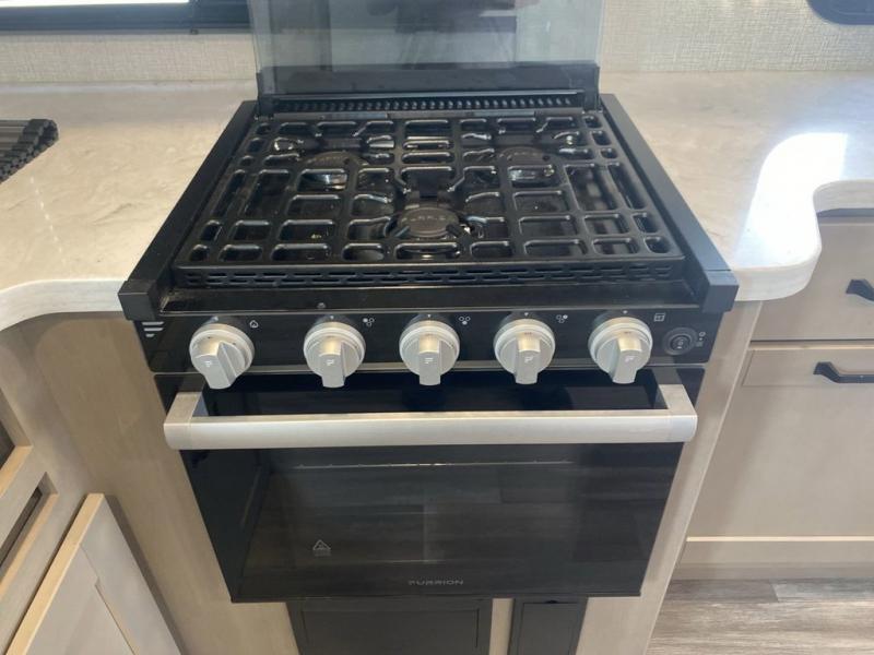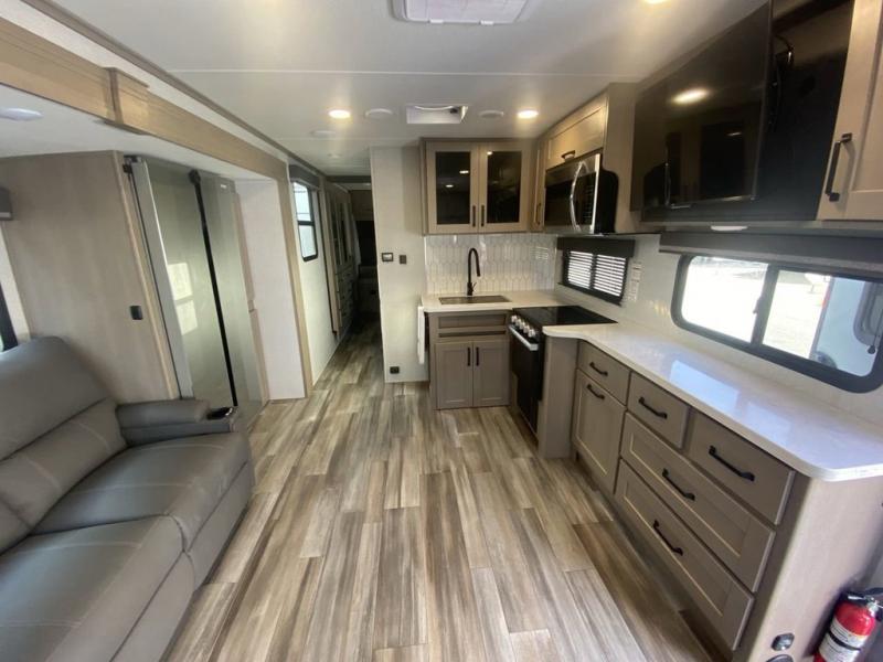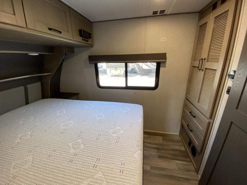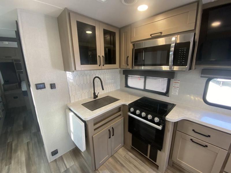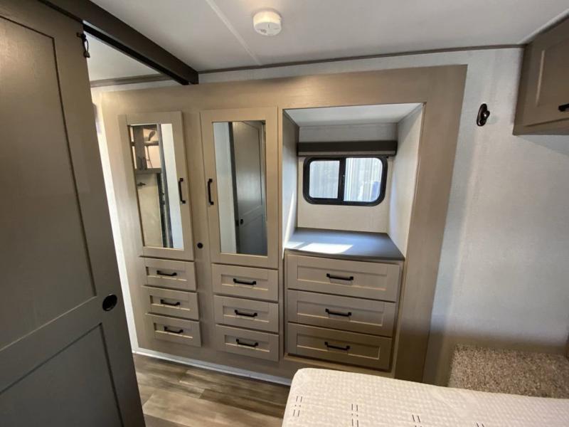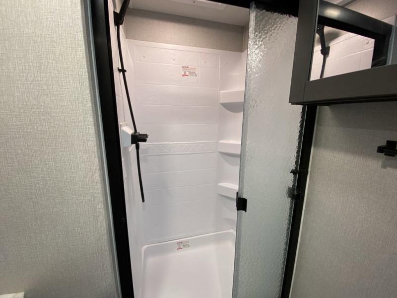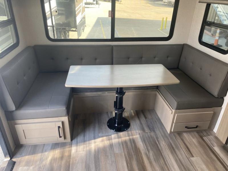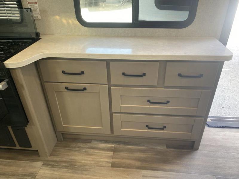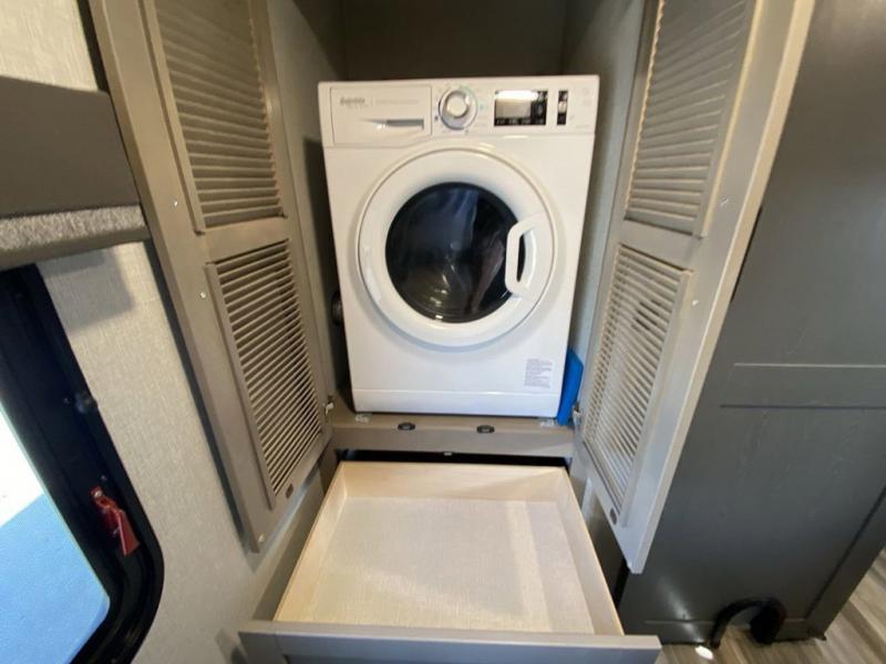 Pack your bags and head out on a comfortable camping trip in this travel trailer! It features a front private bedroom with a queen bed, a set of drawers with an area prepped to add an optional washer and dryer, and a slide that houses a linen closet, a bench, and a wardrobe all with drawers below them. The full bathroom has a 30" x 36" shower and a linen closet to keep your towels close. The chef can prepare their best home cooked meals with the three burner cooktop, 16 cu. ft. refrigerator, and flip-up countertop extension. Relax on the sofa or the rear U-shaped lounge while you watch a movie with the 40" LED TV at the entertainment center!