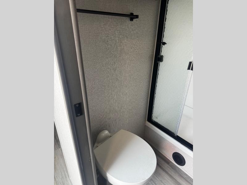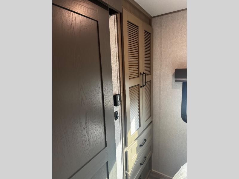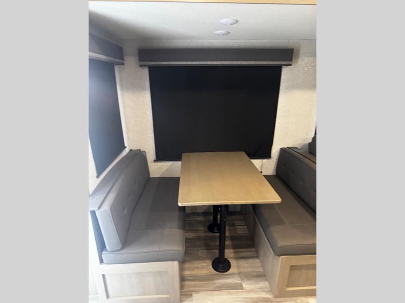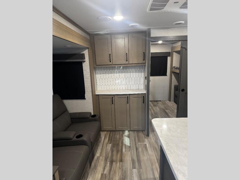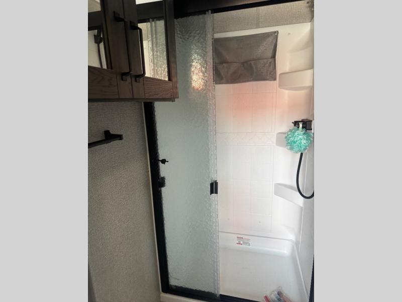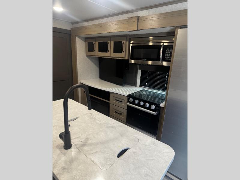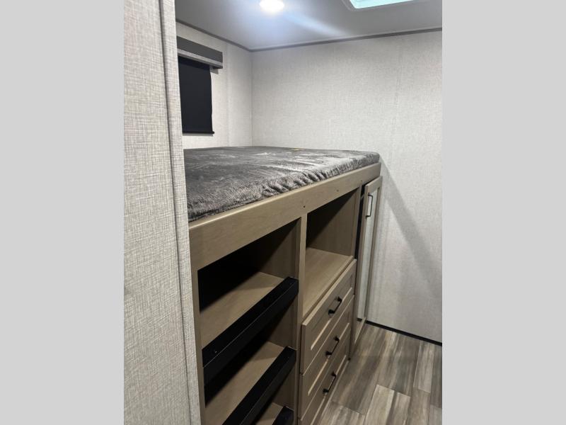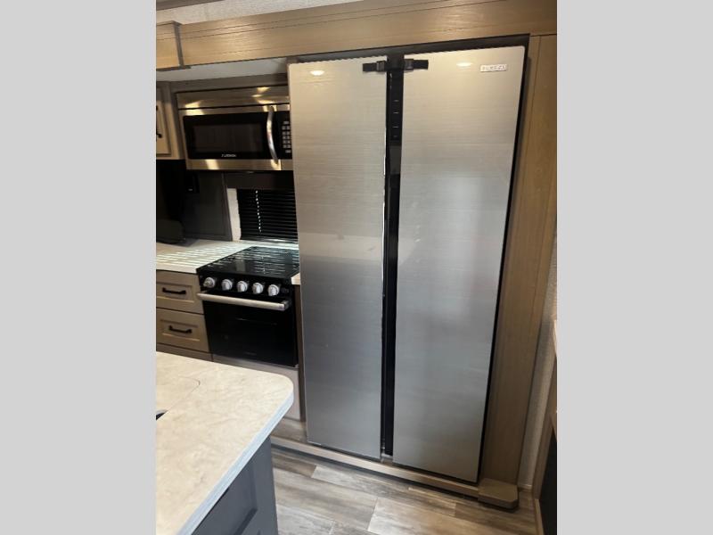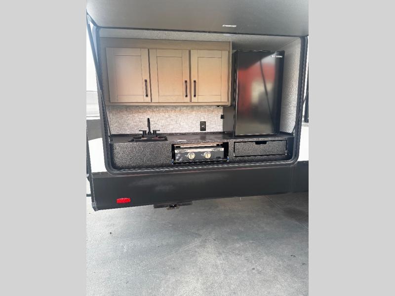 Finding the perfect trailer for a larger group is simple, take a look at this one for your next RV! The rear bunkhouse might be the first reason you fall in love because of the slide out with a flip bunk above a tri-fold sofa, the second bunk bed on the opposite side and storage below, and the large rear window for great views. The outside kitchen might be another reason allowing you to enjoy the outdoors while providing meals for everyone, and/or the inside gourmet kitchen with a 16 cu. ft. refrigerator, an island, and two hutches. Everyone can gather together and relax on the theater seating with cupholders and the booth dinette or choose a free standing dinette option, and to visit or watch the 40" LED HDTV with fireplace below. The full bathroom includes a space savings sliding door and linen storage, and the bedroom gives you a front walk-around queen bed with storage for your clothes on each side, plus there is an additional wardrobe with drawers and the option to add a washer/dryer to the prepped space.