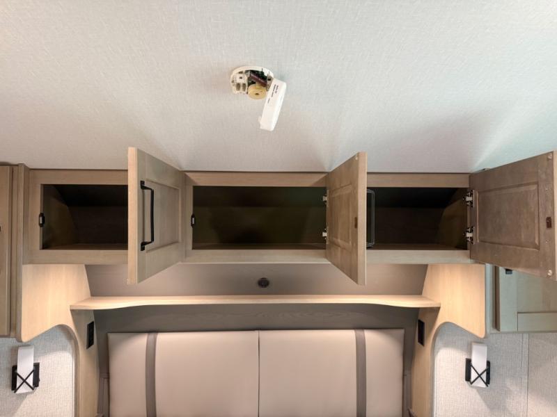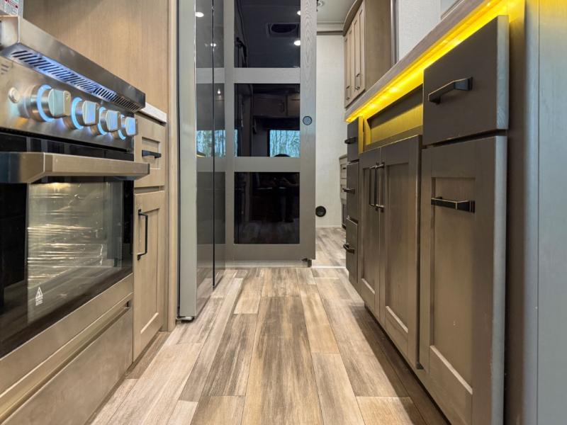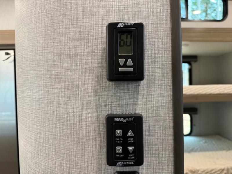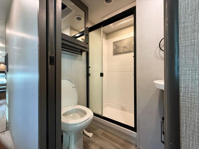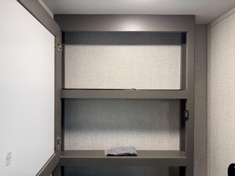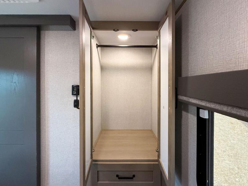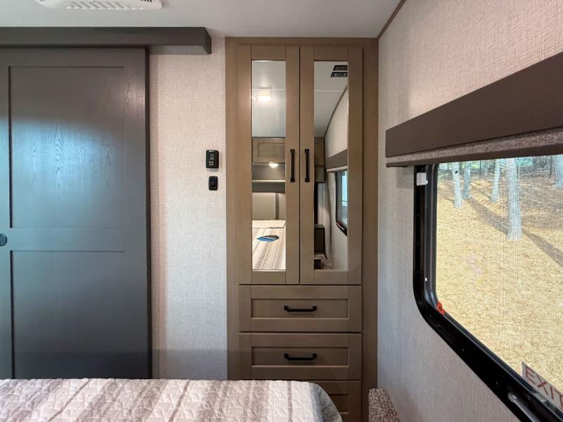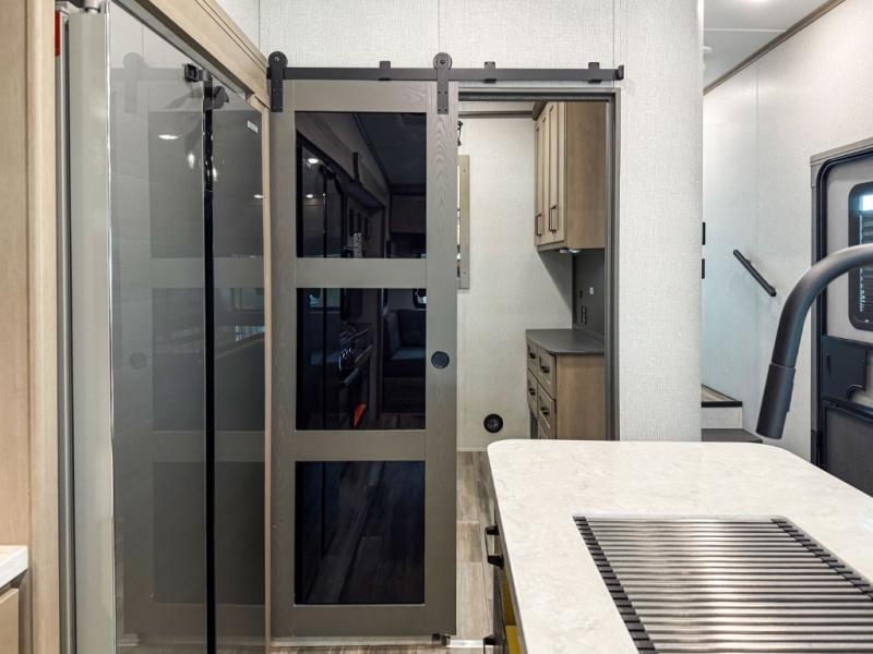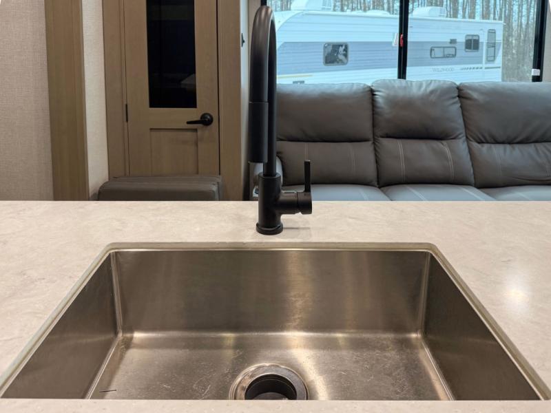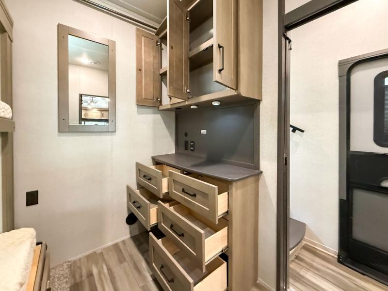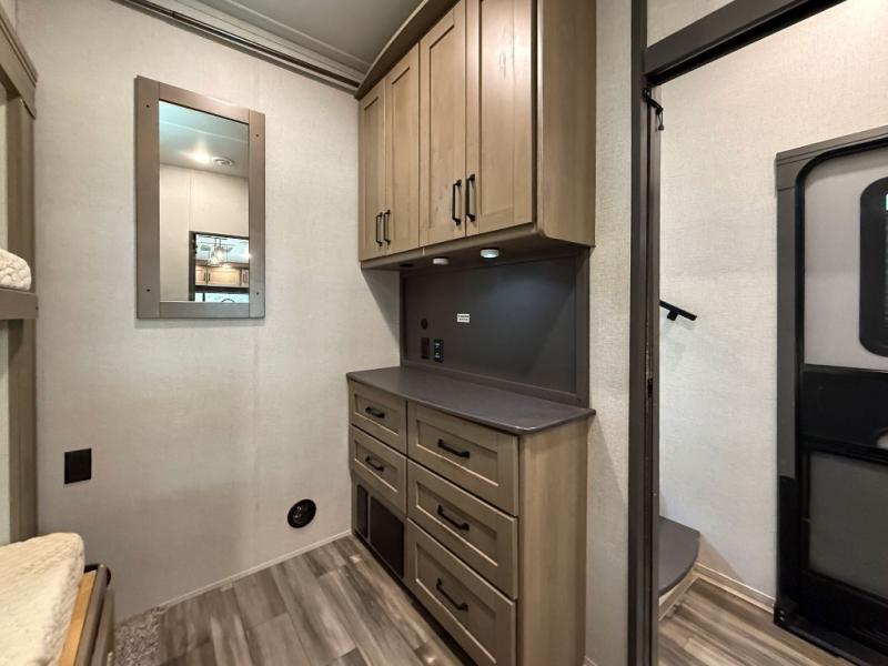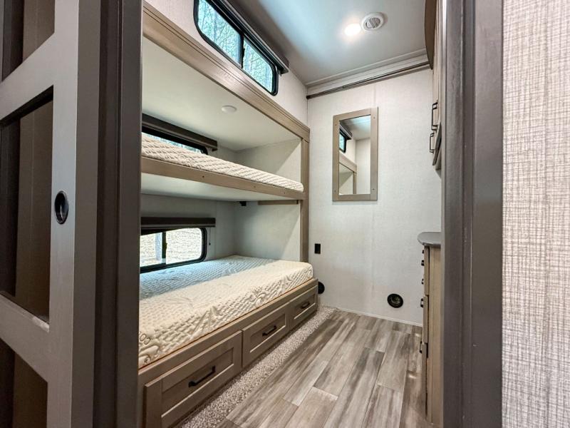 When you are looking for a versatile extra room for either a second bedroom or living area as well as an office, this middle bunkhouse might just work! There is a slide out with two bunks and drawers plus a full size dresser. You can sleep like a queen on the walk-around bed in the front private bedroom that offers more clothing storage and windows for views. The rear main living and kitchen area provides plenty of seating on the a 78" triple person theater seats, and on the 92" U-shaped lounge with table with windows within the slide for natural lighting and great views. The kitchen island gives the cook more space to make and serve meals, and the gourmet kitchen includes a 16 cu. ft. refrigerator, plus a pantry for dry goods. There is an exterior outside kitchen with a griddle and a 1.6 cu. ft. refrigerator for beverages and such, plus you will find an LP quick connect, Coax TV hookup, and a spray port to wash off your dirty shoes.