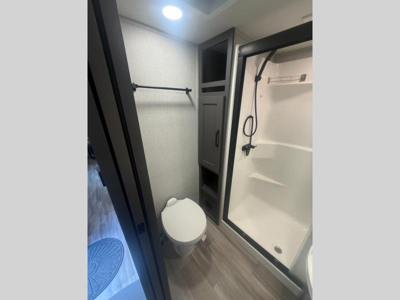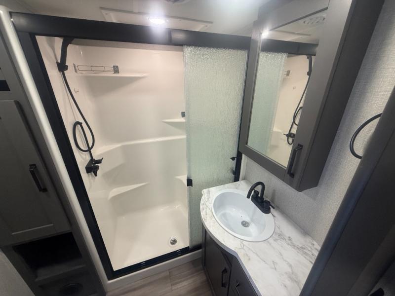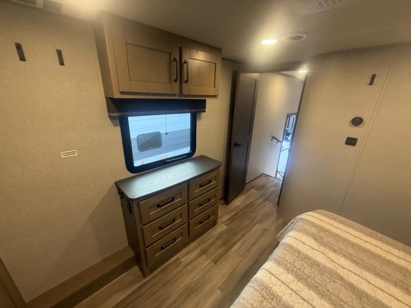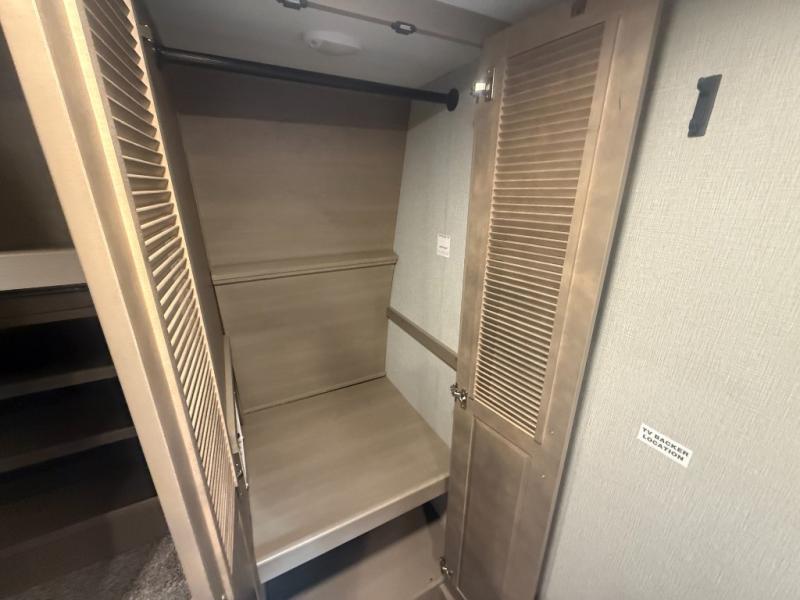 You can enjoy a spacious rear living area in this RV with dual opposing slides offering you entertainment, kitchen amenities, seating and windows for great views! The rear tri-fold sofa also converts into extra sleeping space for an extra guest or two, just like the booth dinette does. Yet you might like to add the free standing dinette option. There are theater seats to enjoy while you place your drinks in the cupholders and watch the entertainment center with a 40" LED HDTV and fireplace. The pantry is big enough to store your favorite snacks, and the kitchen island will make meal prepping easier, plus there is a 16 cu. ft. refrigerator to store any leftovers. The full bathroom has a 30" x 48" fiberglass shower and a linen closet to store your towels. The front private bedroom has a comfortable queen bed slide that can be switched out for the optional king bed, a dresser with overhead cabinets, and a full wall wardrobe that is prepped to add the optional washer and dryer so that you can extend your camping trip with clean clothes!