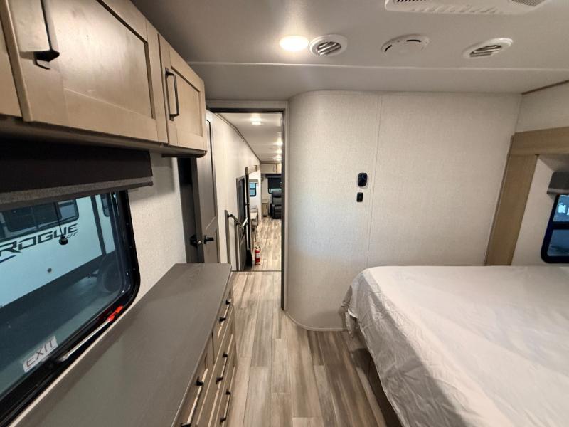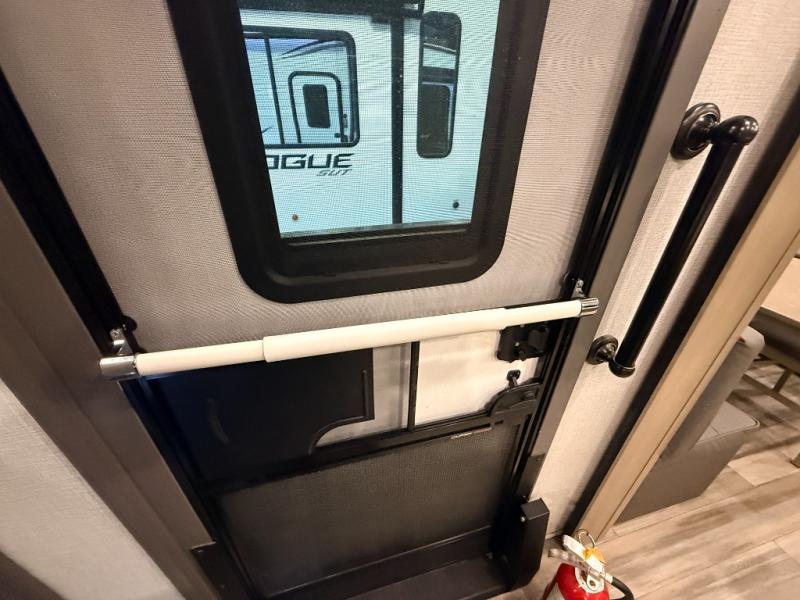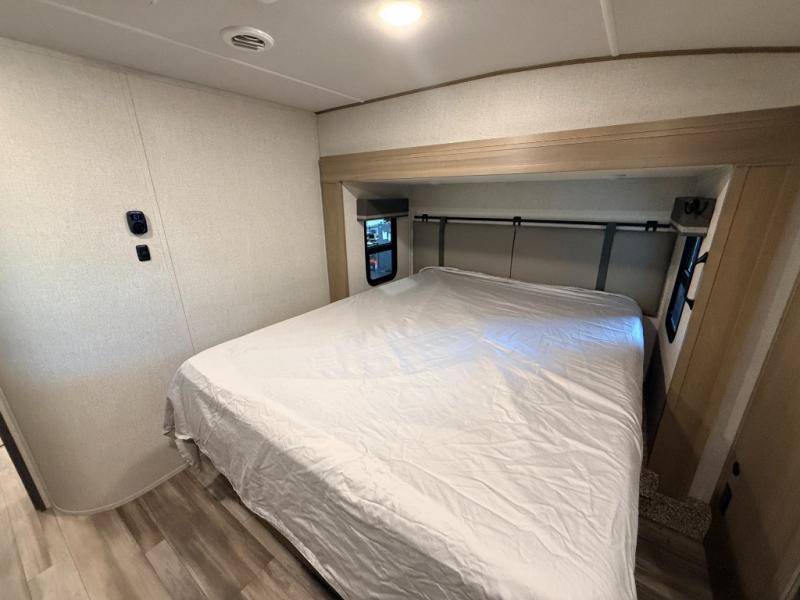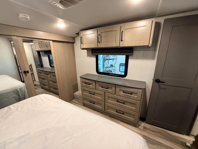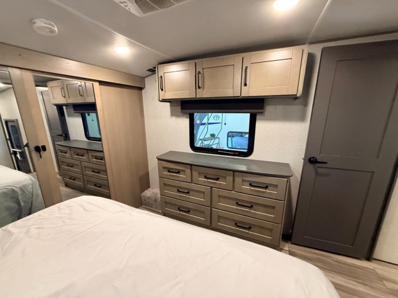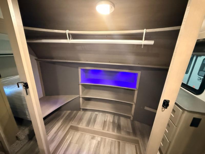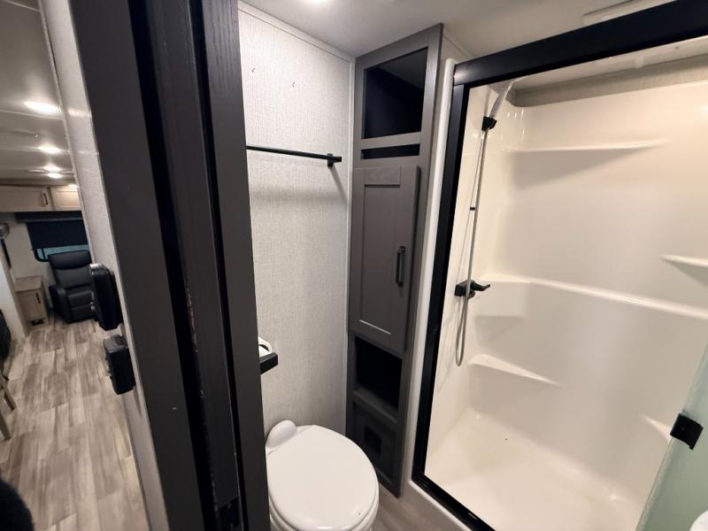 You can enjoy a spacious rear living area in this RV with dual opposing slides offering you entertainment, kitchen amenities, seating and windows for great views! The rear tri-fold sofa also converts into extra sleeping space for an extra guest or two, just like the booth dinette does. Yet you might like to add the free standing dinette option. There are theater seats to enjoy while you place your drinks in the cupholders and watch the entertainment center with a 40" LED HDTV and fireplace. The pantry is big enough to store your favorite snacks, and the kitchen island will make meal prepping easier, plus there is a 16 cu. ft. refrigerator to store any leftovers. The full bathroom has a 30" x 48" fiberglass shower and a linen closet to store your towels. The front private bedroom has a comfortable queen bed slide that can be switched out for the optional king bed, a dresser with overhead cabinets, and a full wall wardrobe that is prepped to add the optional washer and dryer so that you can extend your camping trip with clean clothes!