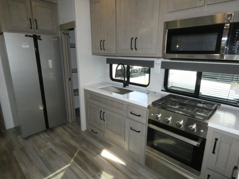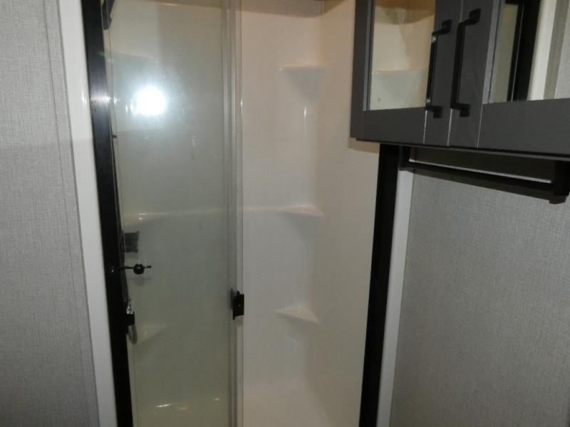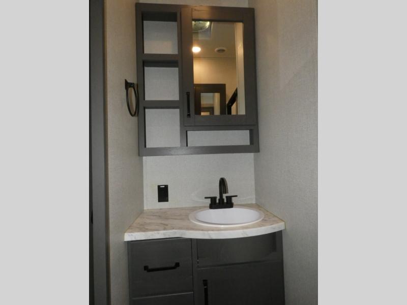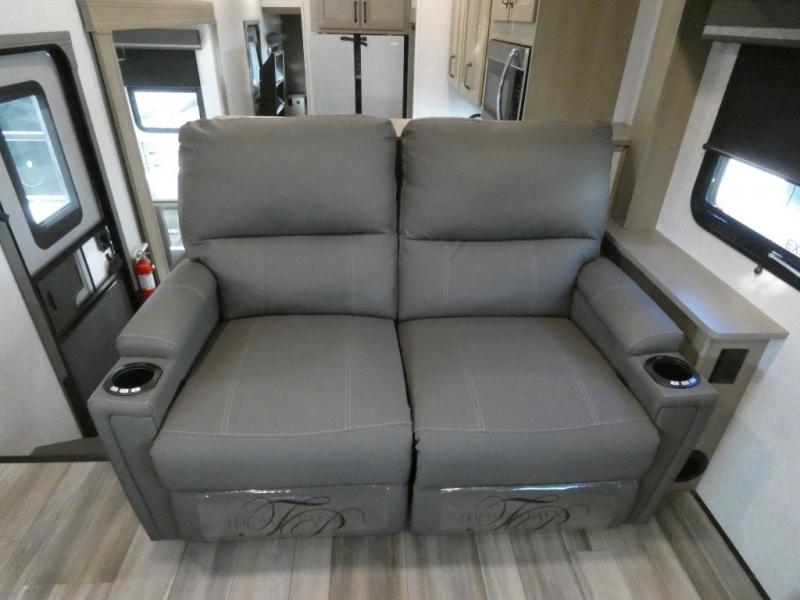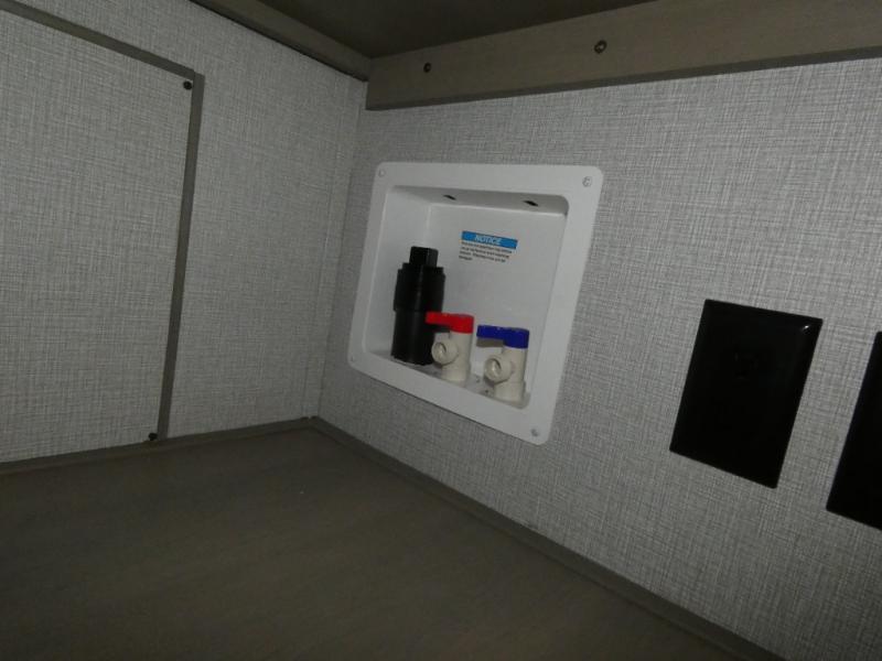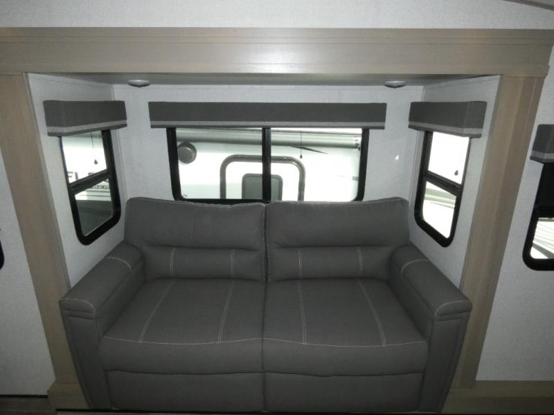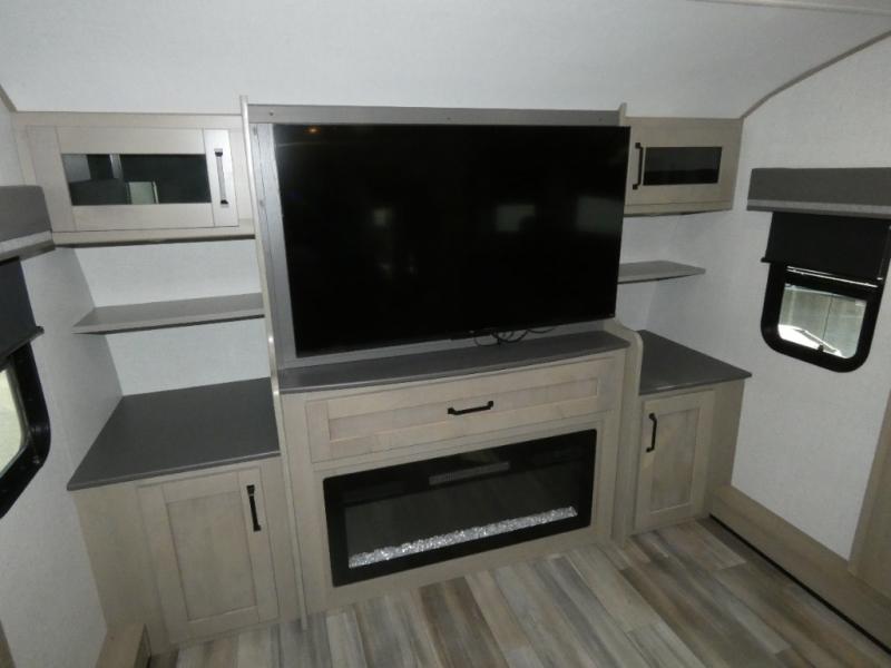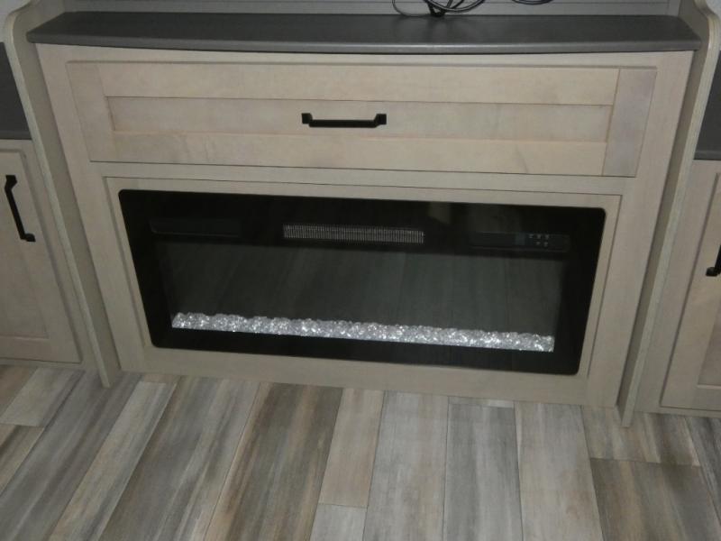 You and your spouse will love having this fifth wheel on your next camping adventure! Get a good night's rest each night on the queen bed slide in the rear private bedroom with TV prep across from the bed, and freshen up each morning in the full bathroom with the 30" x 48" fiberglass shower. You can enjoy home cooked meals made using the three burner cooktop and 16 cu. ft. refrigerator in the full kitchen, and eat them at the slide out free standing dinette table featuring two chairs and an ottoman with storage. You even have a hutch to store your dishes in, and a TV prep area so you can add a TV to watch a show while you cook. The front living area offers a comfortable place to wind down your nights by relaxing in front of the fireplace on either one of the opposing tri-fold sofa slides or the theater seating!
