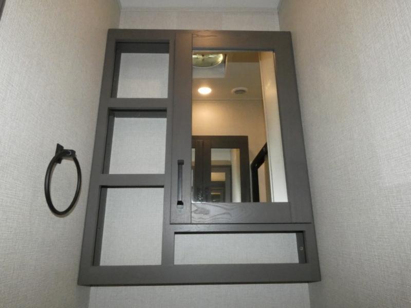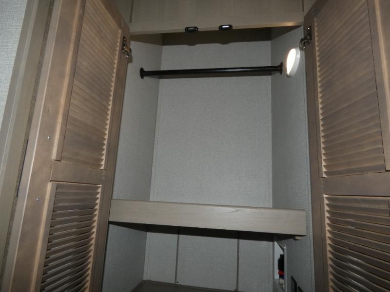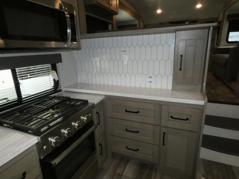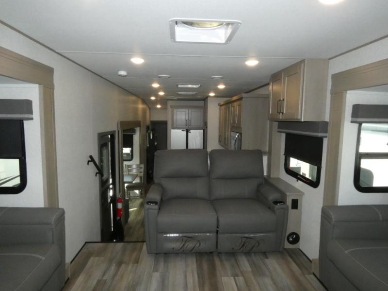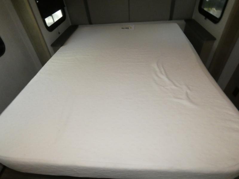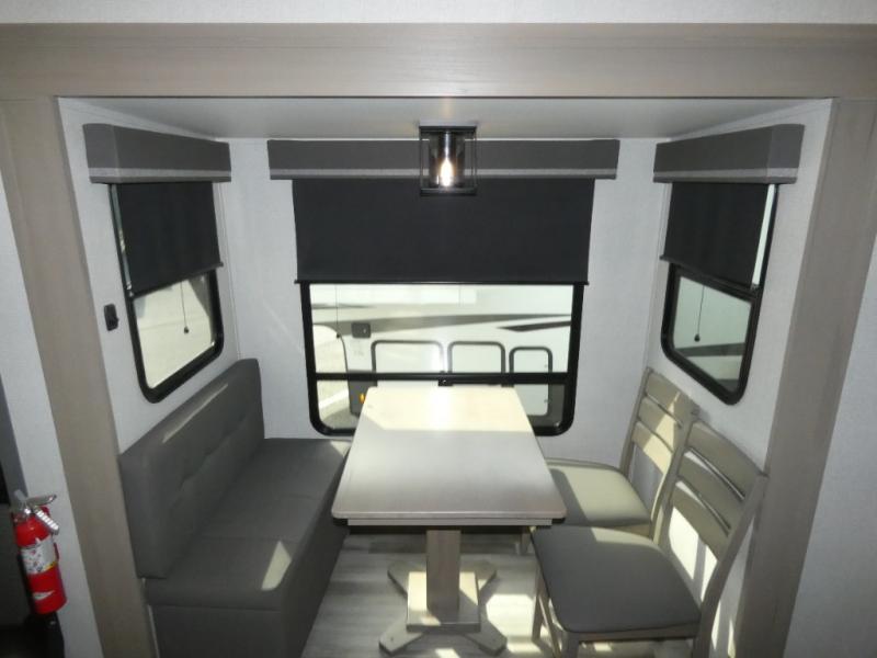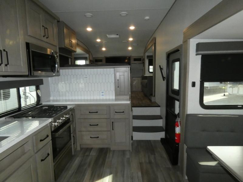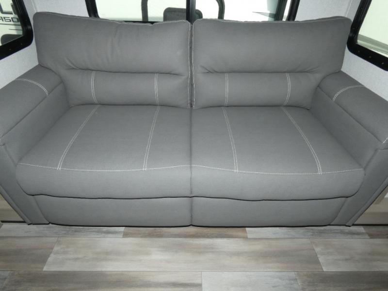 You and your spouse will love having this fifth wheel on your next camping adventure! Get a good night's rest each night on the queen bed slide in the rear private bedroom with TV prep across from the bed, and freshen up each morning in the full bathroom with the 30" x 48" fiberglass shower. You can enjoy home cooked meals made using the three burner cooktop and 16 cu. ft. refrigerator in the full kitchen, and eat them at the slide out free standing dinette table featuring two chairs and an ottoman with storage. You even have a hutch to store your dishes in, and a TV prep area so you can add a TV to watch a show while you cook. The front living area offers a comfortable place to wind down your nights by relaxing in front of the fireplace on either one of the opposing tri-fold sofa slides or the theater seating!