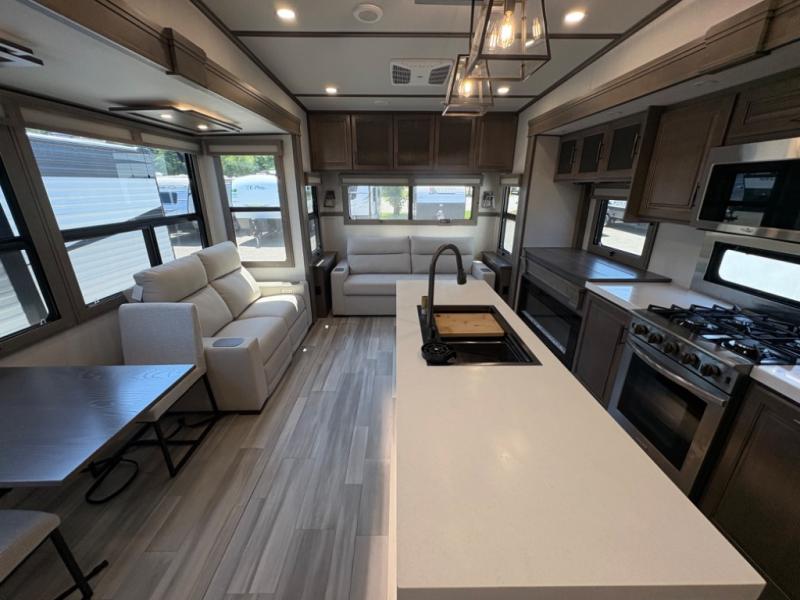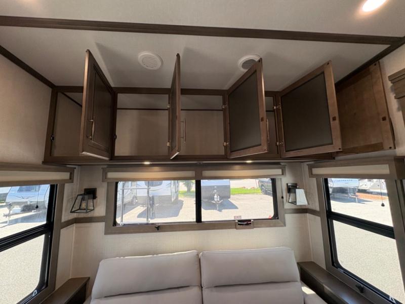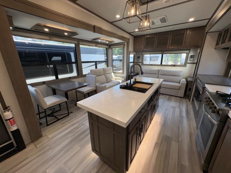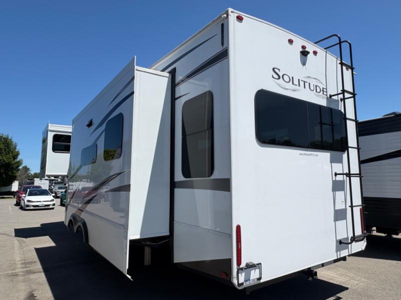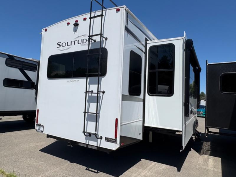 Each Solitude fifth wheel by Grand Design features a 101" wide-body construction, heavy duty 7,000 lb. axles, frameless tinted windows, and high-gloss gel coat sidewalls. You can camp year around thanks to the Weather-Tek Package that includes a 35K BTU high-capacity furnace, an all-in-one enclosed and heated utility center, and a fully enclosed underbelly with heated tanks and storage. Inside, you'll love the premium roller shades, hardwood cabinet doors, solid surface countertops and sinks, plus residential finishes throughout to make you truly feel at home. Each model also includes a MORryde CRE3000 suspension system, self adjusting brakes, and a MORryde pin box that will provide smooth towing from home to campground. Affordable luxury is possible with the Solitude fifth wheels; choose yours today!