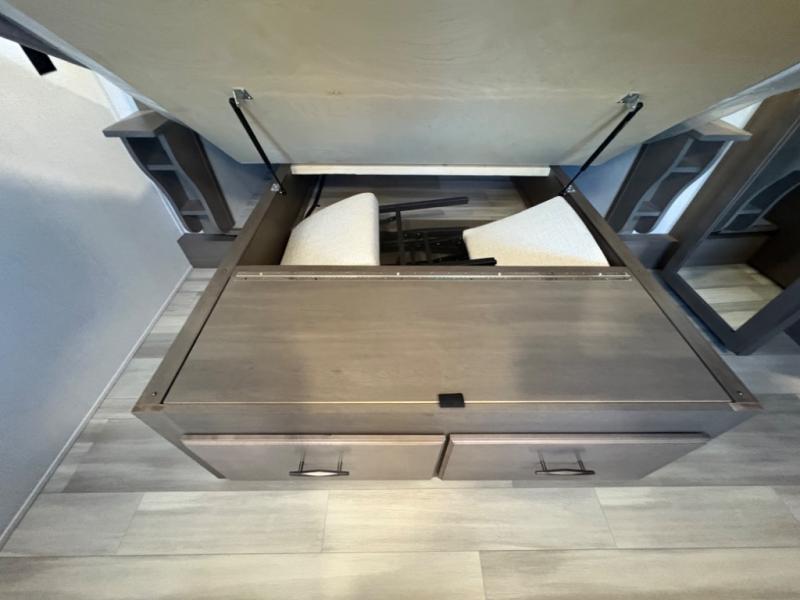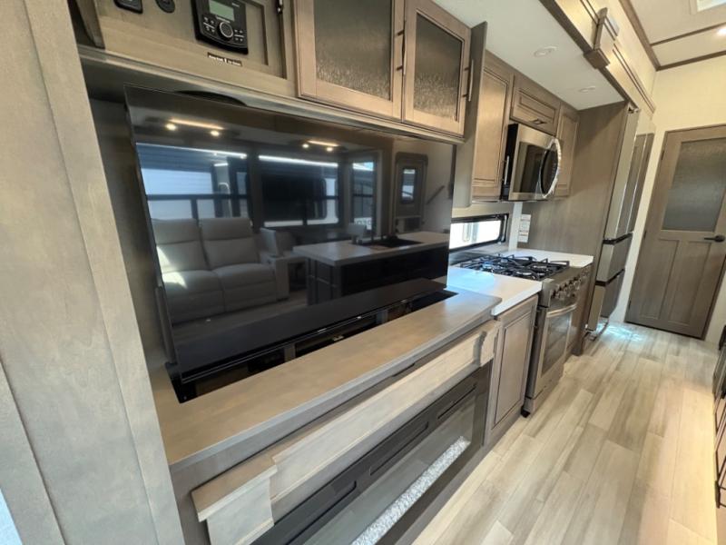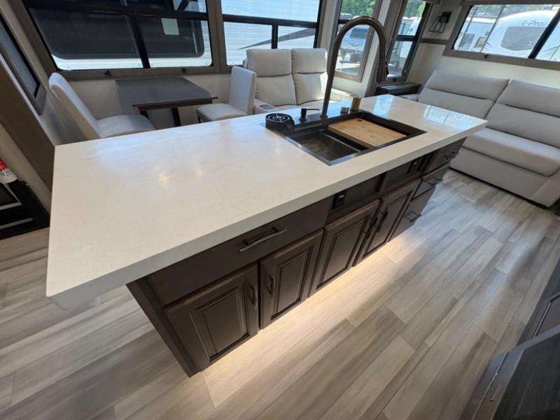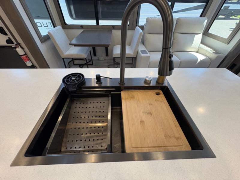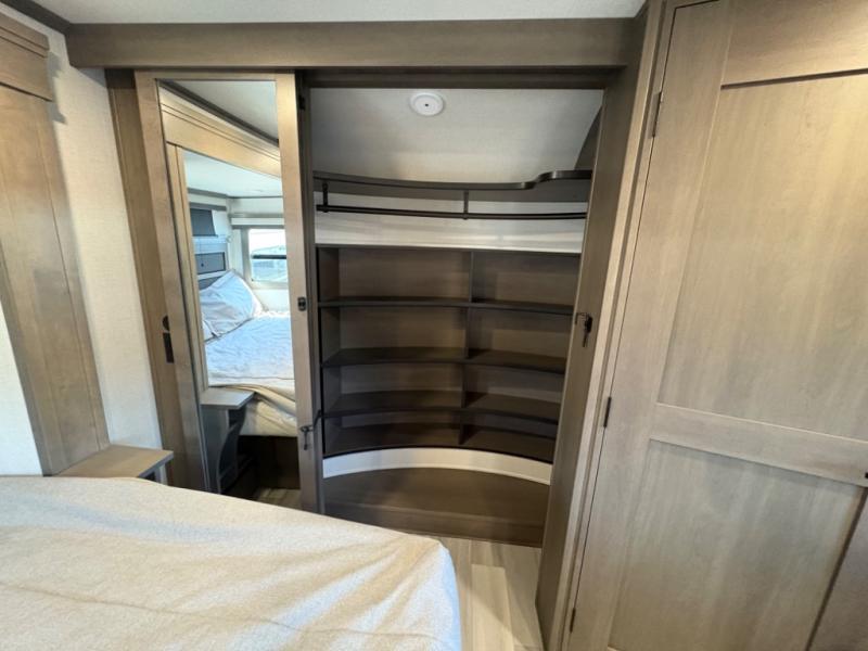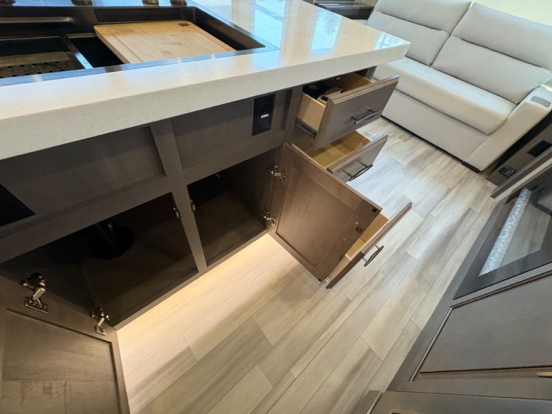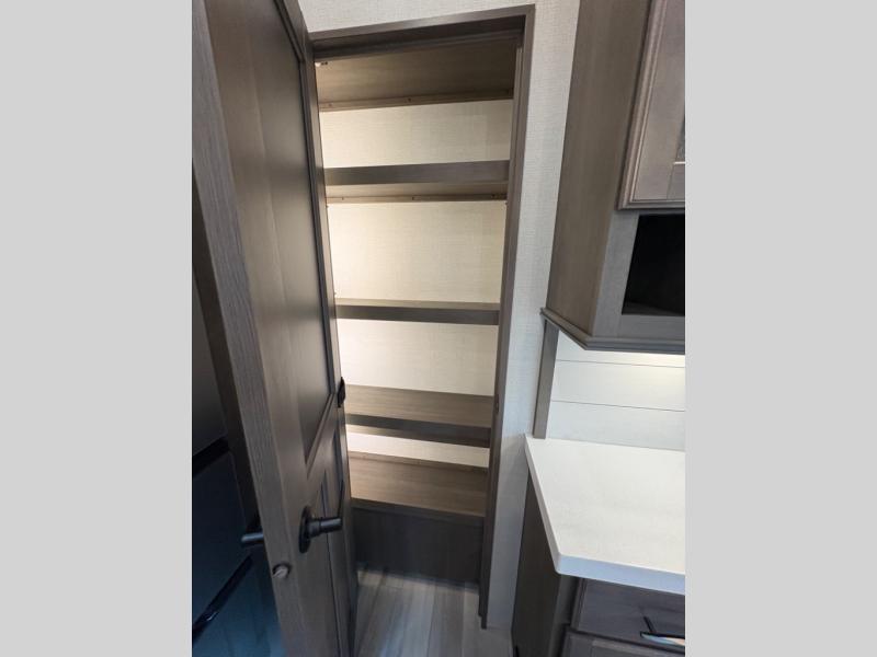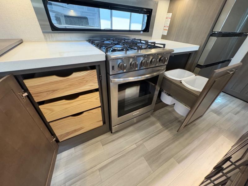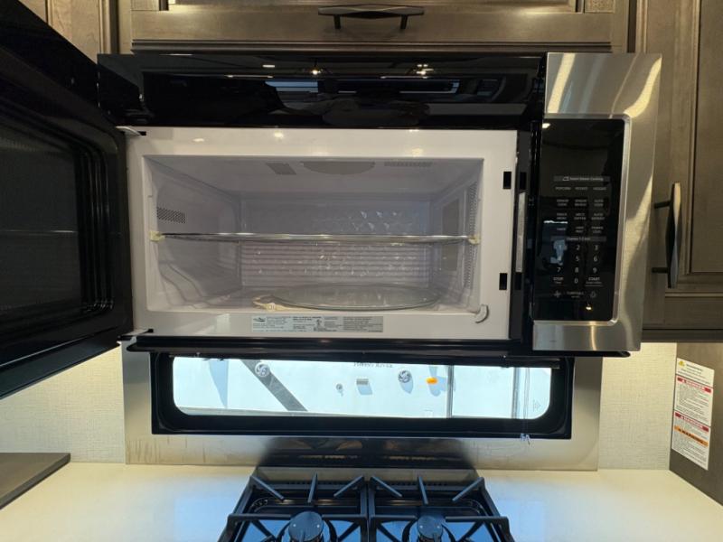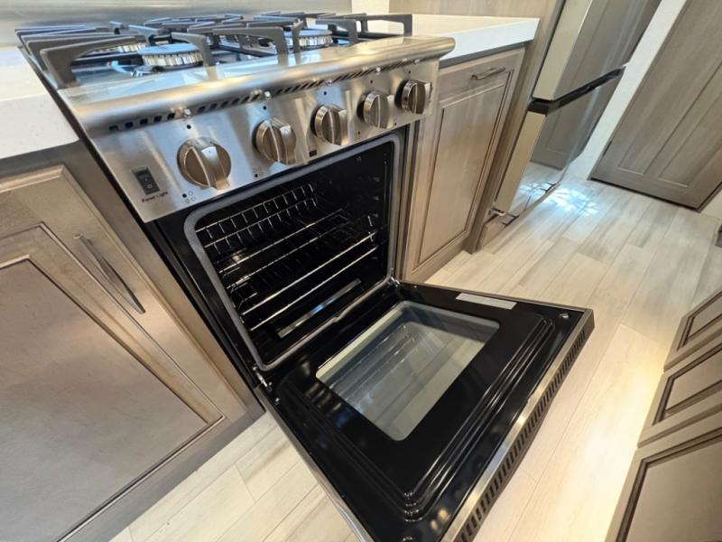 Traveling for long periods at a time is made easy with this gourmet kitchen that can feed your entire group a holiday meal! The professional-grade stainless steel cooktop with a built-in 24" residential oven, microwave, 12V 20 cu. ft. refrigerator, and a kitchen island offers everything you will need to enjoy cooking for your family and guests. There is abundant storage throughout multiple overhead cabinets, a kitchen pantry and hutch, shoe storage under the interior steps, a bath linen cabinet for your towels, and in the front master bedroom which features a large closet. In the bedroom there is also a queen bed on a slide for added space to sleep comfortable at night, or you may choose an optional king bed if you enjoy more space. You will also find a closet with washer/dryer prep, large wardrobe, plus a flip-top dresser with an LED TV above. In the bathroom, enjoy a hot shower with a flip-up teak seat and overhead skylight, plus a vanity with sink. Two nice awnings will provide outdoor living space keeping you protected from the sun and rain, and you can add an optional pull-out kitchen to enjoy convenient cooking outdoors as well.