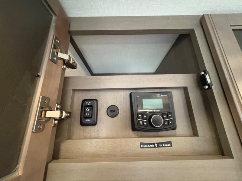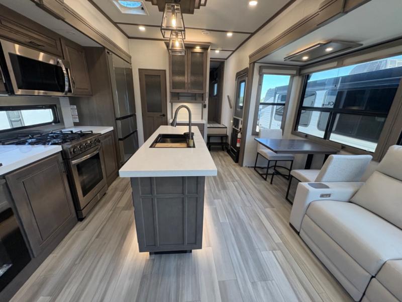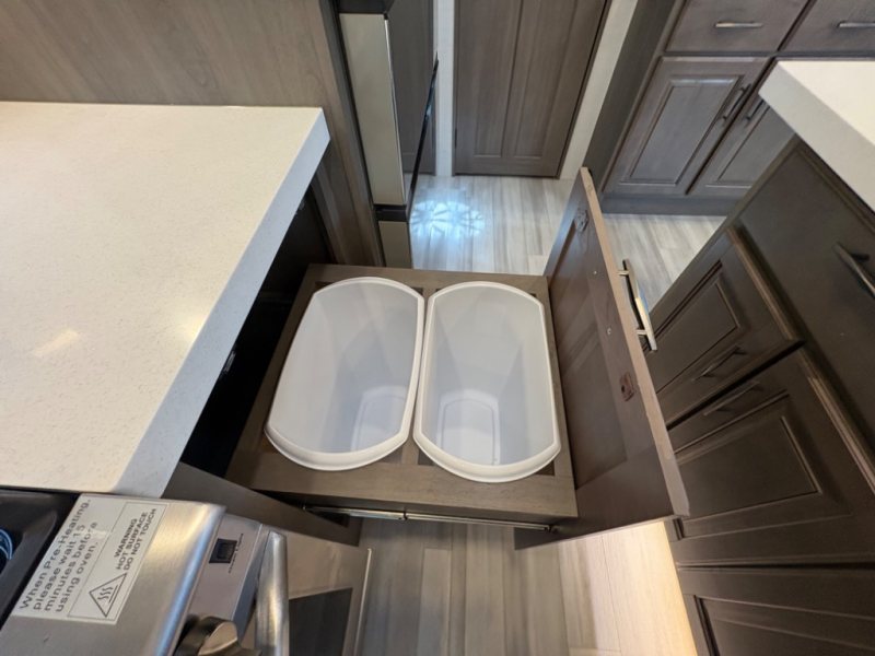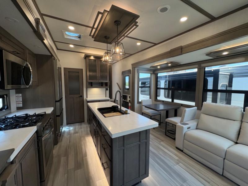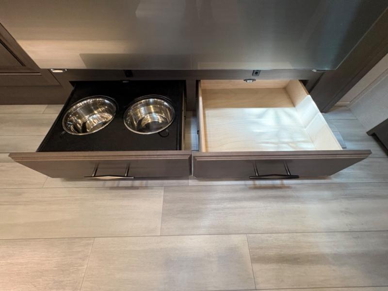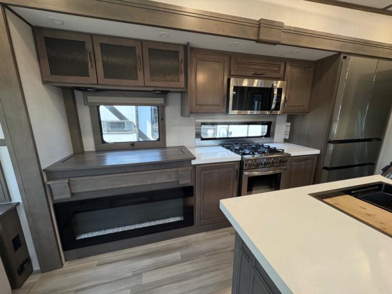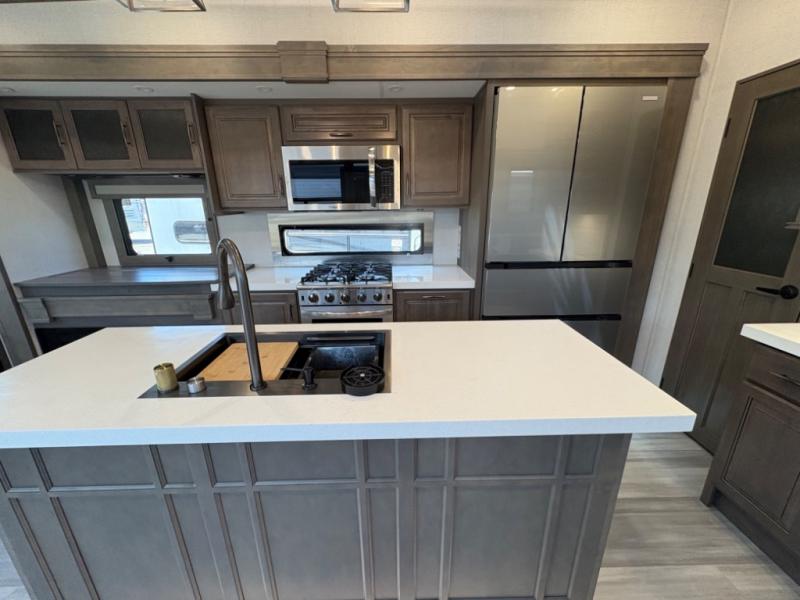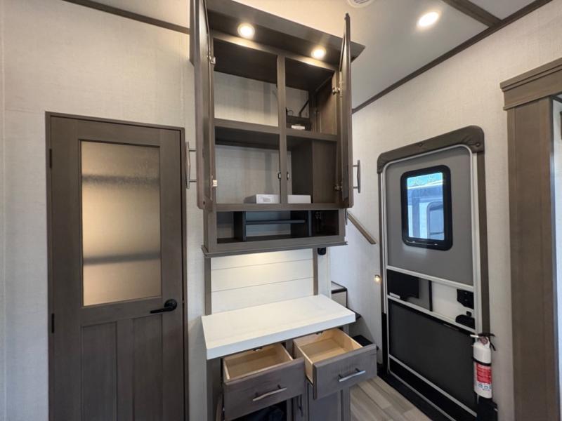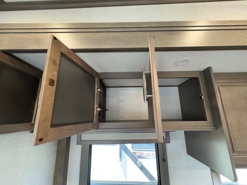 Traveling for long periods at a time is made easy with this gourmet kitchen that can feed your entire group a holiday meal! The professional-grade stainless steel cooktop with a built-in 24" residential oven, microwave, 12V 20 cu. ft. refrigerator, and a kitchen island offers everything you will need to enjoy cooking for your family and guests. There is abundant storage throughout multiple overhead cabinets, a kitchen pantry and hutch, shoe storage under the interior steps, a bath linen cabinet for your towels, and in the front master bedroom which features a large closet. In the bedroom there is also a queen bed on a slide for added space to sleep comfortable at night, or you may choose an optional king bed if you enjoy more space. You will also find a closet with washer/dryer prep, large wardrobe, plus a flip-top dresser with an LED TV above. In the bathroom, enjoy a hot shower with a flip-up teak seat and overhead skylight, plus a vanity with sink. Two nice awnings will provide outdoor living space keeping you protected from the sun and rain, and you can add an optional pull-out kitchen to enjoy convenient cooking outdoors as well.