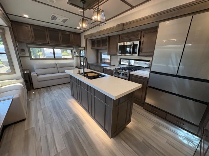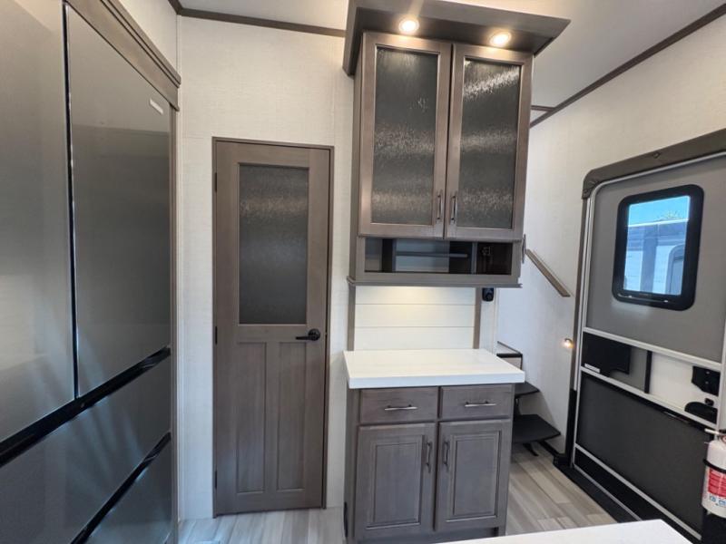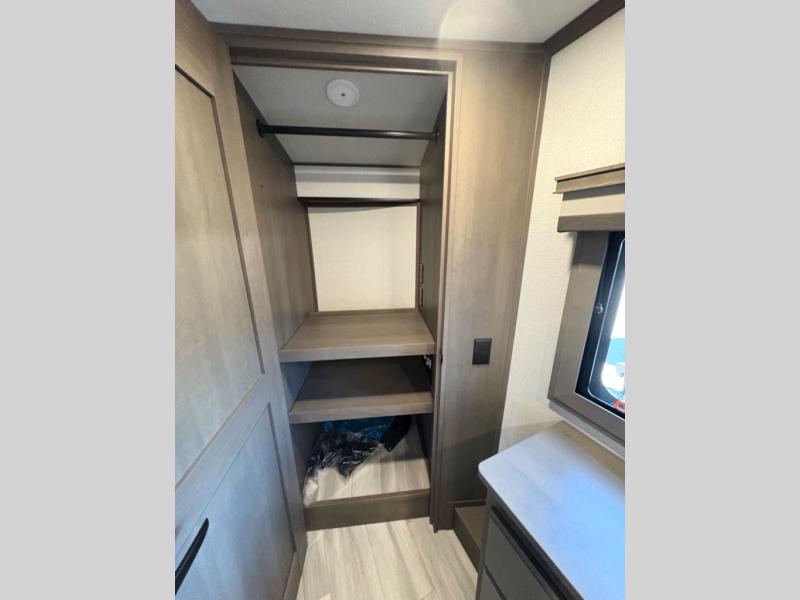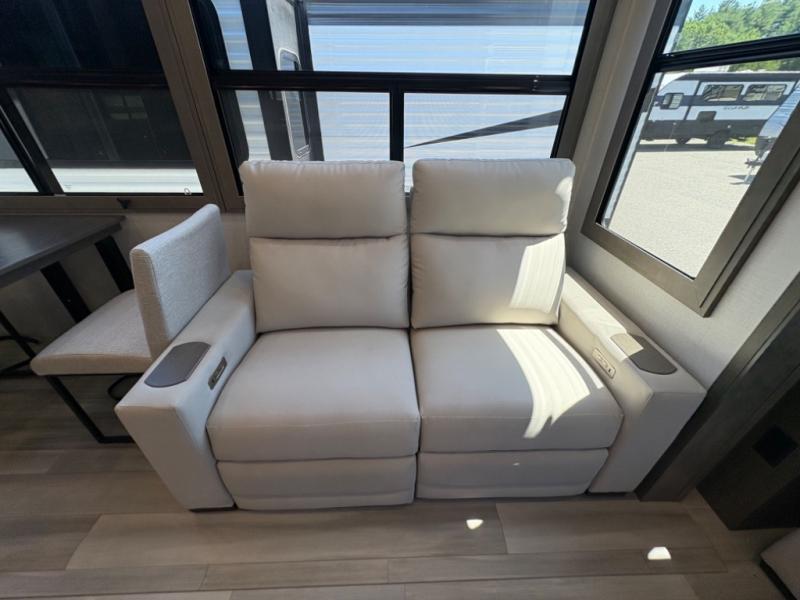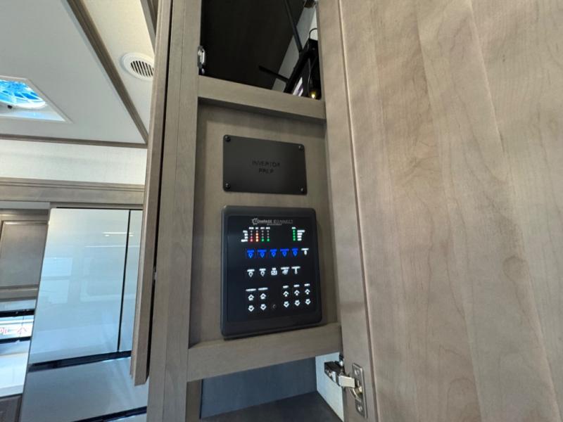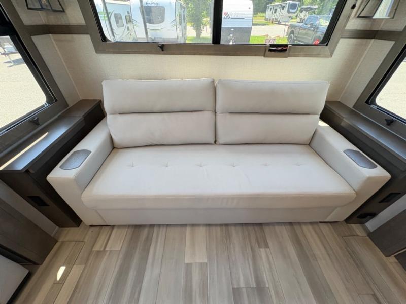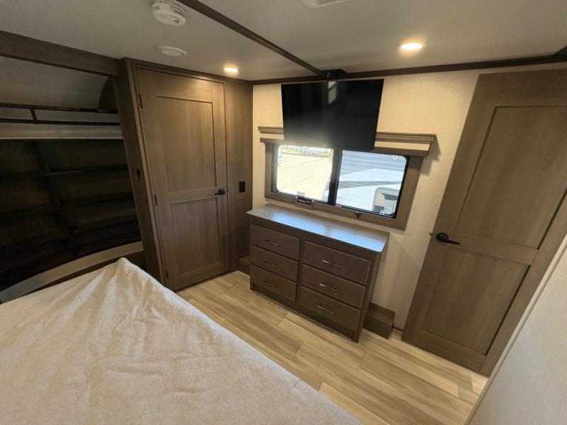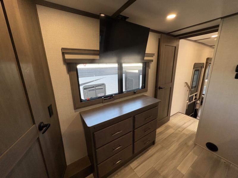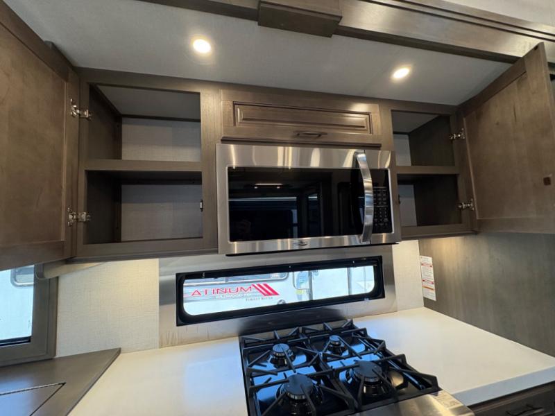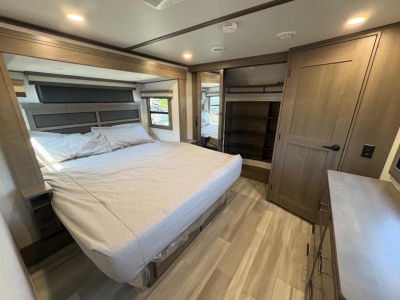 Traveling for long periods at a time is made easy with this gourmet kitchen that can feed your entire group a holiday meal! The professional-grade stainless steel cooktop with a built-in 24" residential oven, microwave, 12V 20 cu. ft. refrigerator, and a kitchen island offers everything you will need to enjoy cooking for your family and guests. There is abundant storage throughout multiple overhead cabinets, a kitchen pantry and hutch, shoe storage under the interior steps, a bath linen cabinet for your towels, and in the front master bedroom which features a large closet. In the bedroom there is also a queen bed on a slide for added space to sleep comfortable at night, or you may choose an optional king bed if you enjoy more space. You will also find a closet with washer/dryer prep, large wardrobe, plus a flip-top dresser with an LED TV above. In the bathroom, enjoy a hot shower with a flip-up teak seat and overhead skylight, plus a vanity with sink. Two nice awnings will provide outdoor living space keeping you protected from the sun and rain, and you can add an optional pull-out kitchen to enjoy convenient cooking outdoors as well.