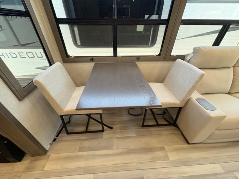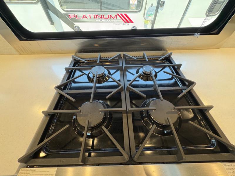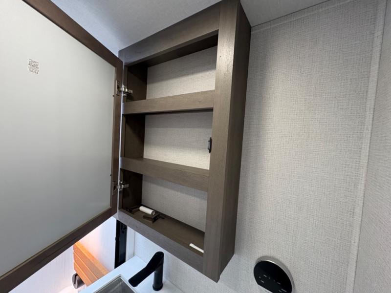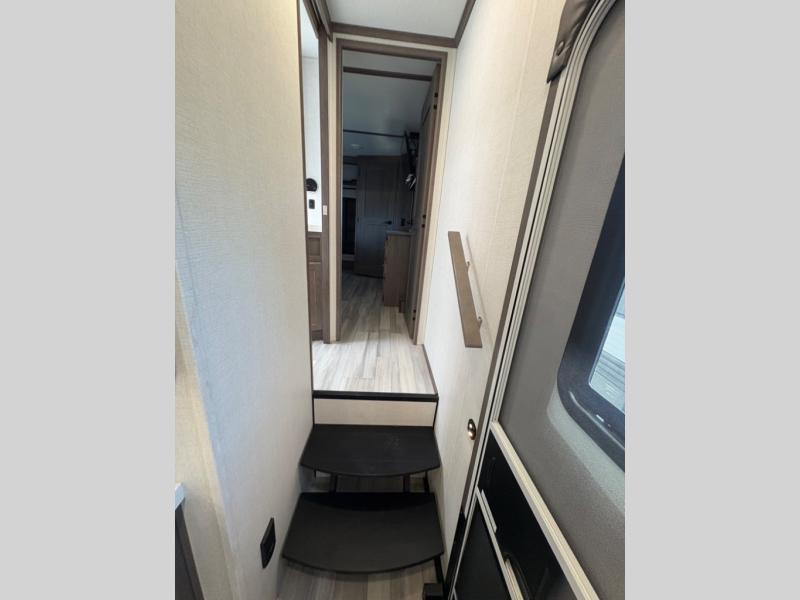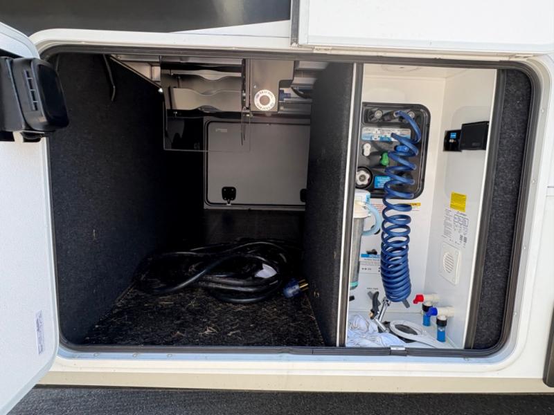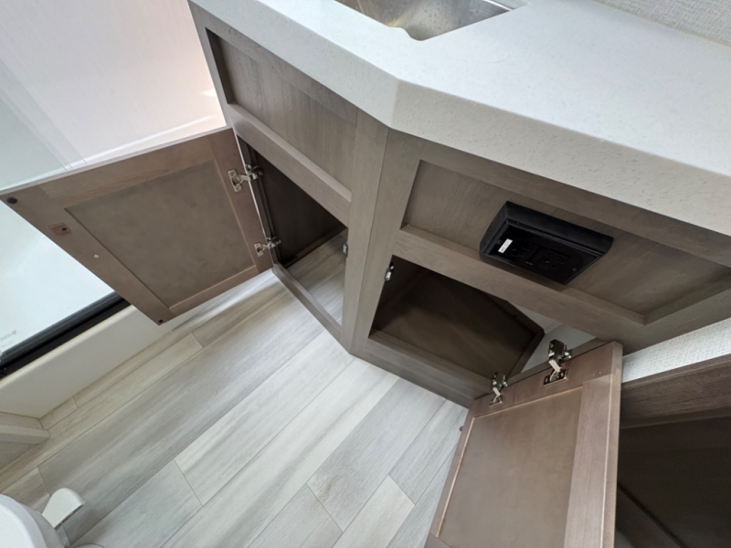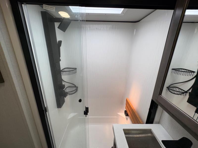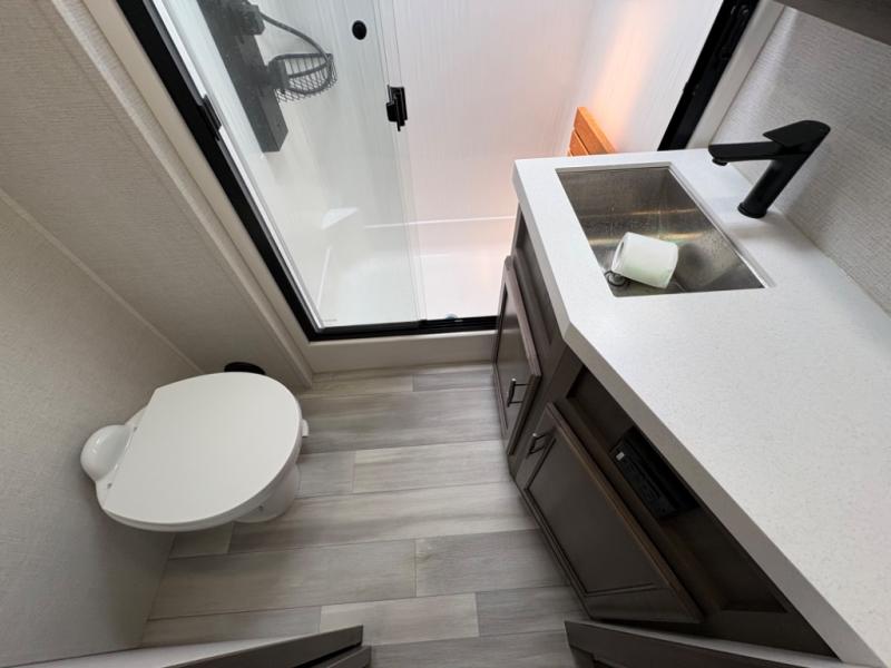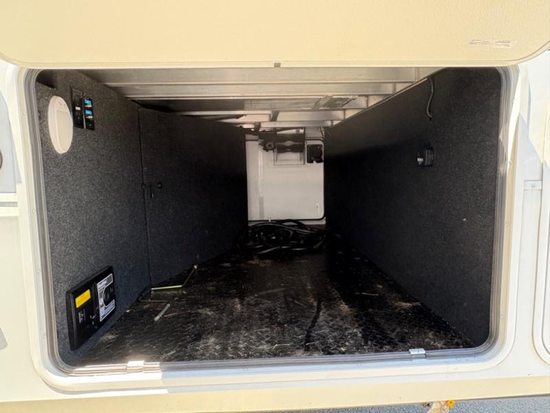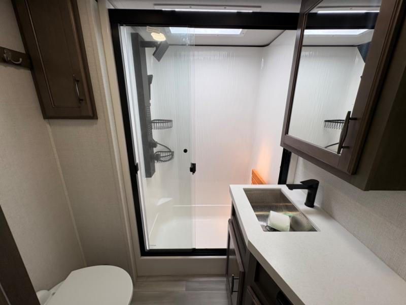 Traveling for long periods at a time is made easy with this gourmet kitchen that can feed your entire group a holiday meal! The professional-grade stainless steel cooktop with a built-in 24" residential oven, microwave, 12V 20 cu. ft. refrigerator, and a kitchen island offers everything you will need to enjoy cooking for your family and guests. There is abundant storage throughout multiple overhead cabinets, a kitchen pantry and hutch, shoe storage under the interior steps, a bath linen cabinet for your towels, and in the front master bedroom which features a large closet. In the bedroom there is also a queen bed on a slide for added space to sleep comfortable at night, or you may choose an optional king bed if you enjoy more space. You will also find a closet with washer/dryer prep, large wardrobe, plus a flip-top dresser with an LED TV above. In the bathroom, enjoy a hot shower with a flip-up teak seat and overhead skylight, plus a vanity with sink. Two nice awnings will provide outdoor living space keeping you protected from the sun and rain, and you can add an optional pull-out kitchen to enjoy convenient cooking outdoors as well.