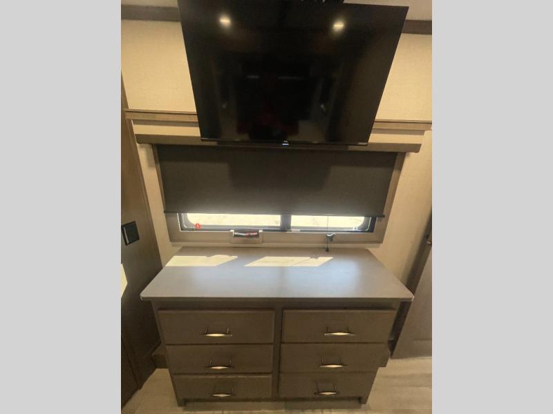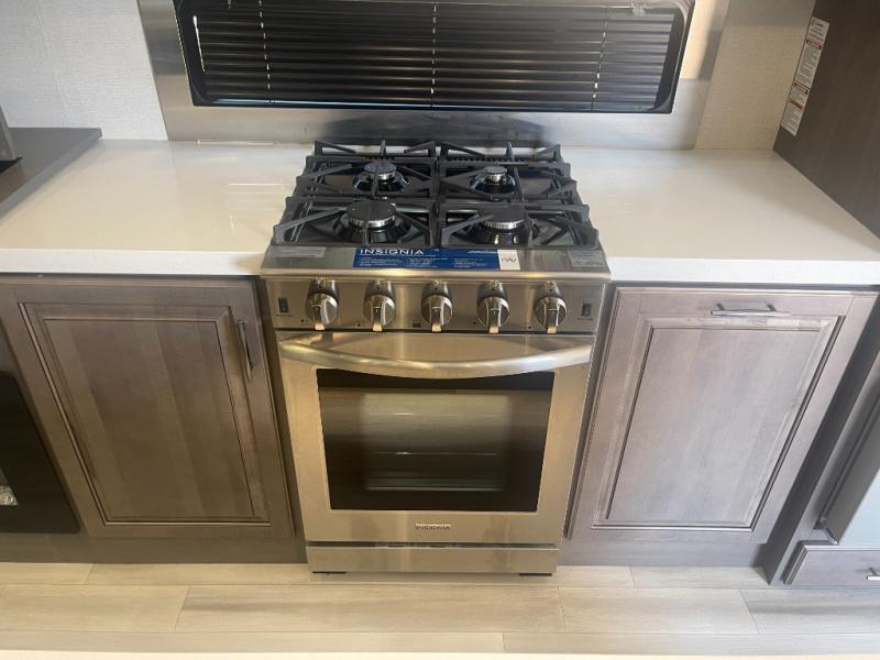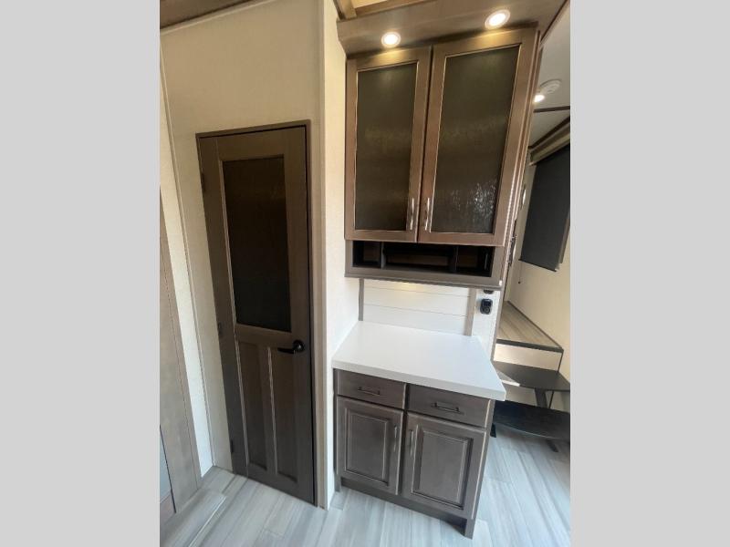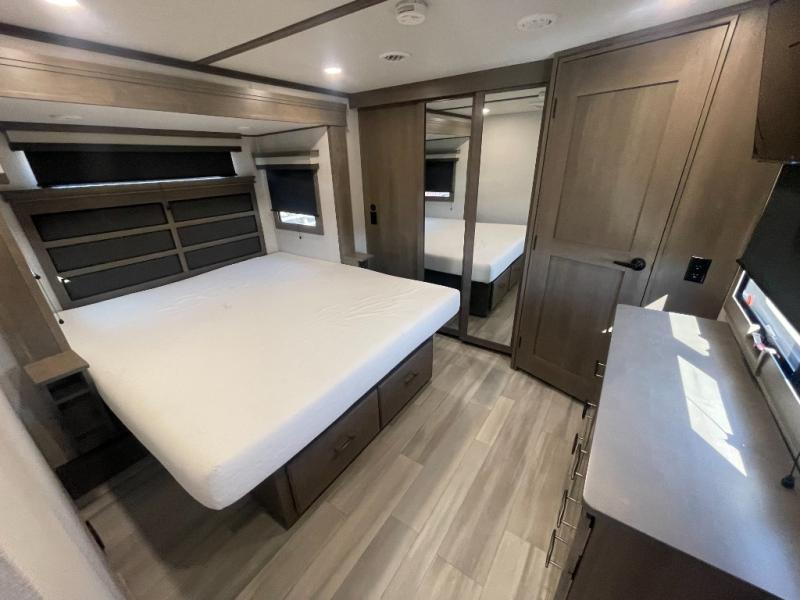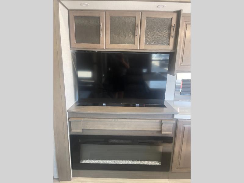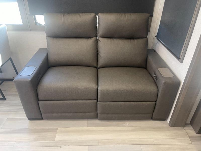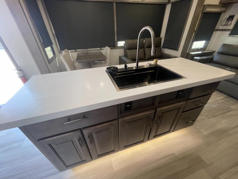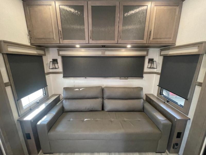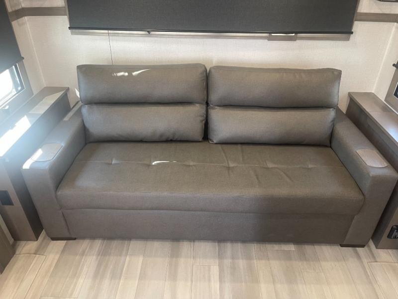 Are you looking to upgrade from a travel trailer to a fifth wheel? If so, this model will be perfect for you! Once you arrive at the campground, you can unload your gear from the pass-through storage, put out the two power awnings, then relax with a cold drink. Inside, you can kick your feet up on the theater seating, play a game at the free-standing dinette, or relax on the tri-fold sofa. The chef of your group will have a kitchen island with a Smart sink, dishwasher prep if you want the option to make cleaning up easier, plus a spacious 20 cu. ft. 12V refrigerator. There is also a 24" residential oven, convenient pull-out trash cans, plus a pantry and a hutch for storage galore! Having two bath sinks in the full bath is sure to be a big convenience when getting ready for bed, and the queen bed slide out (king bed optional) in the front bedroom will provide a great night's rest. You will also find a front wardrobe, a slide-top dresser with an LED TV, plus washer/dryer prep!