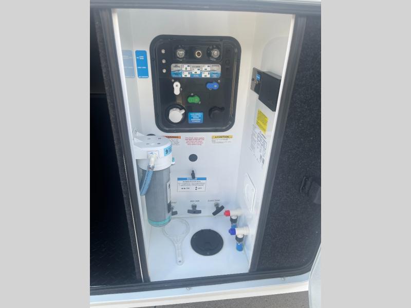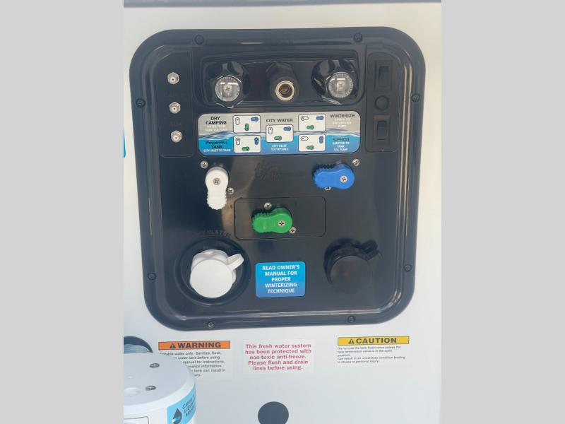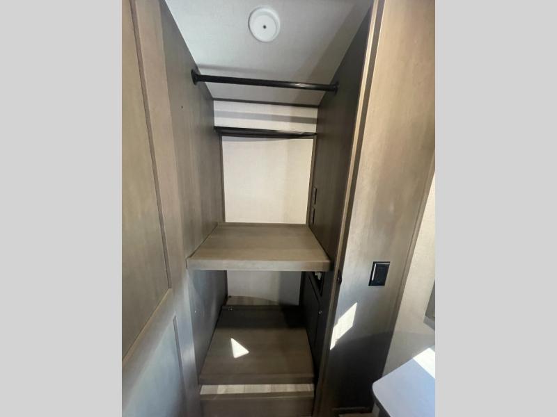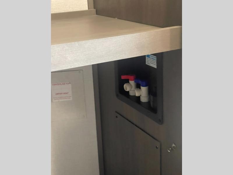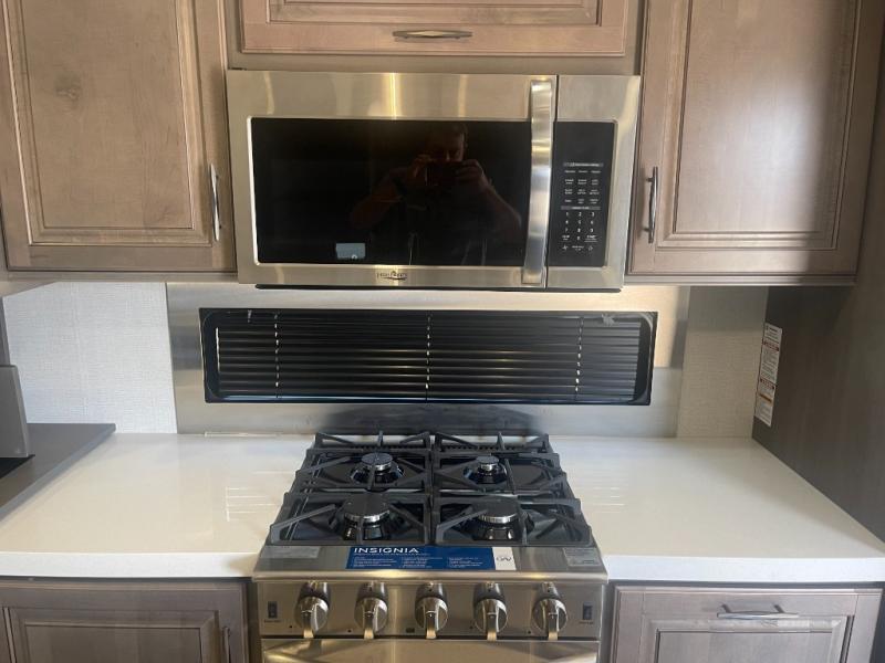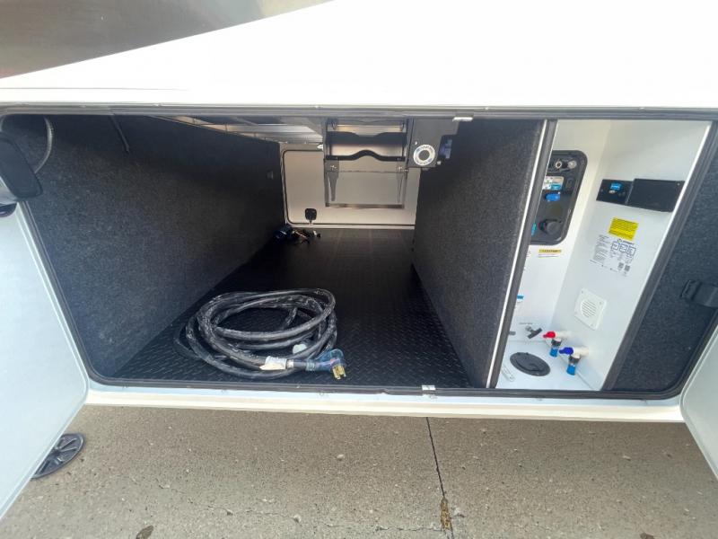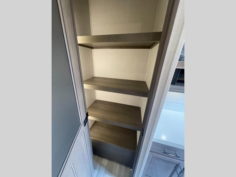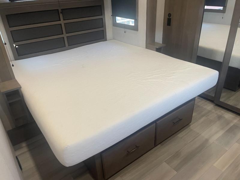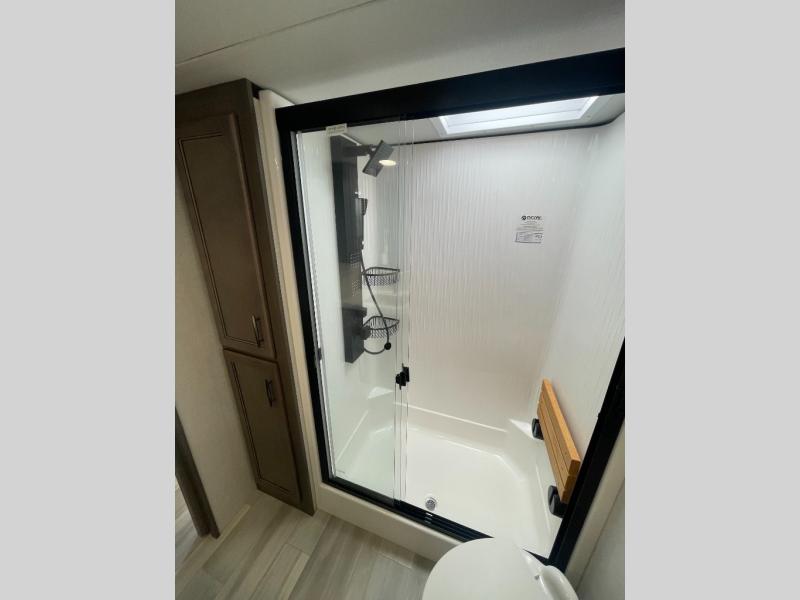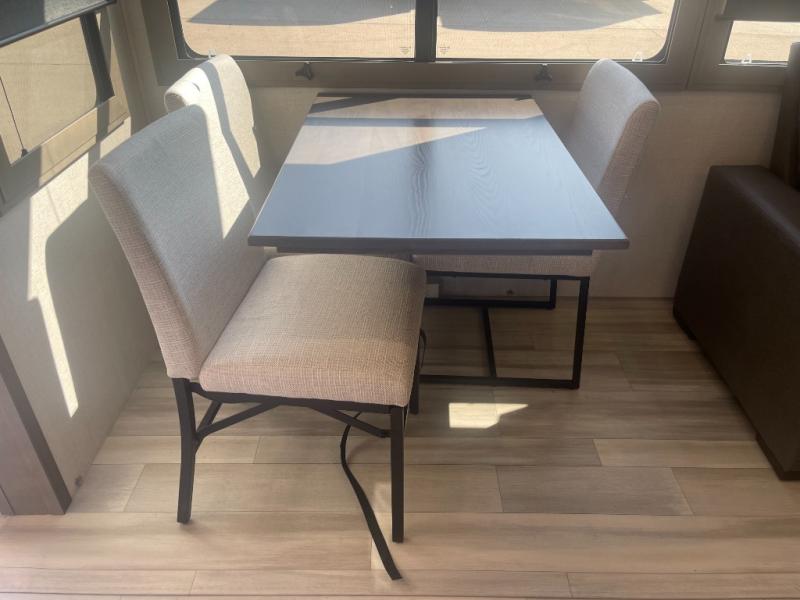 Are you looking to upgrade from a travel trailer to a fifth wheel? If so, this model will be perfect for you! Once you arrive at the campground, you can unload your gear from the pass-through storage, put out the two power awnings, then relax with a cold drink. Inside, you can kick your feet up on the theater seating, play a game at the free-standing dinette, or relax on the tri-fold sofa. The chef of your group will have a kitchen island with a Smart sink, dishwasher prep if you want the option to make cleaning up easier, plus a spacious 20 cu. ft. 12V refrigerator. There is also a 24" residential oven, convenient pull-out trash cans, plus a pantry and a hutch for storage galore! Having two bath sinks in the full bath is sure to be a big convenience when getting ready for bed, and the queen bed slide out (king bed optional) in the front bedroom will provide a great night's rest. You will also find a front wardrobe, a slide-top dresser with an LED TV, plus washer/dryer prep!