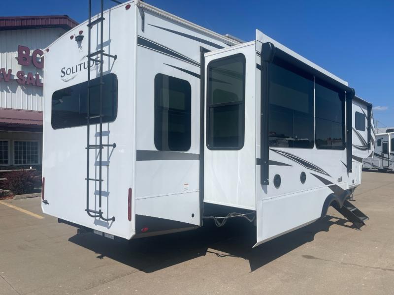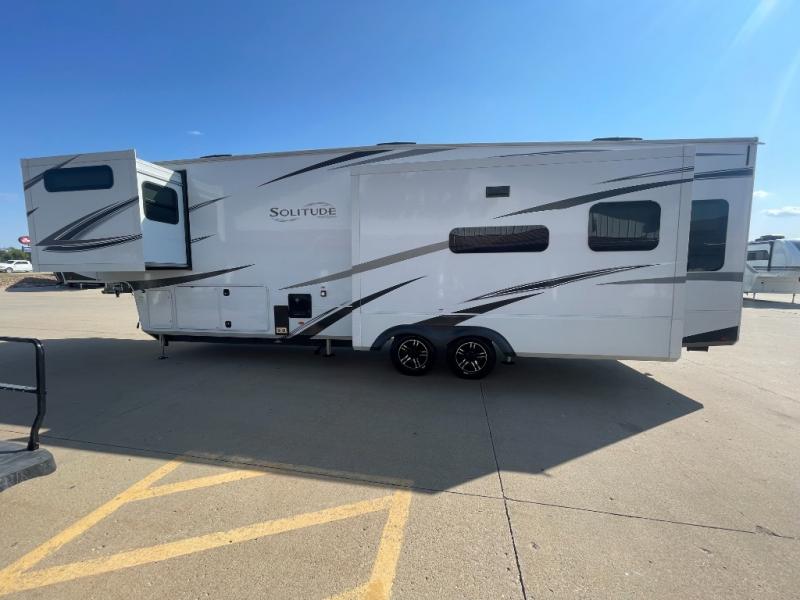 Each Solitude fifth wheel by Grand Design features a 101" wide-body construction, heavy duty 7,000 lb. axles, frameless tinted windows, and high-gloss gel coat sidewalls. You can camp year around thanks to the Weather-Tek Package that includes a 35K BTU high-capacity furnace, an all-in-one enclosed and heated utility center, and a fully enclosed underbelly with heated tanks and storage. Inside, you'll love the premium roller shades, hardwood cabinet doors, solid surface countertops and sinks, plus residential finishes throughout to make you truly feel at home. Each model also includes a MORryde CRE3000 suspension system, self adjusting brakes, and a MORryde pin box that will provide smooth towing from home to campground. Affordable luxury is possible with the Solitude fifth wheels; choose yours today!