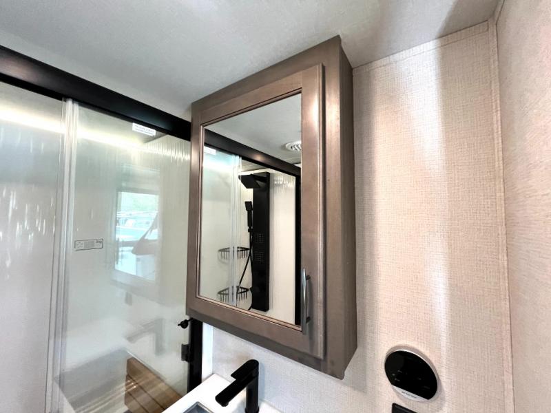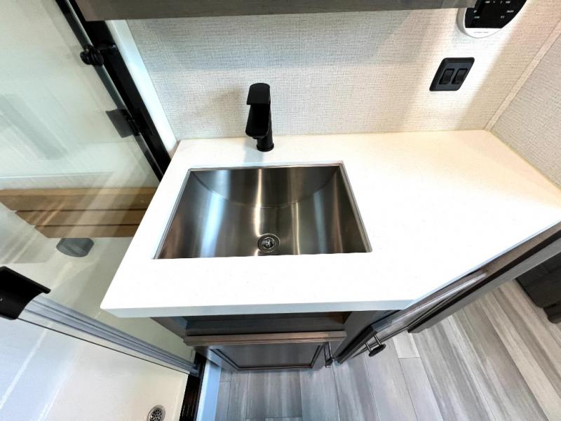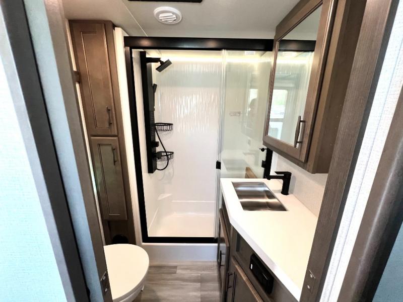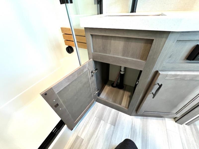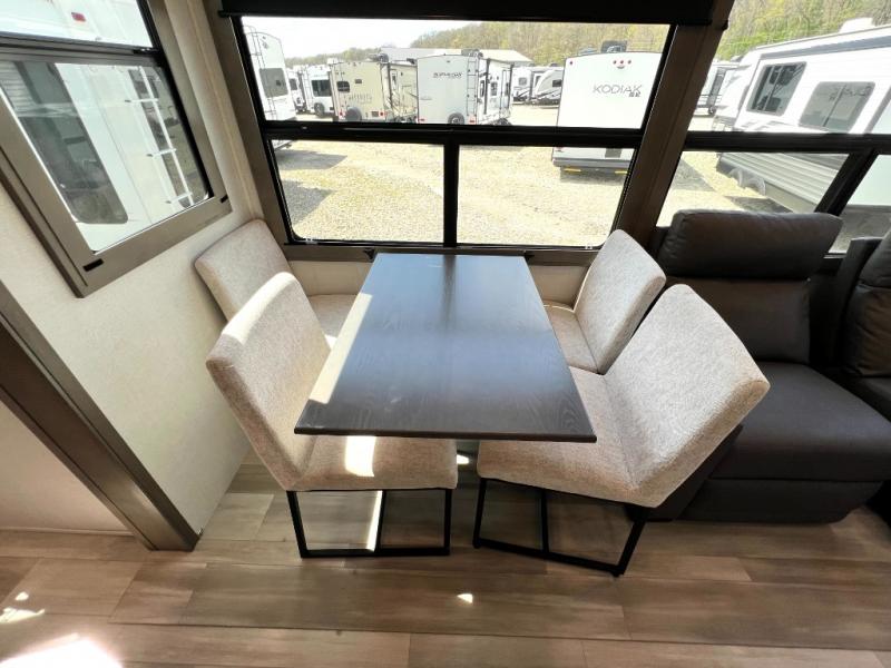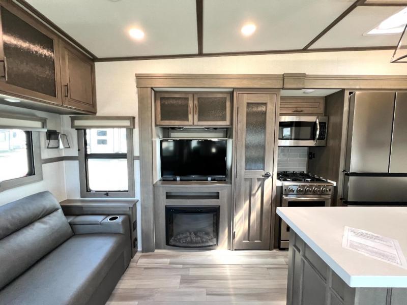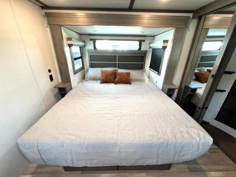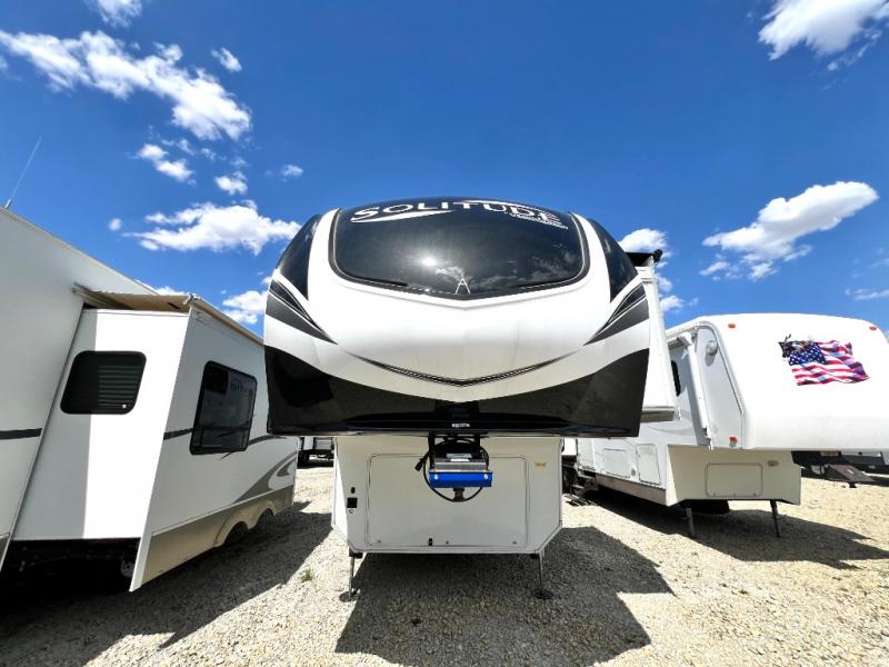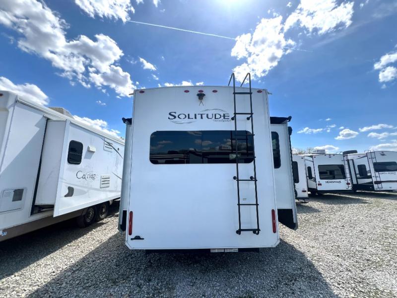 Each Solitude fifth wheel by Grand Design features a 101" wide-body construction, heavy duty 7,000 lb. axles, frameless tinted windows, and high-gloss gel coat sidewalls. You can camp year around thanks to the Weather-Tek Package that includes a 35K BTU high-capacity furnace, an all-in-one enclosed and heated utility center, and a fully enclosed underbelly with heated tanks and storage. Inside, you'll love the premium roller shades, hardwood cabinet doors, solid surface countertops and sinks, plus residential finishes throughout to make you truly feel at home. Each model also includes a MORryde CRE3000 suspension system, self adjusting brakes, and a MORryde pin box that will provide smooth towing from home to campground. Affordable luxury is possible with the Solitude fifth wheels; choose yours today!