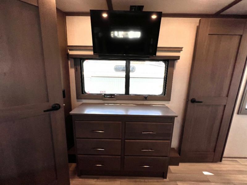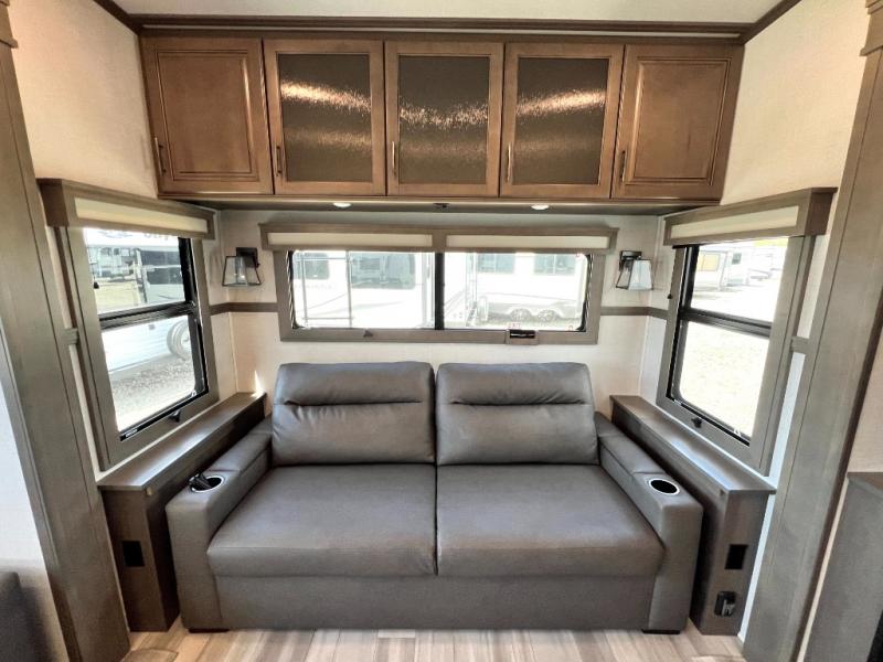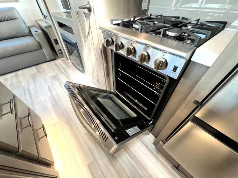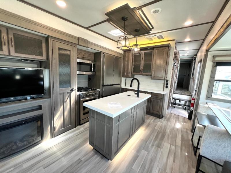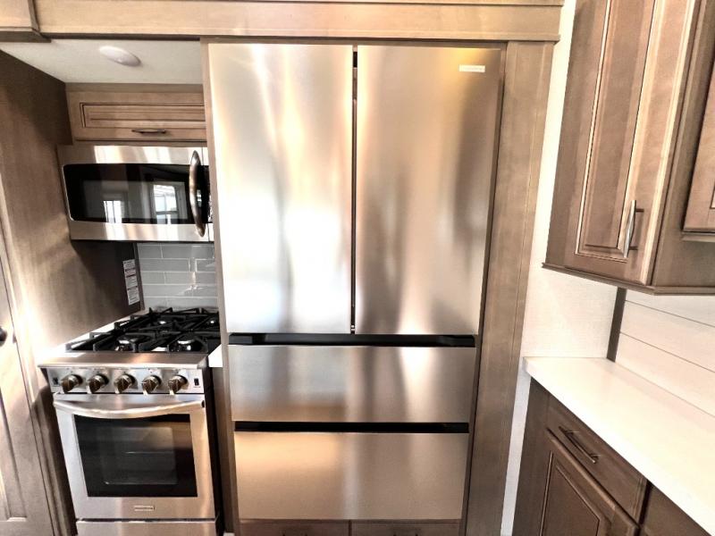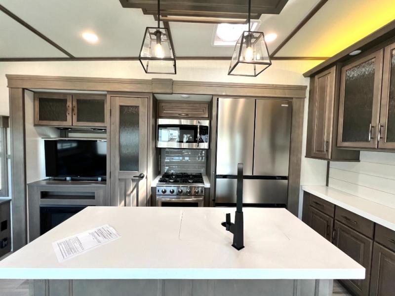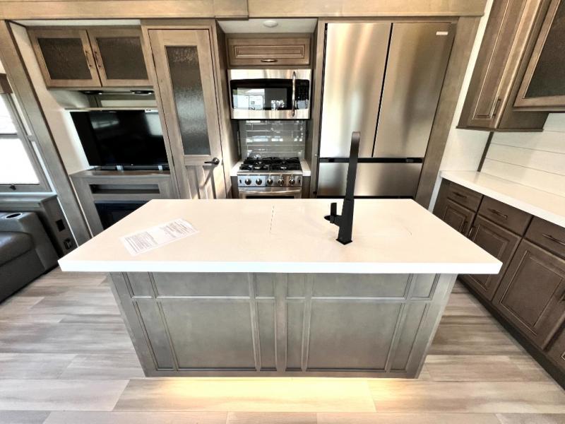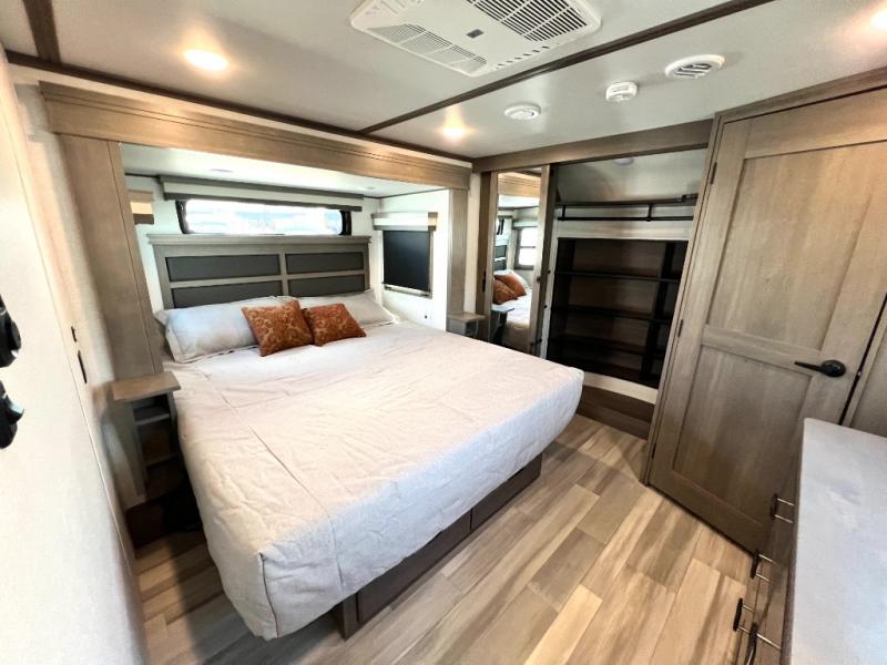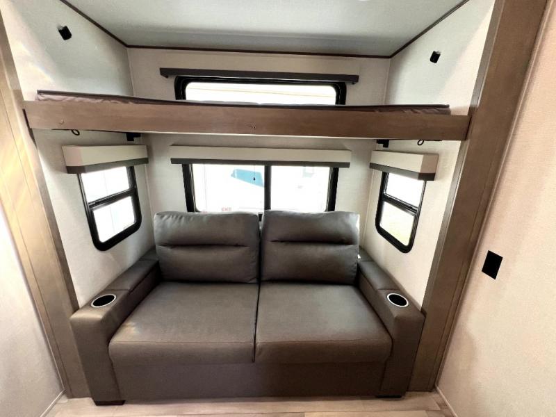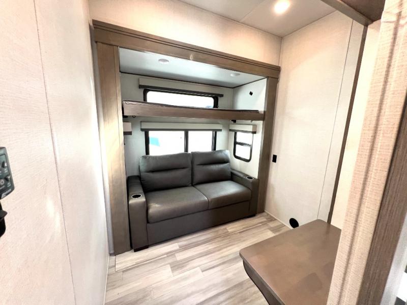 The middle bunkhouse in this fifth wheel includes a fold down bunk above a tri-fold sofa which offers seating for extra living space as well as sleeping space for a bedroom. There is also a desk to work from and a closet for clothing and supplies making this room multi-functional. The front master bedroom features a queen bed slide or you can choose the king option, an LED TV, and a large closet as well as a washer/dryer prep. The main combined living and kitchen area is spacious with dual opposing slides and offers theatre seating and a tri-fold sofa to relax on while watching the LED Smart TV allowing you to visit with the cook in the kitchen while preparing meals. This chef kitchen offers an island with prep space and a sink, a 24" residential oven, a 20 cu. ft. refrigerator, and an oversized pantry to store lots of dry goods and snacks. You will surely enjoy the two power awnings and the outside grill plus beverage cooler while relaxing outdoors.