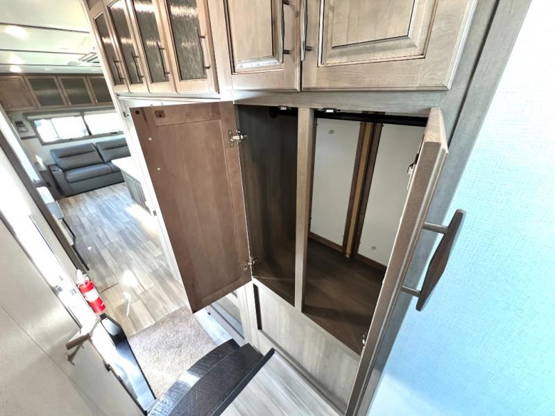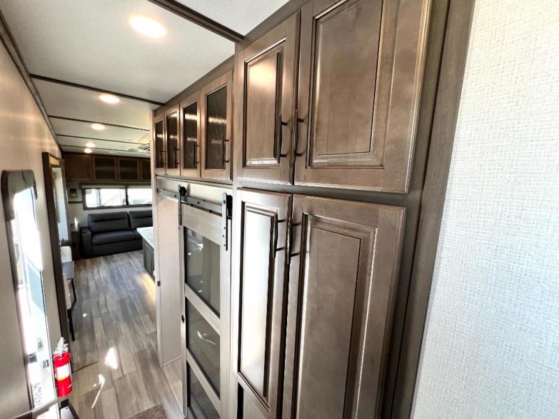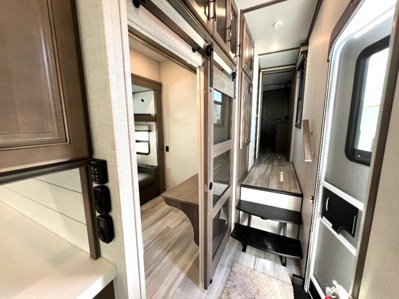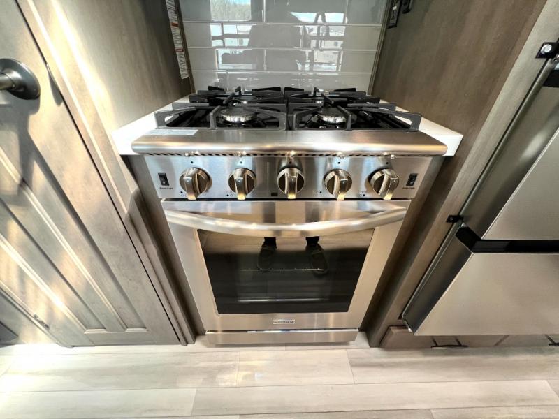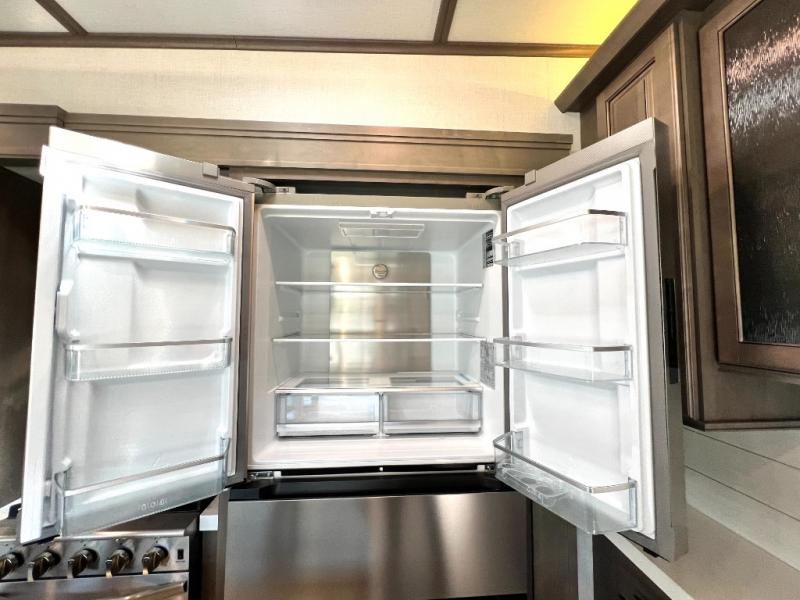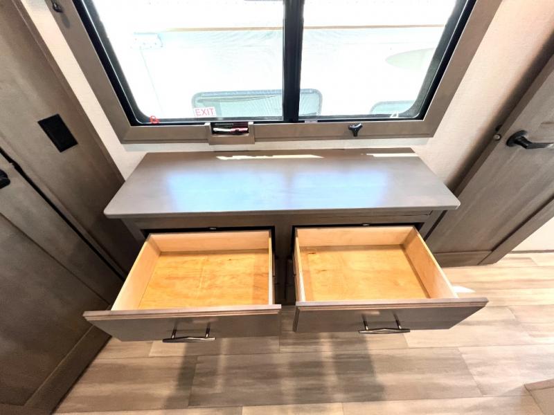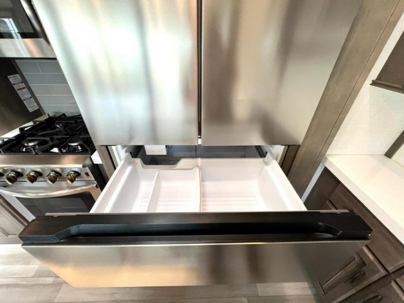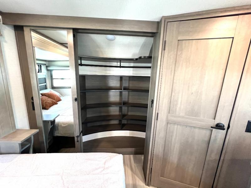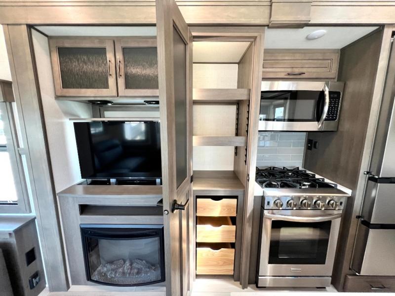 The middle bunkhouse in this fifth wheel includes a fold down bunk above a tri-fold sofa which offers seating for extra living space as well as sleeping space for a bedroom. There is also a desk to work from and a closet for clothing and supplies making this room multi-functional. The front master bedroom features a queen bed slide or you can choose the king option, an LED TV, and a large closet as well as a washer/dryer prep. The main combined living and kitchen area is spacious with dual opposing slides and offers theatre seating and a tri-fold sofa to relax on while watching the LED Smart TV allowing you to visit with the cook in the kitchen while preparing meals. This chef kitchen offers an island with prep space and a sink, a 24" residential oven, a 20 cu. ft. refrigerator, and an oversized pantry to store lots of dry goods and snacks. You will surely enjoy the two power awnings and the outside grill plus beverage cooler while relaxing outdoors.