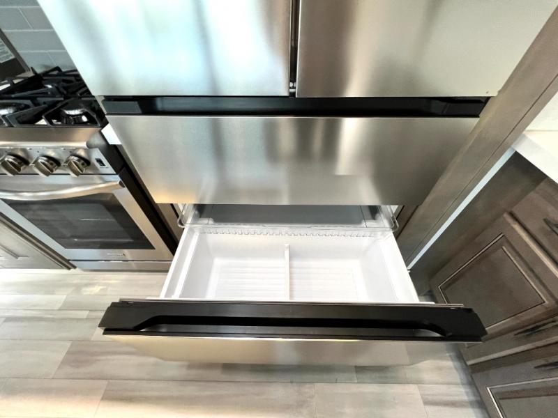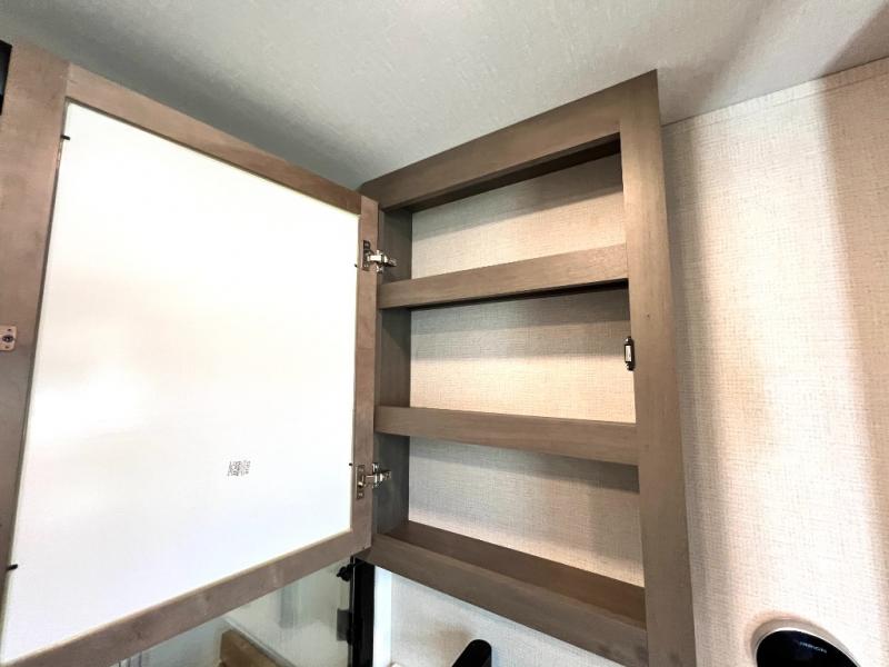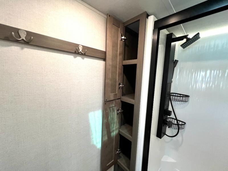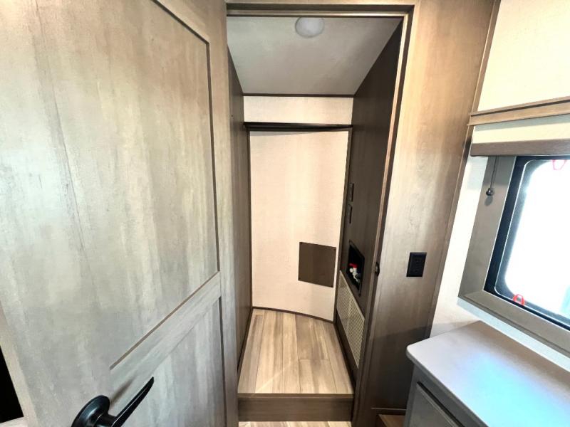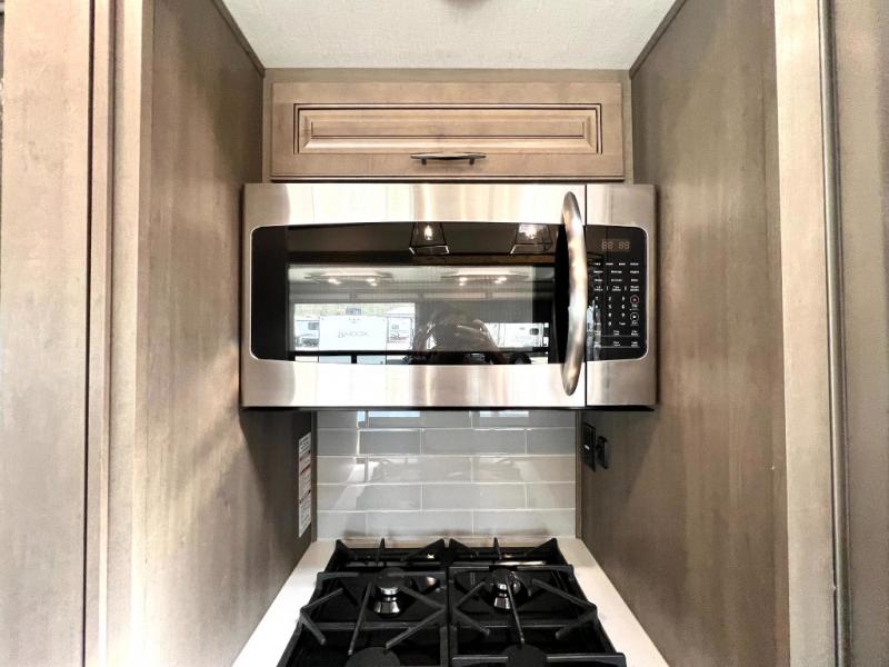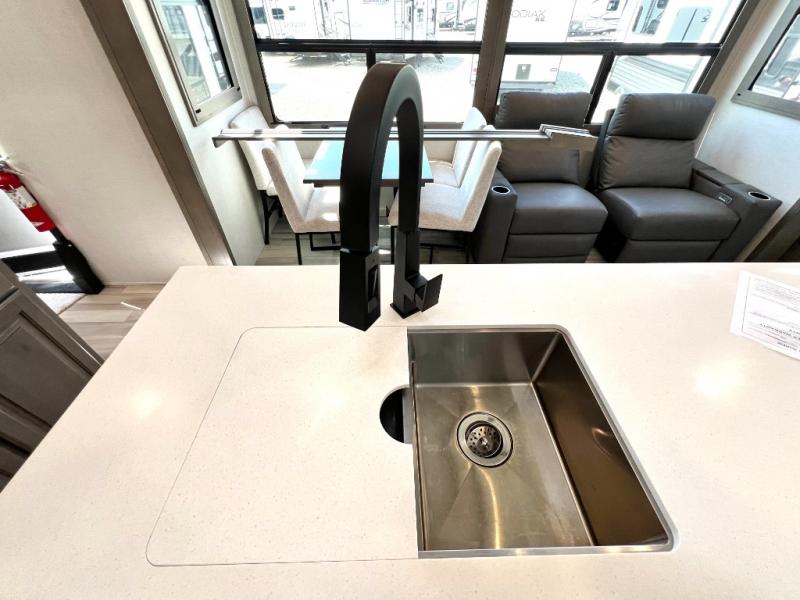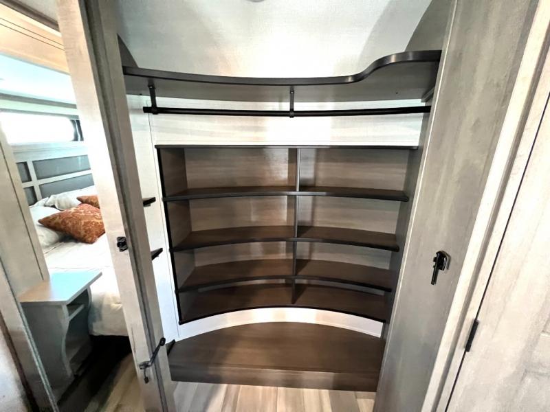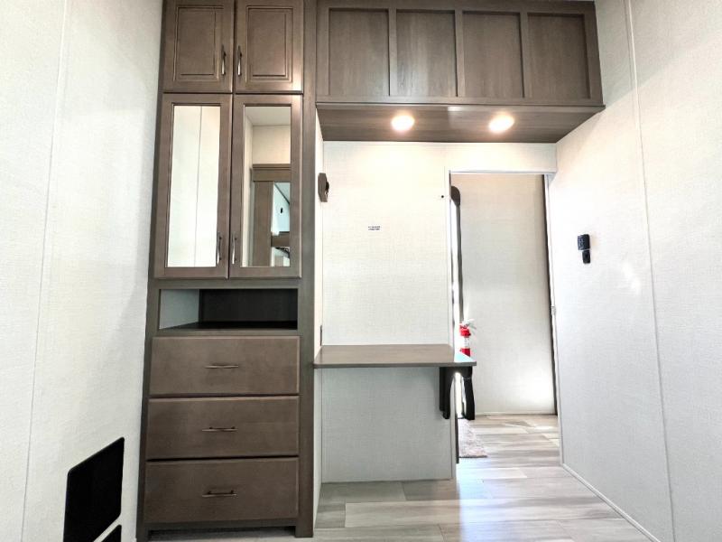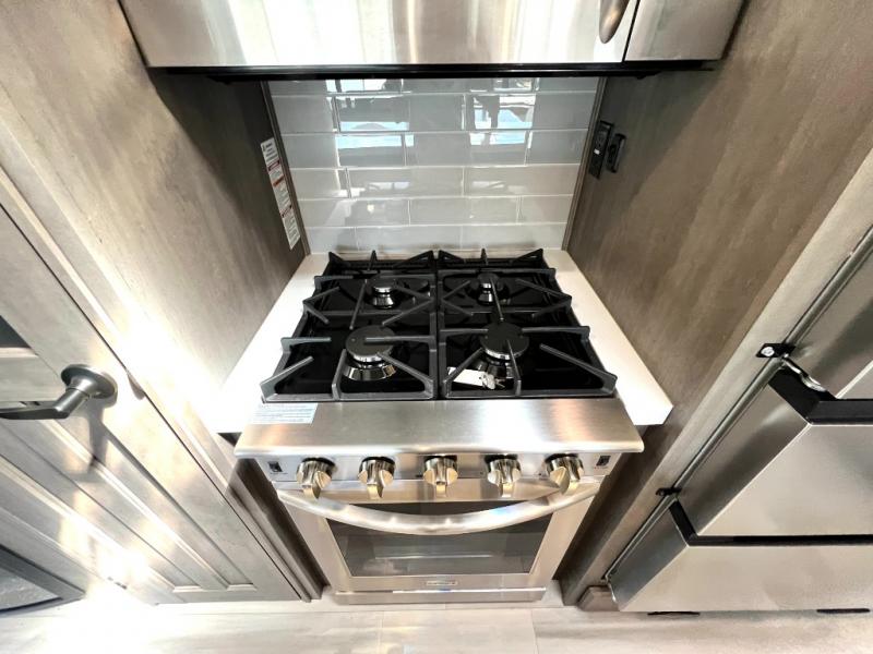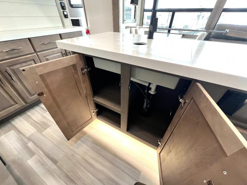 The middle bunkhouse in this fifth wheel includes a fold down bunk above a tri-fold sofa which offers seating for extra living space as well as sleeping space for a bedroom. There is also a desk to work from and a closet for clothing and supplies making this room multi-functional. The front master bedroom features a queen bed slide or you can choose the king option, an LED TV, and a large closet as well as a washer/dryer prep. The main combined living and kitchen area is spacious with dual opposing slides and offers theatre seating and a tri-fold sofa to relax on while watching the LED Smart TV allowing you to visit with the cook in the kitchen while preparing meals. This chef kitchen offers an island with prep space and a sink, a 24" residential oven, a 20 cu. ft. refrigerator, and an oversized pantry to store lots of dry goods and snacks. You will surely enjoy the two power awnings and the outside grill plus beverage cooler while relaxing outdoors.