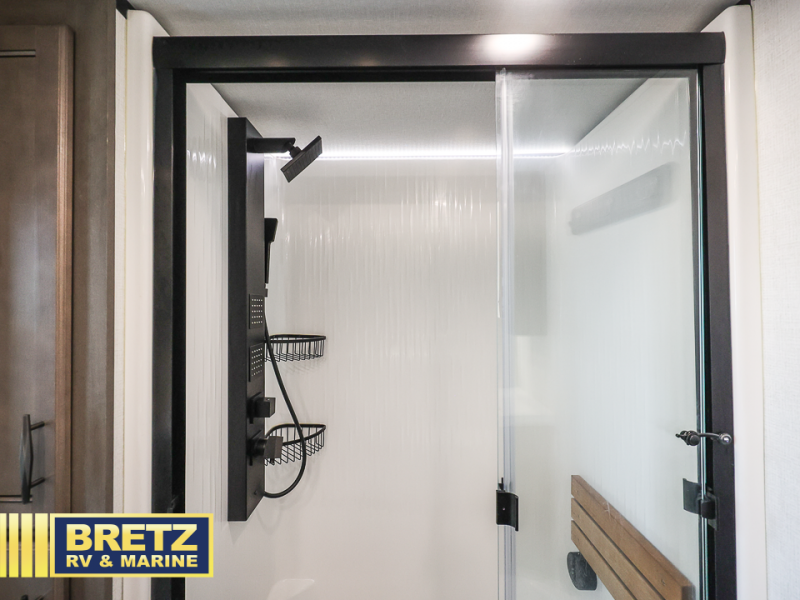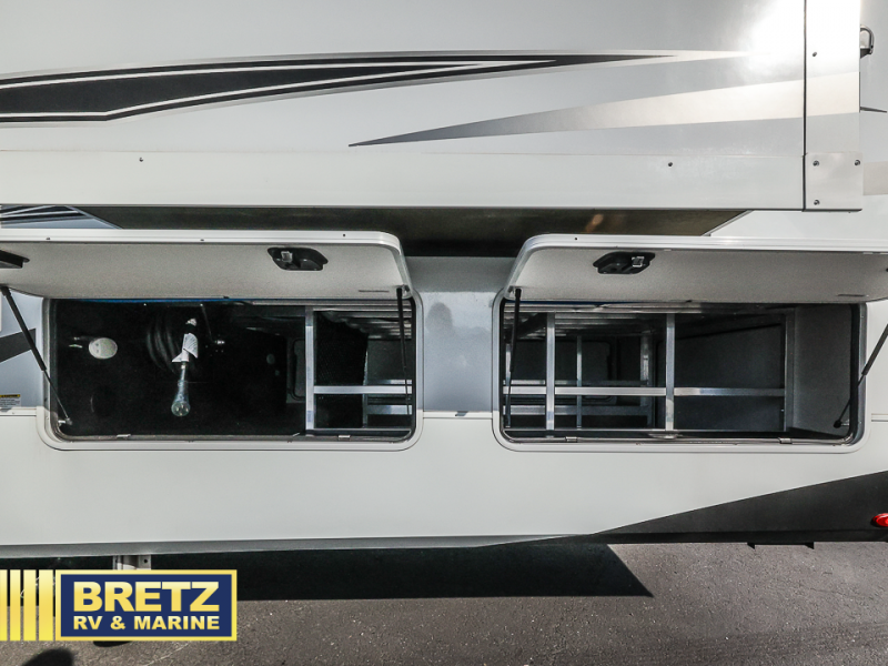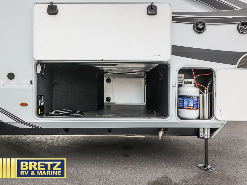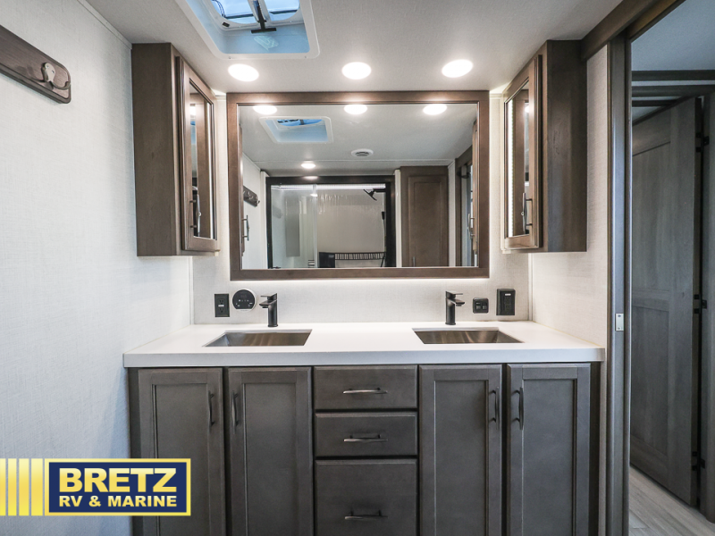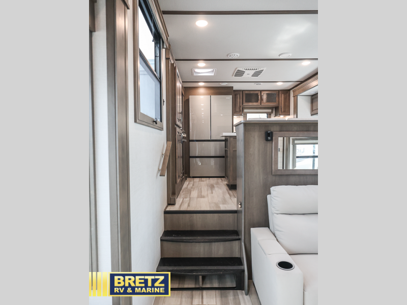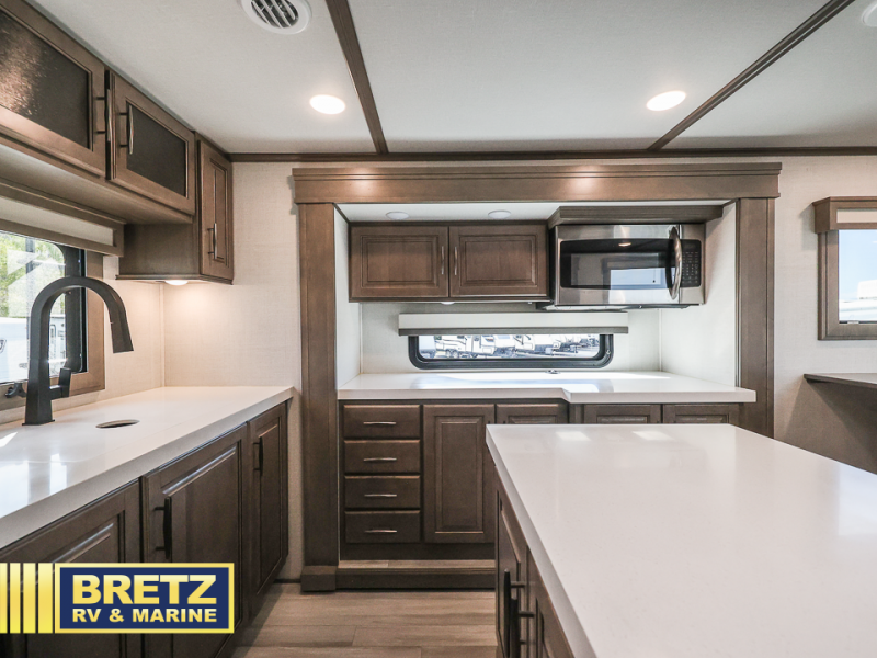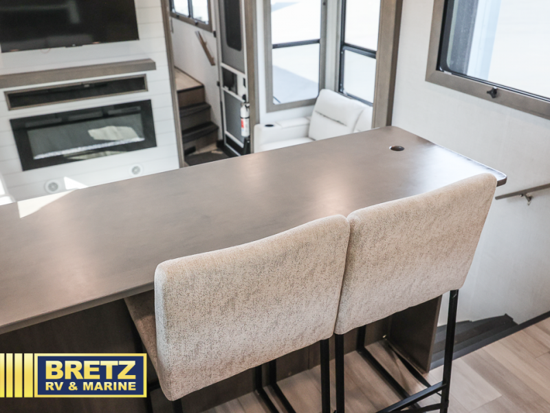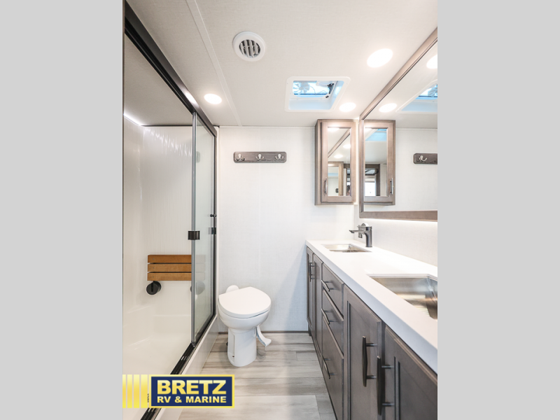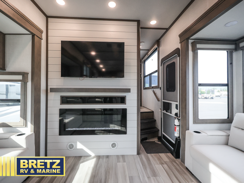 Enjoy each and every vacation, month-long trips, or even extended stays at an RV park in this spacious fifth wheel! The raised rear kitchen gives the cook plenty of room to whip up any type of meal using the stainless steel appliances including a 24" residential oven, an oversized pantry, and the raised bar top will provide you even more counter space on top of dining with two chairs that overlook the middle living area. Relaxing is made easy thanks to two tri-fold sofas and theatre seating while watching the big game on the LED Smart TV and enjoying the fireplace below. Dual sinks in the full bathroom allow two people to easily get ready at once, and the flip up teak seat in the shower is a nice convenience. At night, retire to your own queen bed which slides out to provide more floor space, and enjoy a show on the LED TV above the flip-top dresser once in bed.