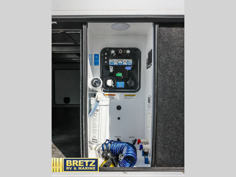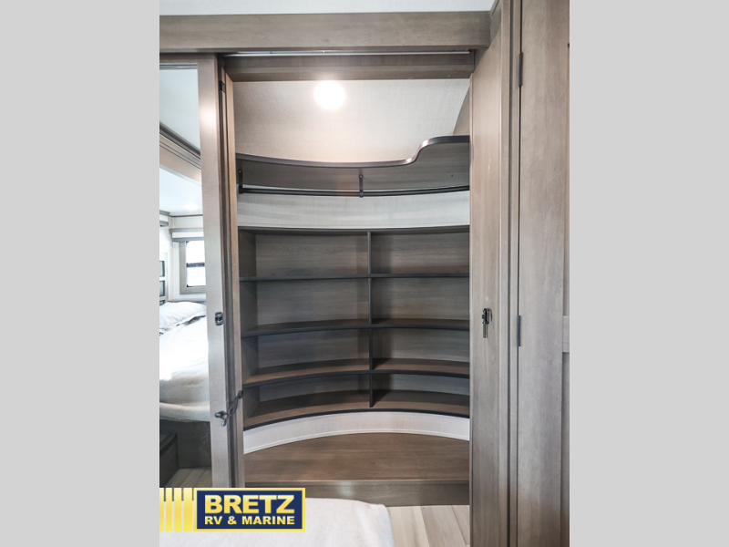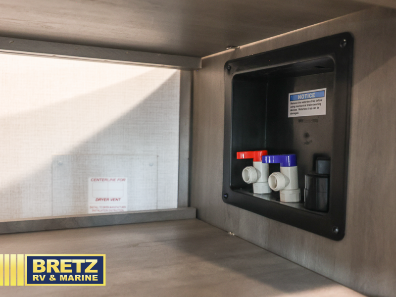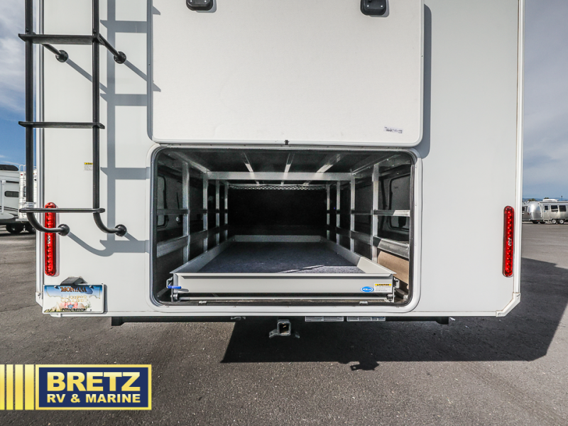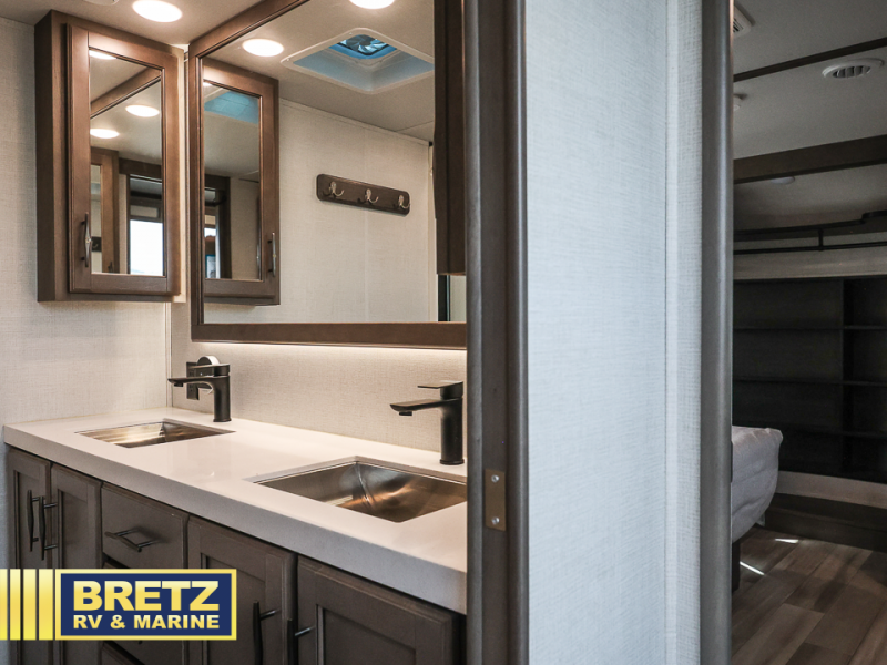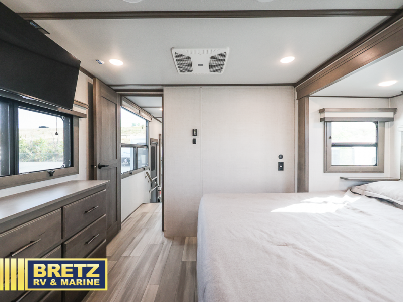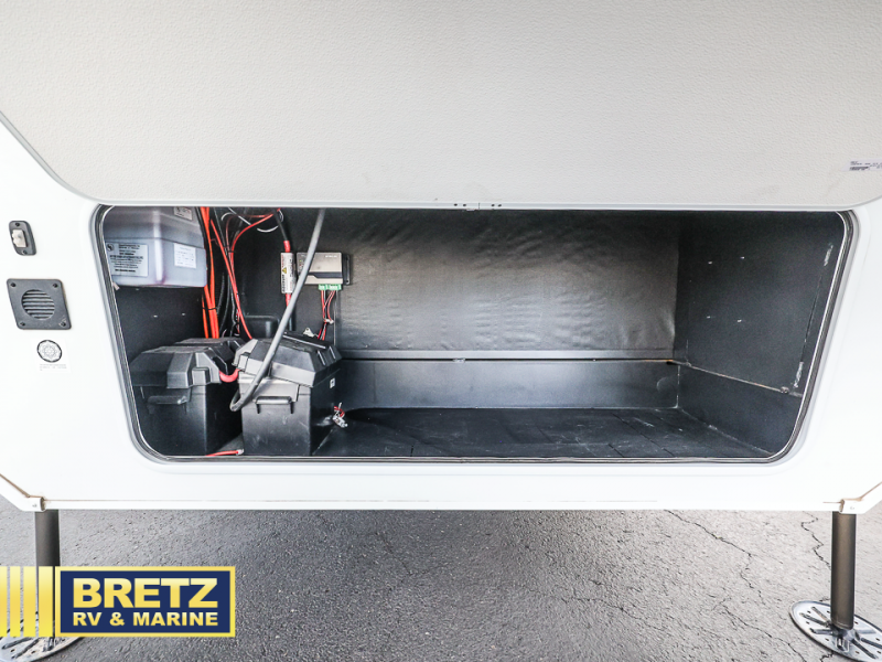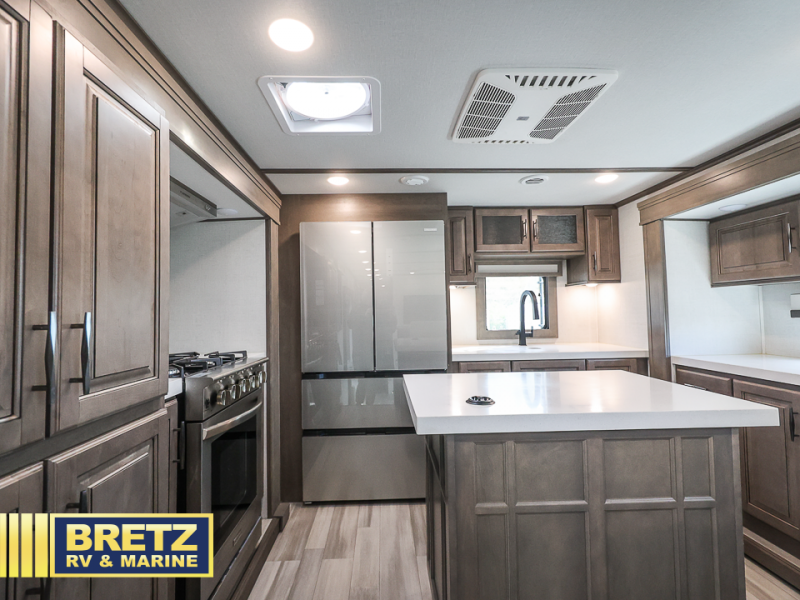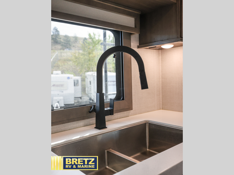 Enjoy each and every vacation, month-long trips, or even extended stays at an RV park in this spacious fifth wheel! The raised rear kitchen gives the cook plenty of room to whip up any type of meal using the stainless steel appliances including a 24" residential oven, an oversized pantry, and the raised bar top will provide you even more counter space on top of dining with two chairs that overlook the middle living area. Relaxing is made easy thanks to two tri-fold sofas and theatre seating while watching the big game on the LED Smart TV and enjoying the fireplace below. Dual sinks in the full bathroom allow two people to easily get ready at once, and the flip up teak seat in the shower is a nice convenience. At night, retire to your own queen bed which slides out to provide more floor space, and enjoy a show on the LED TV above the flip-top dresser once in bed.