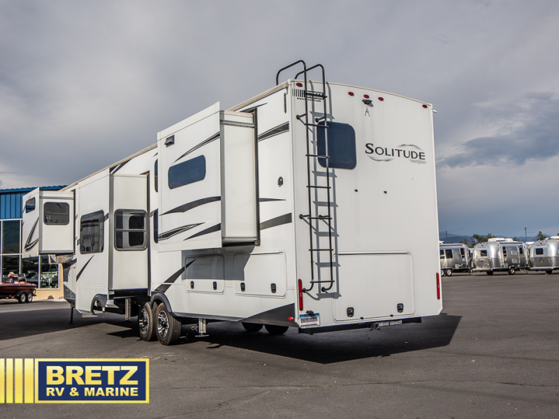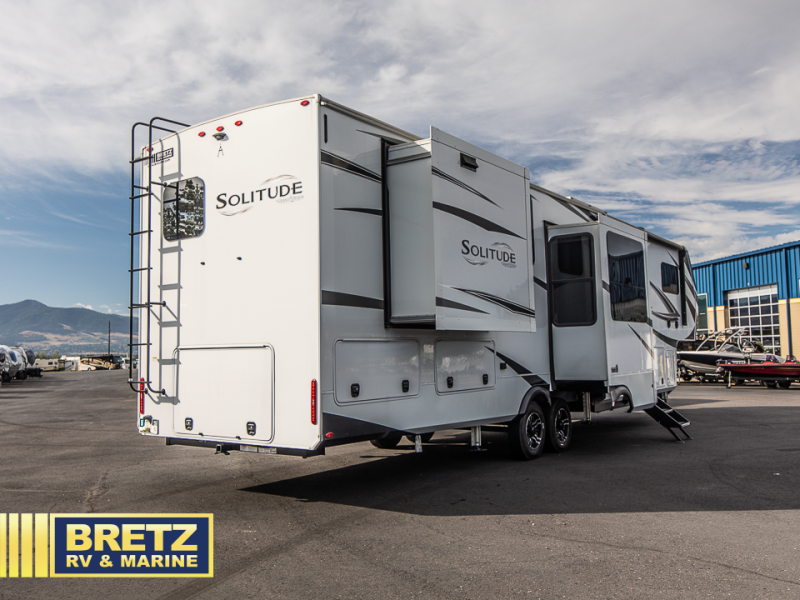 Each Solitude fifth wheel by Grand Design features a 101" wide-body construction, heavy duty 7,000 lb. axles, frameless tinted windows, and high-gloss gel coat sidewalls. You can camp year around thanks to the Weather-Tek Package that includes a 35K BTU high-capacity furnace, an all-in-one enclosed and heated utility center, and a fully enclosed underbelly with heated tanks and storage. Inside, you'll love the premium roller shades, hardwood cabinet doors, solid surface countertops and sinks, plus residential finishes throughout to make you truly feel at home. Each model also includes a MORryde CRE3000 suspension system, self adjusting brakes, and a MORryde pin box that will provide smooth towing from home to campground. Affordable luxury is possible with the Solitude fifth wheels; choose yours today!