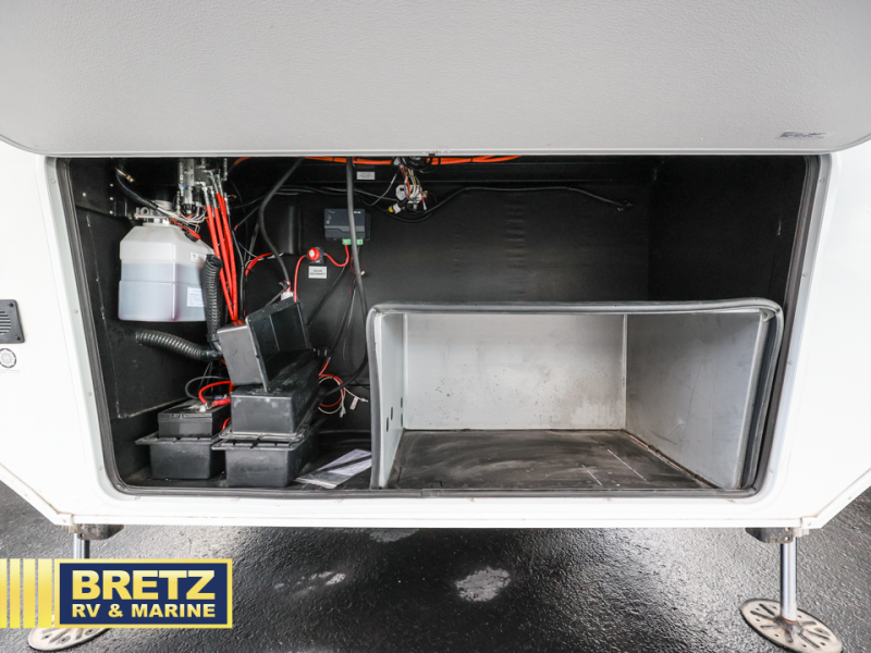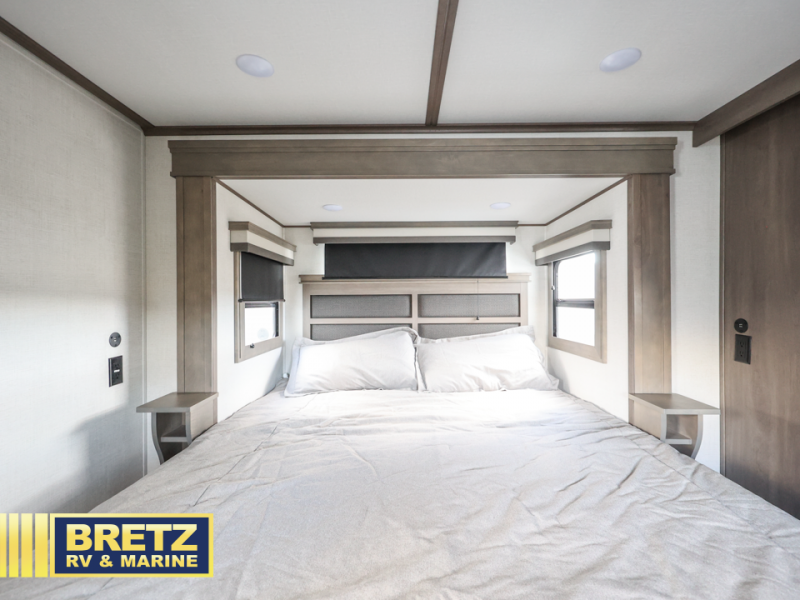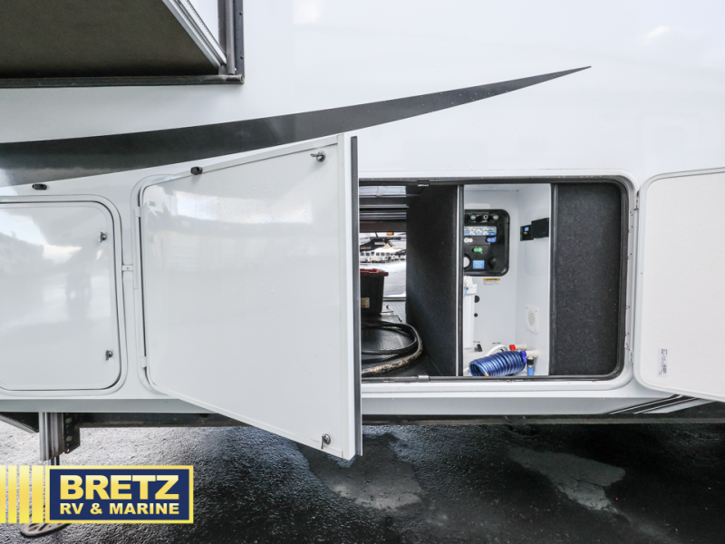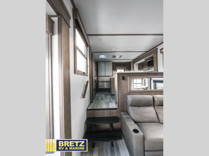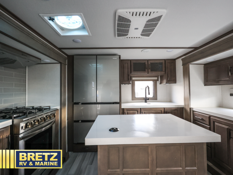 Enjoy each and every vacation, month-long trips, or even extended stays at an RV park in this spacious fifth wheel! The raised rear kitchen gives the cook plenty of room to whip up any type of meal using the stainless steel appliances including a 24" residential oven, an oversized pantry, and the raised bar top will provide you even more counter space on top of dining with two chairs that overlook the middle living area. Relaxing is made easy thanks to two tri-fold sofas and theatre seating while watching the big game on the LED Smart TV and enjoying the fireplace below. Dual sinks in the full bathroom allow two people to easily get ready at once, and the flip up teak seat in the shower is a nice convenience. At night, retire to your own queen bed which slides out to provide more floor space, and enjoy a show on the LED TV above the flip-top dresser once in bed.