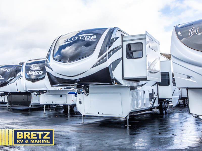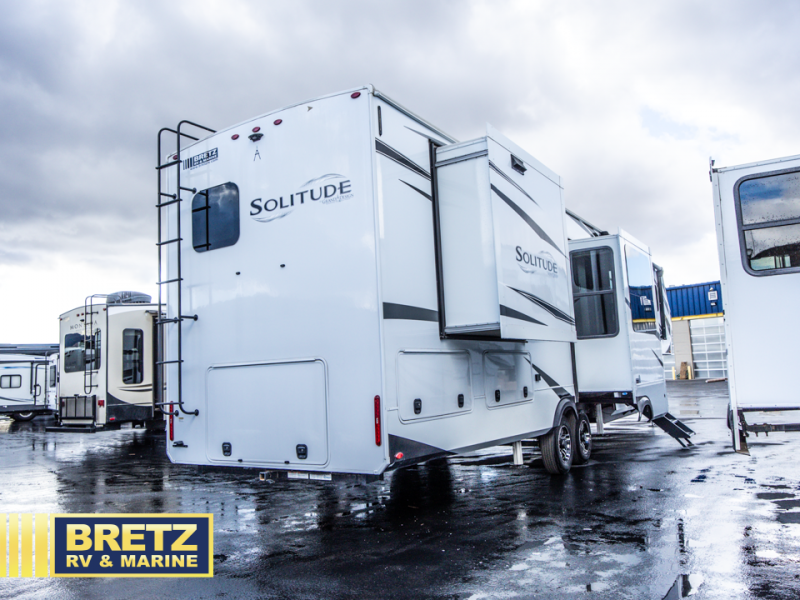 Each Solitude fifth wheel by Grand Design features a 101" wide-body construction, heavy duty 7,000 lb. axles, frameless tinted windows, and high-gloss gel coat sidewalls. You can camp year around thanks to the Weather-Tek Package that includes a 35K BTU high-capacity furnace, an all-in-one enclosed and heated utility center, and a fully enclosed underbelly with heated tanks and storage. Inside, you'll love the premium roller shades, hardwood cabinet doors, solid surface countertops and sinks, plus residential finishes throughout to make you truly feel at home. Each model also includes a MORryde CRE3000 suspension system, self adjusting brakes, and a MORryde pin box that will provide smooth towing from home to campground. Affordable luxury is possible with the Solitude fifth wheels; choose yours today!