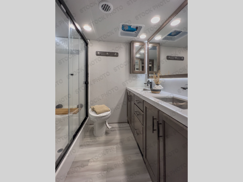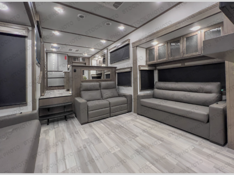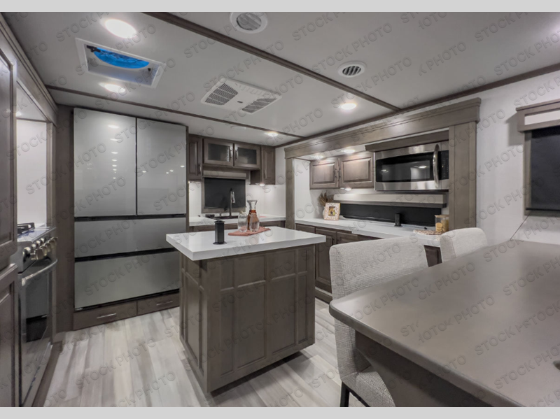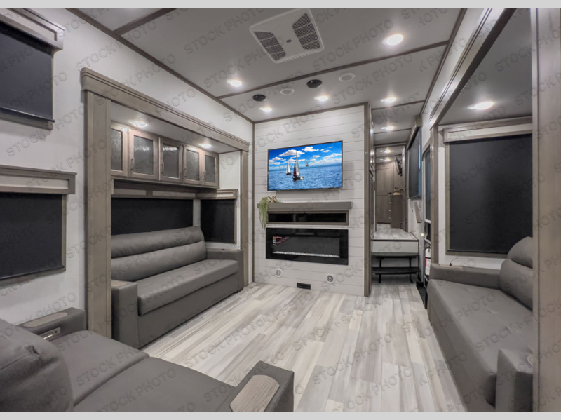 Enjoy each and every vacation, month-long trips, or even extended stays at an RV park in this spacious fifth wheel! The raised rear kitchen gives the cook plenty of room to whip up any type of meal using the stainless steel appliances including a 24" residential oven, an oversized pantry, and the raised bar top will provide you even more counter space on top of dining with two chairs that overlook the middle living area. Relaxing is made easy thanks to two tri-fold sofas and theatre seating while watching the big game on the LED Smart TV and enjoying the fireplace below. Dual sinks in the full bathroom allow two people to easily get ready at once, and the flip up teak seat in the shower is a nice convenience. At night, retire to your own queen bed which slides out to provide more floor space, and enjoy a show on the LED TV above the flip-top dresser once in bed.