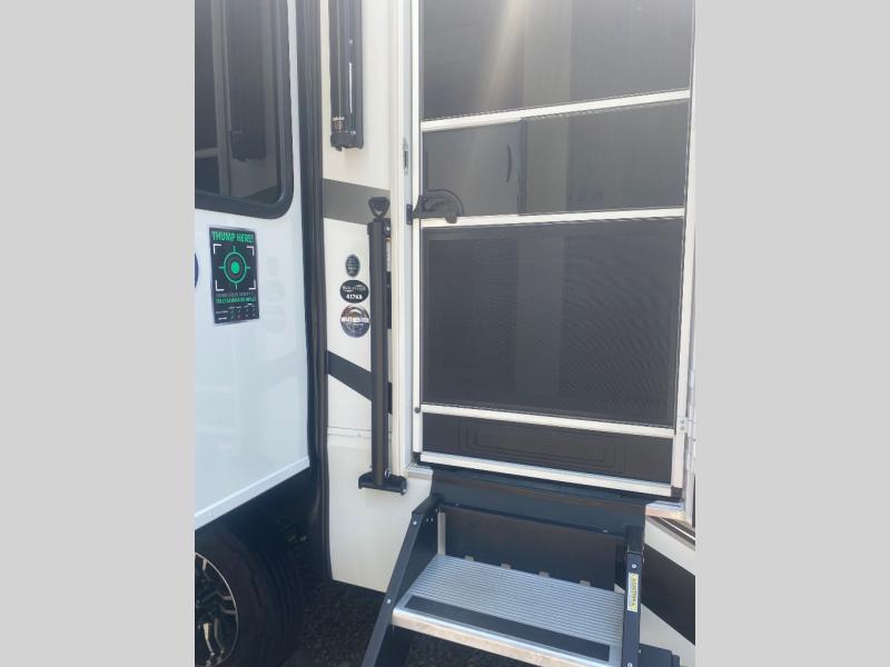 Comfort will come easy in this four slide out fifth wheel! You will feel right at home with a master bedroom that includes a queen bed slide out (king bed optional), dual dressers with a seat in between, plus a large front bath with tons of space. The convenient half bath is right as you enter the unit, and there is even shoe storage to keep your space tidy. Your crew can get cozy on the dual tri-fold sofas within dual opposing slides, or on the theater seating across from the LED TV and fireplace. One feature you will love about this fifth wheel is the rear kitchen with wrap-around counter space, a 24" residential oven, plus a 10 cu. ft. 12V refrigerator and a large pantry to keep food fresh.