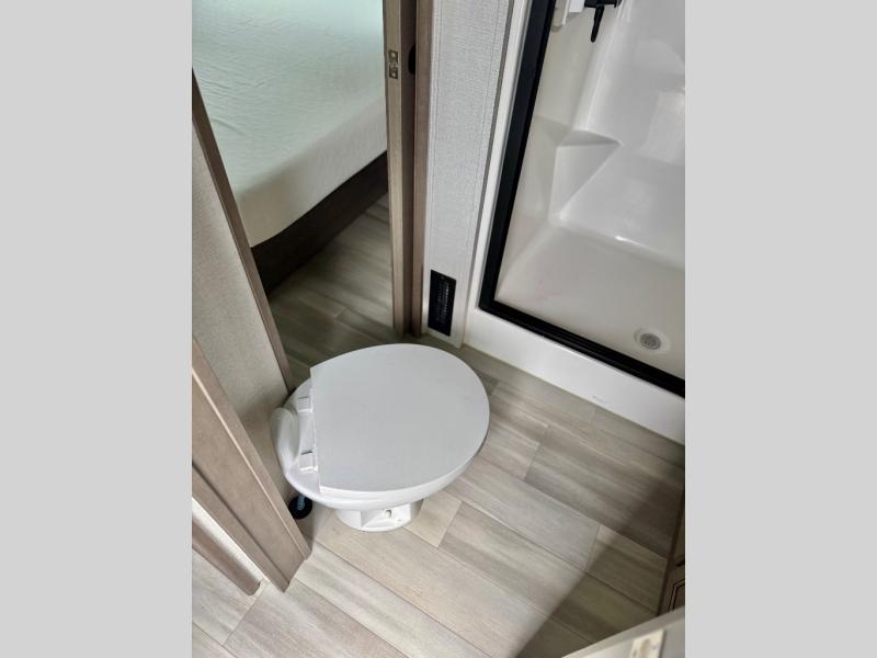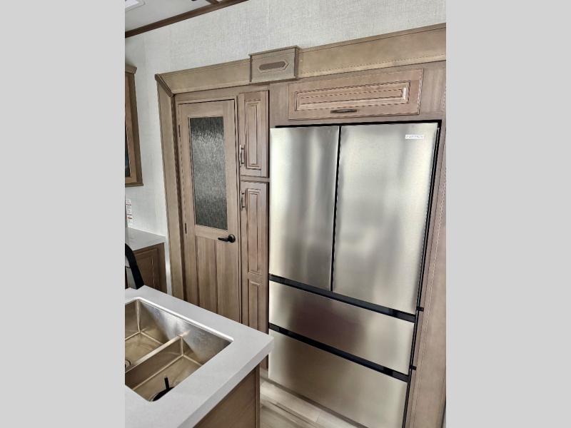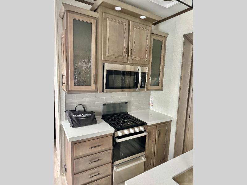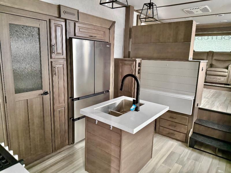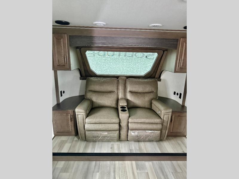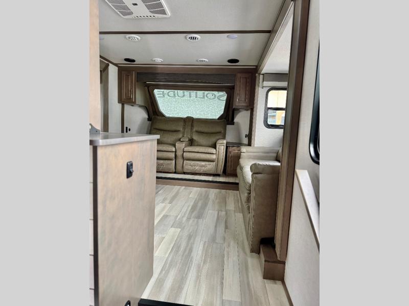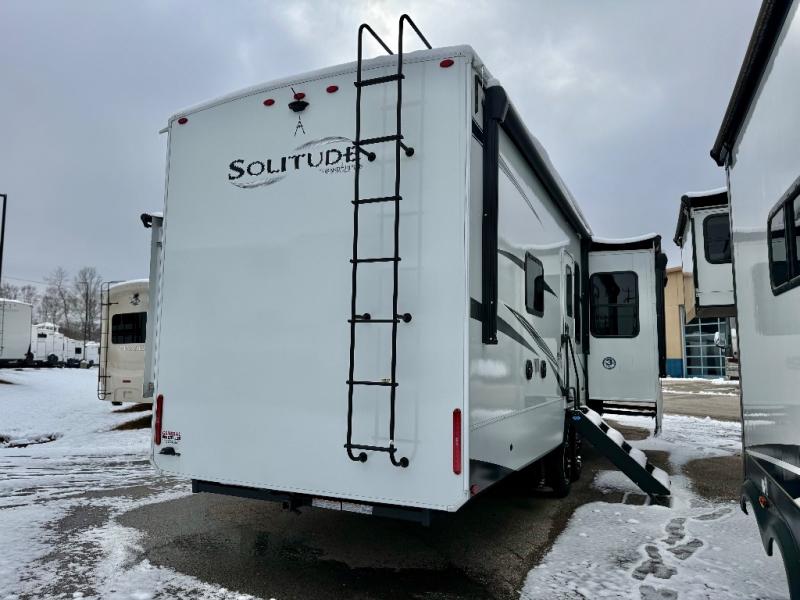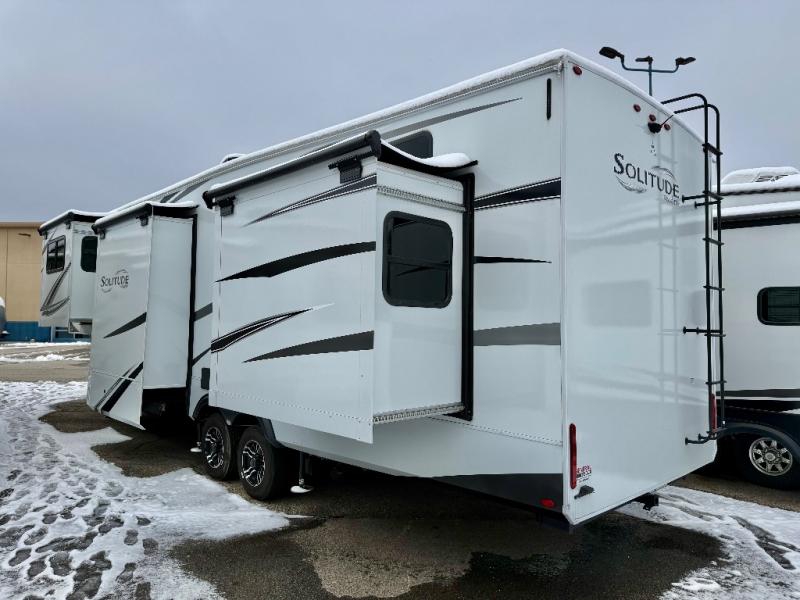 With any Solitude S-Class fifth wheel by Grand Design you will appreciate the Max Built Construction Package that features a 101" wide-body, gel coat exterior sidewalls, heavy-duty 7,000 lb. axles, plus many more durable construction materials. The self-adjusting brakes and the MORryde CRE3000 suspension system will provide a smooth towing experience, and each model includes heavy duty 17.5" H-rated tires with NitroFill. Some of the features you are sure to love are included in the Residential Living Package, like the solid surface countertops and sink covers, the hardwood cabinet doors, the night stands with USB ports, and the Rockford Fosgate stereo entertainment system with HDMI and App controls. These fifth wheels are extended-stay approved thanks to the Weather-Tek Package with a 35,000 BTU high-capacity furnace, the Stealth A/C system, and many high-end residential finishes to make you feel like you taken home with you!