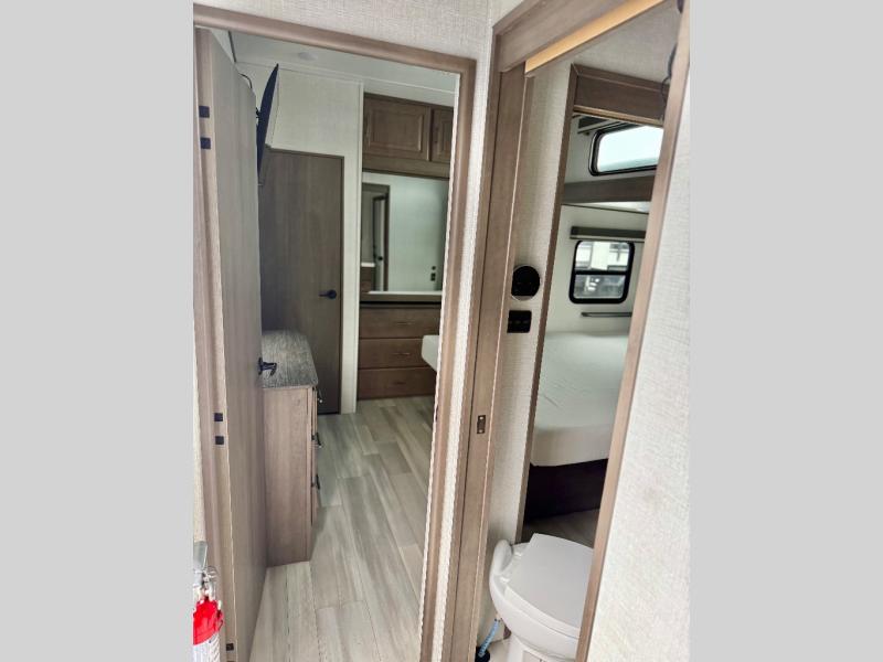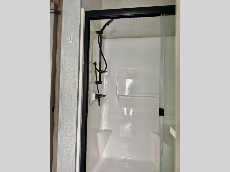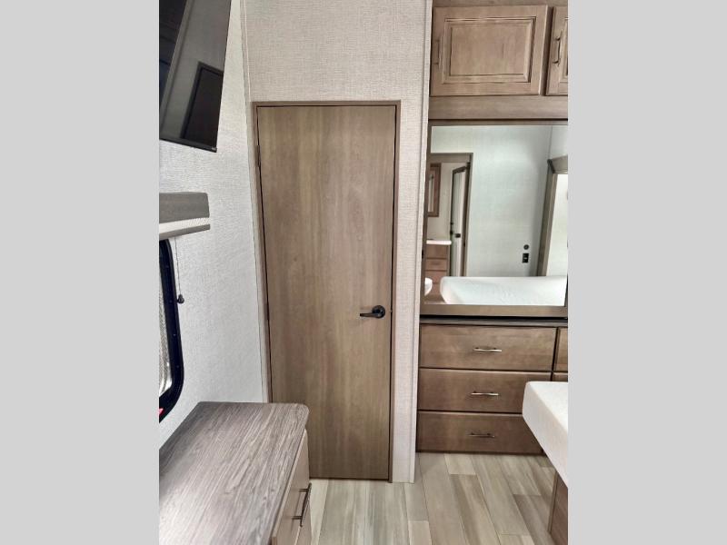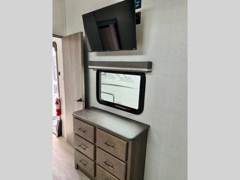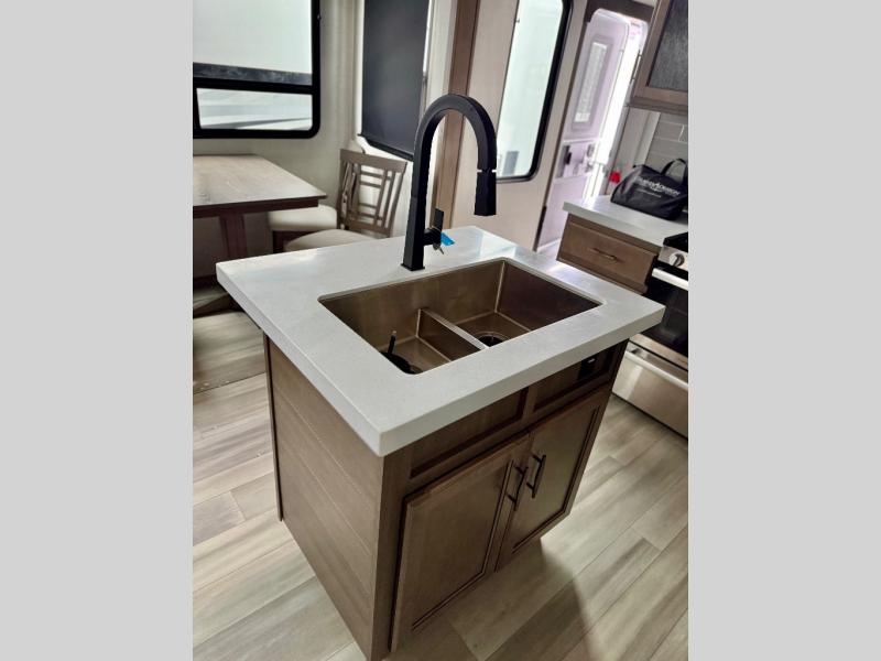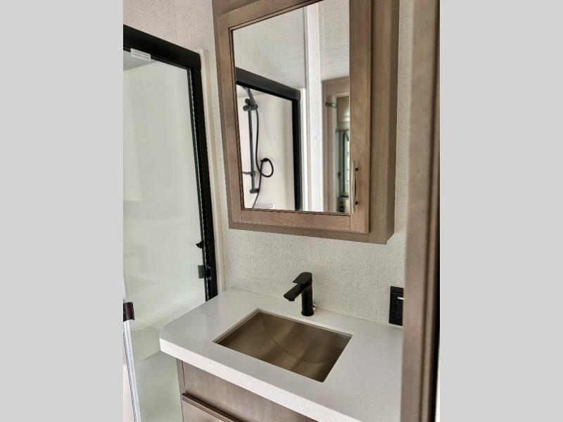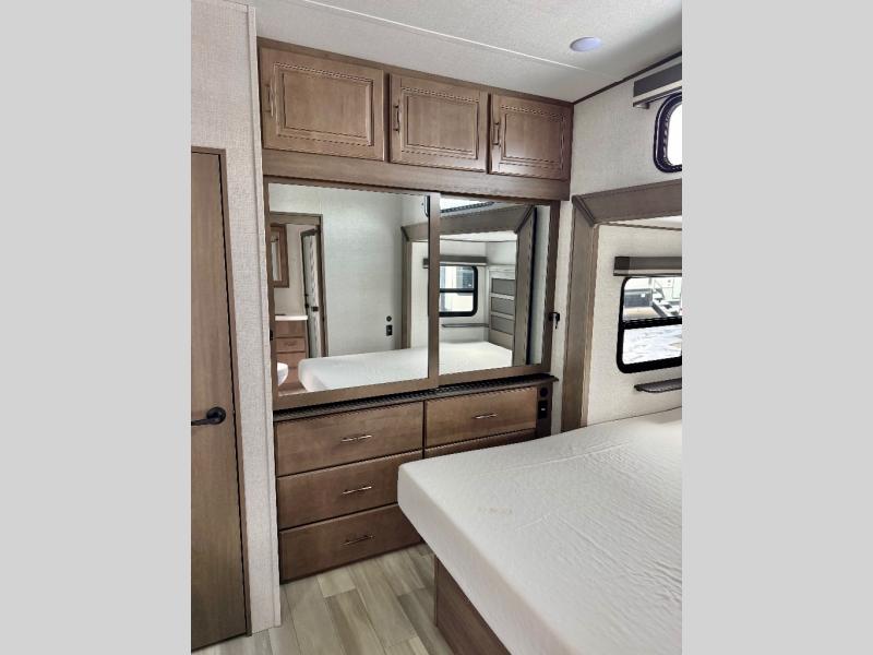 This Solitude S-Class unit is the perfect choice for a couple that enjoys traveling with guests thanks to the dual tri-fold sofas in the front living area that offer added sleeping space for four more campers! This will be a great space to all gather for movies or just hanging out with theater seating and a fireplace beneath the telescoping TV. Step down from the front living area to a spacious kitchen with dual slides. You will find ample counter space with the added island, plus two flip-up countertop areas. A free standing dinette is perfect for meals or game time as well. Head toward the rear of the unit for a quite retreat to the master bedroom with queen bed slide. A king-sized bed option can be chosen if you prefer a bit more room in bed. A dual entry bath features a sunken shower with skylight, plus vanity with sink and medicine cabinet for your toothbrushes and more. The bedroom also provides a dresser with TV prep above, and closet space along the rear wall with drawers beneath for more storage. One portion of the closet has been prepped for a washer/dryer if you choose to add that convenience.