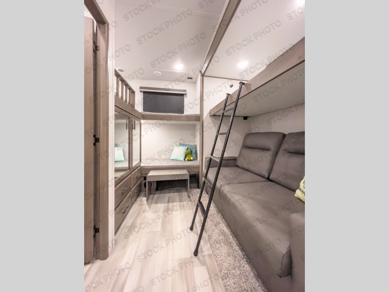 Wow! Check out this fifth wheel with dual entry doors, a private bunkhouse suite, two power awnings, and tons of interior space thanks to the four slide outs! Your guests will have three bunks in the bunkhouse, a tri-fold sofa, plus a convenient half bath with its own exterior entry door. Make yourself at home in the front private bedroom that includes a queen bed that can be optioned out for a king bed, a dresser with an LED TV, plus a large front closet with washer and dryer prep. And don't overlook the main living area/kitchen with theatre seating with USB ports, a kitchen island, plus an LED TV and a fireplace!