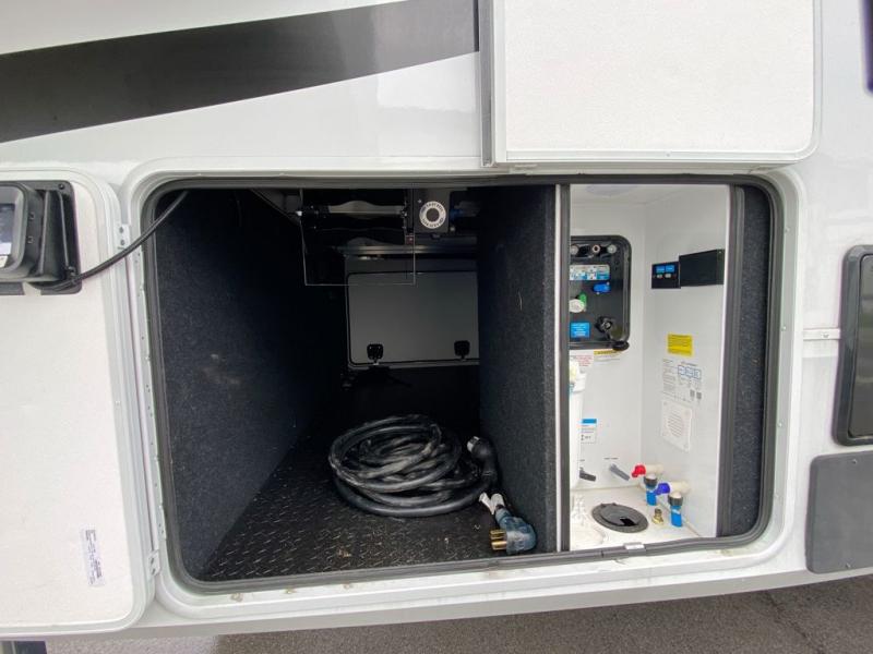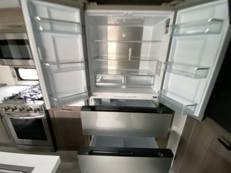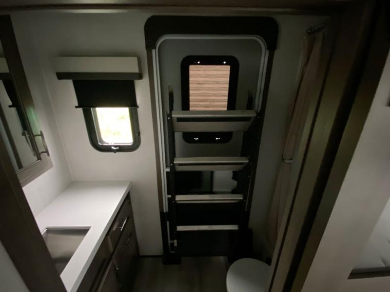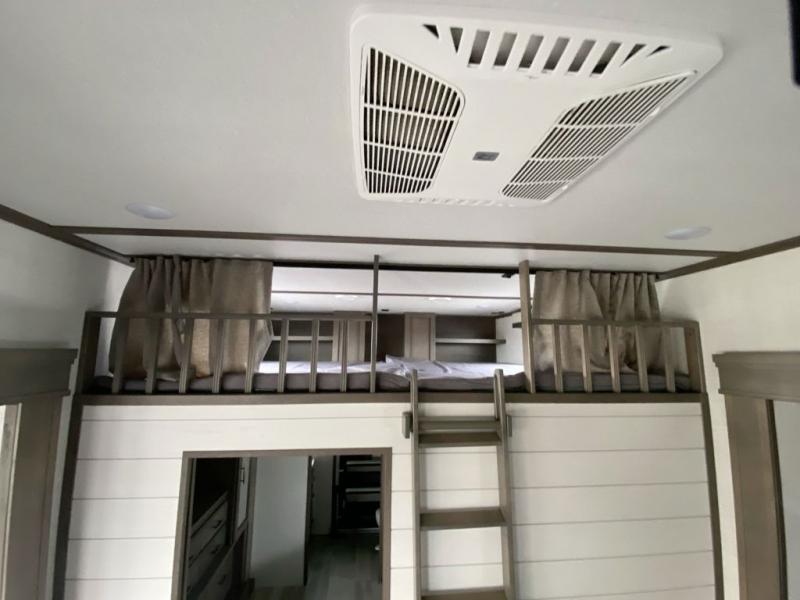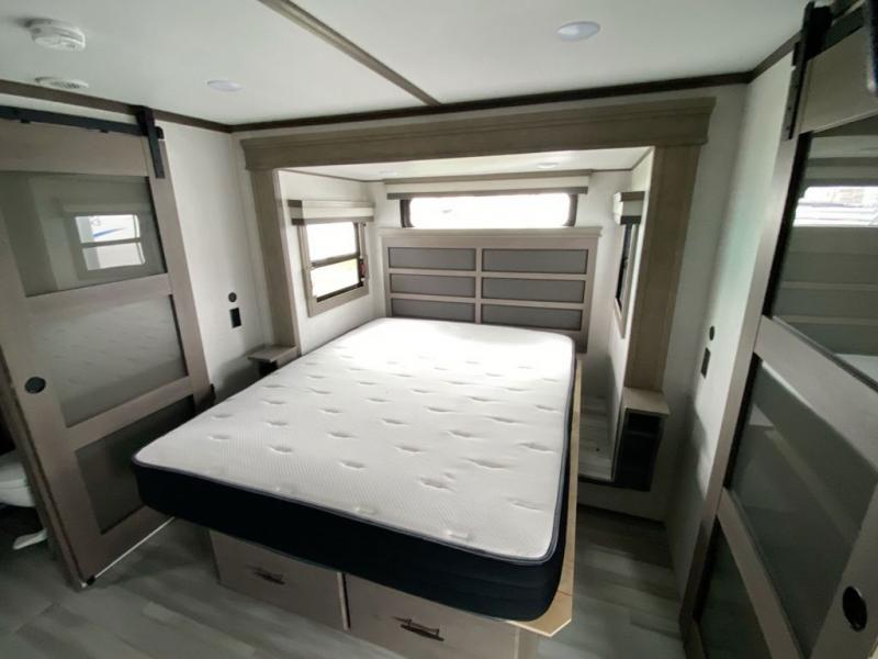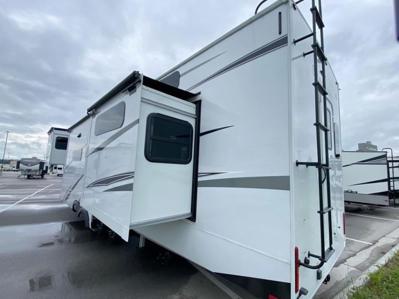 For an affordable luxury extended stay for your family, this Solitude is it! Two private bedrooms plus an overhead Sky Suite loft above the rear bedroom which also has it's own private rear entry/exit door is just the beginning of what is in store for your camping convenience. You will love the spacious feel that the Solitude provides with taller ceilings, larger scenic windows, and an interior width of 8' 5", not to mention FIVE slides in this unit alone. You may not even want to go home once you get a look inside. The upscale kitchen features an island with dishwasher prep, a large single bowl sink, a 12V 20 cu. ft. refrigerator for your perishables, and a 24" residential oven, not to mention you will also enjoy a microwave, pantry, and hutch for your dishes, plus a free standing dinette! You can easily take along extra family and friends with the second private bedroom featuring it's own private bath and entry which is great for another couple, and there is even loft space above this rear private bedroom for added storage or sleeping for children. Both bathrooms feature a shower with a skylight, vanity and sink, plus a toilet. And, you will find ample storage for clothing and belongings throughout with nice size closets, overhead cabinets, plus loads of outside storage. Speaking of outside, this unit features a spray port for rinsing off before heading inside, two awnings, a USB charging outlet, and four step aluminum shock assist entry steps at both entrances.