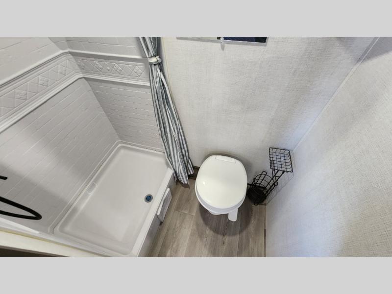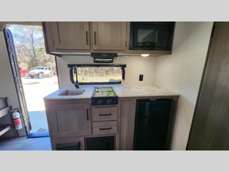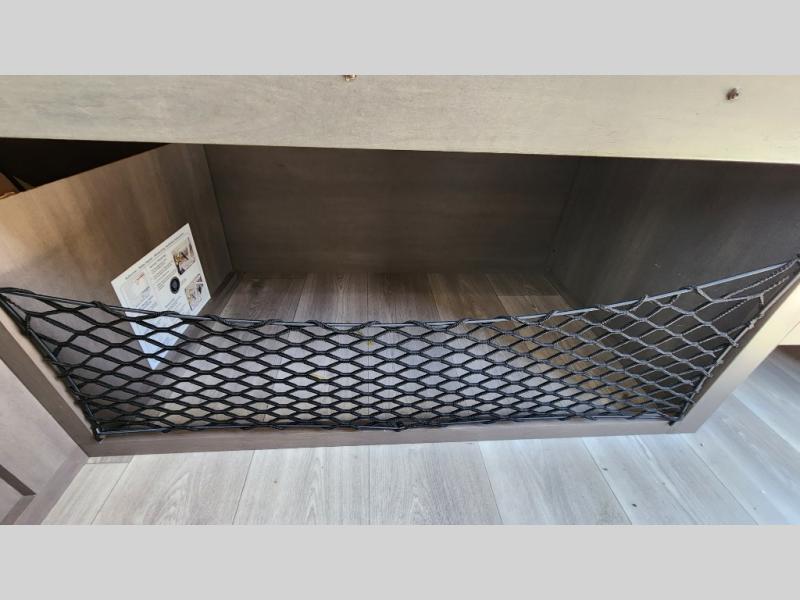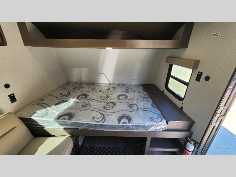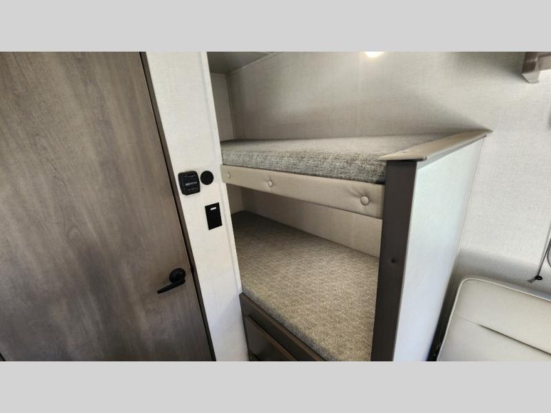 Camping trips to the lake have never been easier than with this travel trailer! The 28" x 67" bunks are right next to the private bath for easy nighttime use, and the front queen bed includes hidden storage for your things. There is also a 66" Jack knife sofa that provides a little more sleeping space for guests. A full kitchen lets you cook meals each day and there is an exterior LP quick connect if you want to fire up your own propane grill.